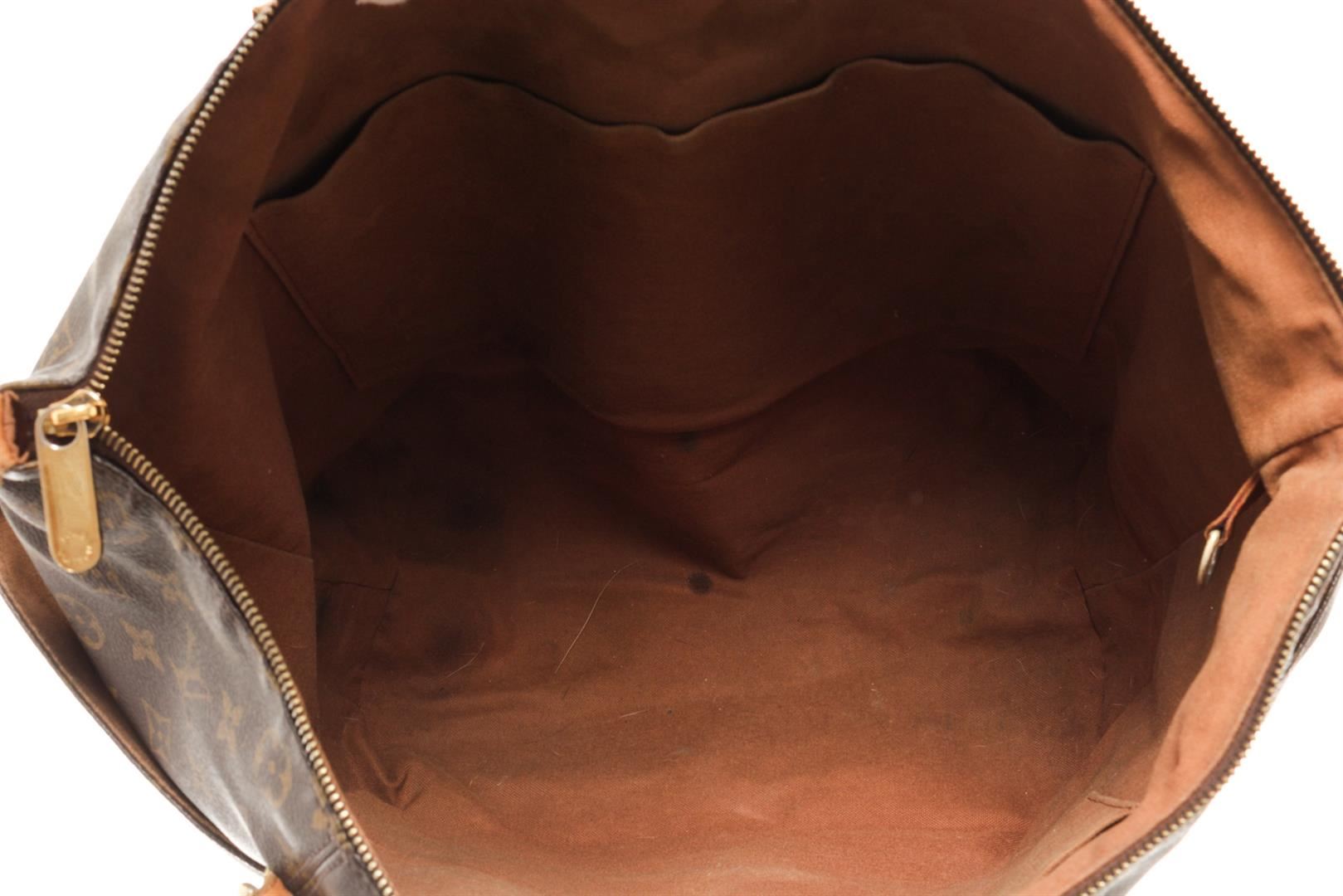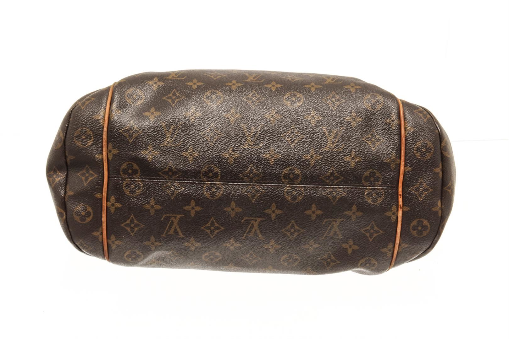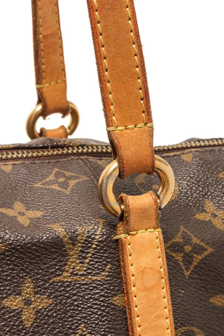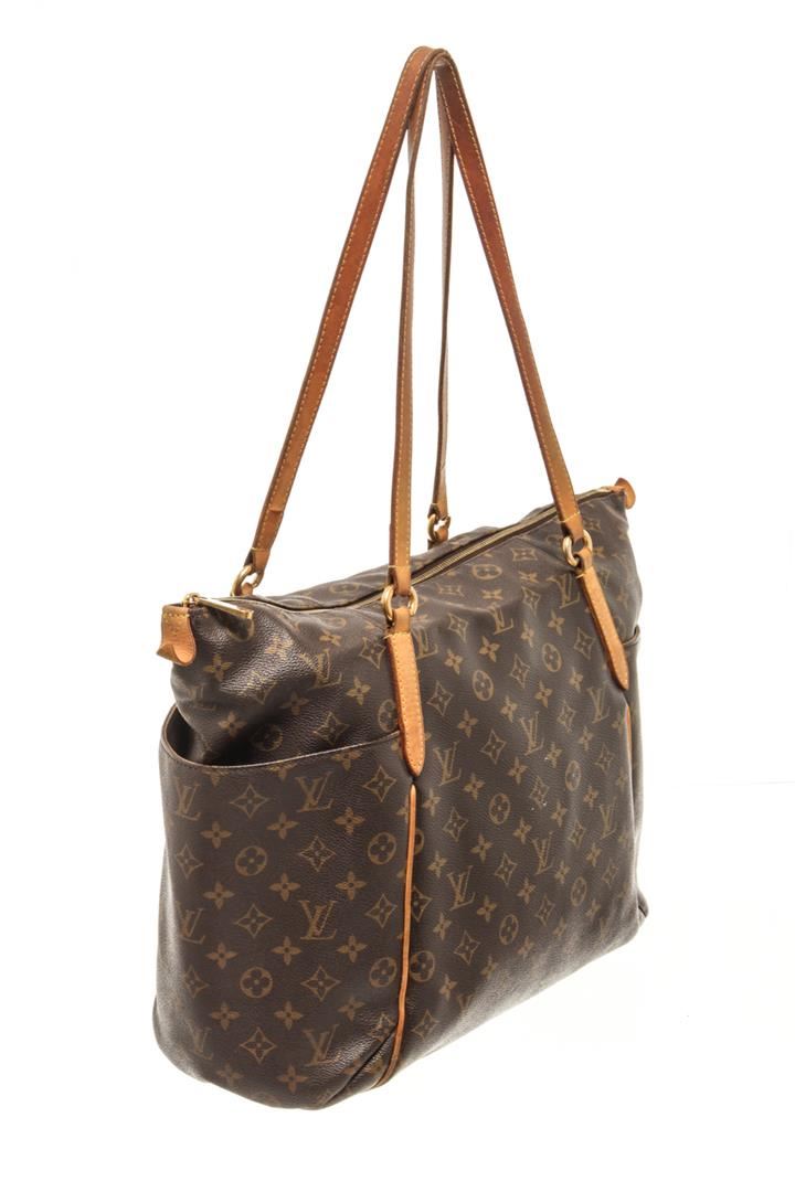 One Louis Vuitton Brown Monogram Canvas Totally GM Shoulder Bag. Item is sold AS-IS. All available information is listed in the description and shown in the photo. Louis Vuitton Brown Monogram Canvas Totally GM Shoulder Bag with brass hardware, tan vachetta leather trim, dual flat shoulder straps, dual exterior slit pockets at sides, brown woven interior lining, three interior slit pockets, zip closure at top. There are some stains on the lining. Please refer to photos. L 18" x H 13.5" x W 6.5" / 45.72 x 34.29 x 16.51 cm