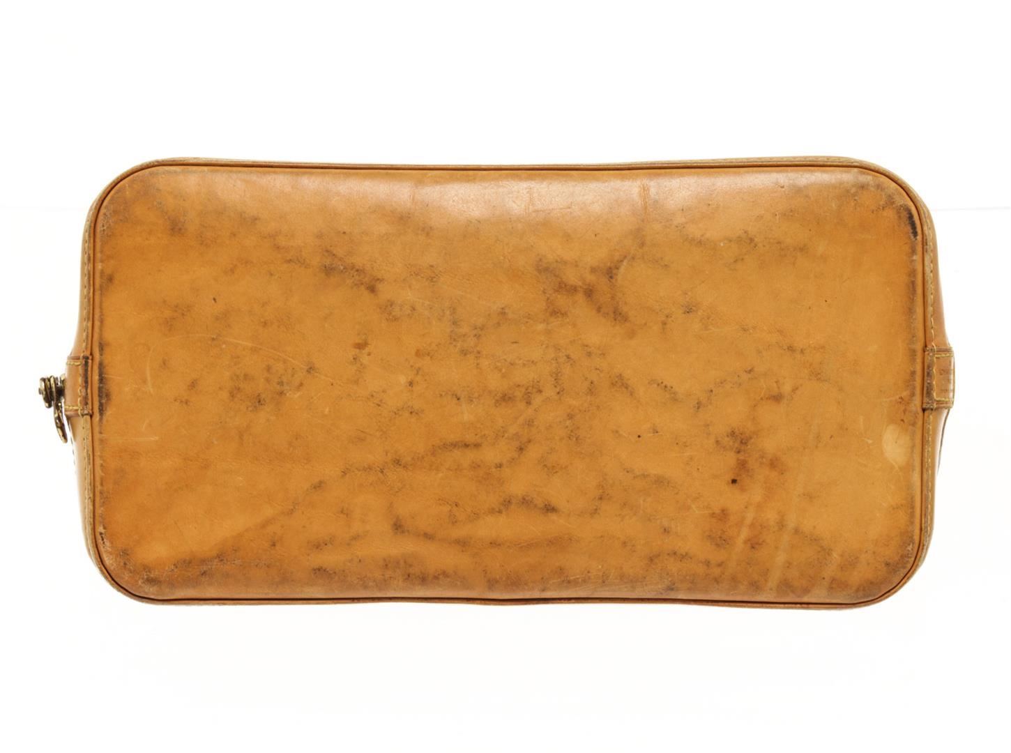 Louis Vuitton Brown Monogram Canvas and Leather Alma PM Bag. All available information is listed in the description and shown in the photos. louis vuitton brown monogram canvas and leather alma pm bag with constructed from monogram canvas and leather it displays dual handles at the top gold tone hardware and a padlock. the fabric lined interior of the bag is secured by a zipper closure at the top. Vachetta is worn, corner is stained, bottom is dirty, hardware is tarnished. Please refer to photos. Height: 25 cm Width: 16 cm Length: 31 cm / 9.84" x 6.29" x 12.20" Inches