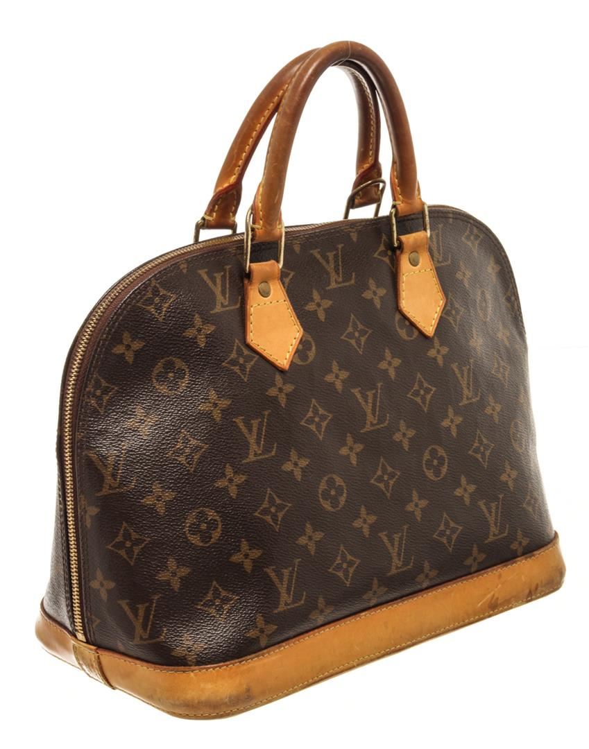 Louis Vuitton Brown Monogram Canvas and Leather Alma PM Bag. All available information is listed in the description and shown in the photos. louis vuitton brown monogram canvas and leather alma pm bag with constructed from monogram canvas and leather it displays dual handles at the top gold tone hardware and a padlock. the fabric lined interior of the bag is secured by a zipper closure at the top. Vachetta is worn, corner is stained, bottom is dirty, hardware is tarnished. Please refer to photos. Height: 25 cm Width: 16 cm Length: 31 cm / 9.84" x 6.29" x 12.20" Inches