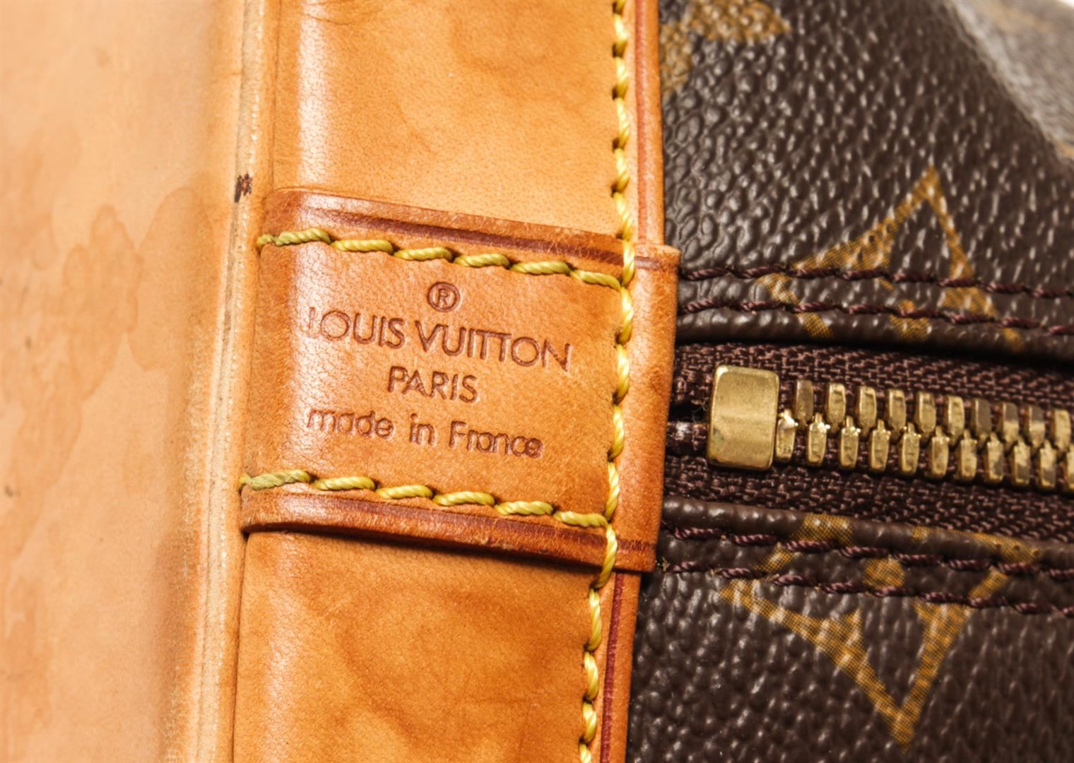 One Louis Vuitton Brown Monogram Canvas and Leather Alma PM Bag. Item is sold AS-IS. All available information is listed in the description and shown in the photo. louis vuitton brown monogram canvas and leather alma pm bag with constructed from monogram canvas and leather it displays dual handles at the top gold tone hardware and a padlock. the fabric lined interior of the bag is secured by a zipper closure at the top. Bottom of bag is worn, Height: 25 cm Width: 16 cm Length: 31 cm / 9.84" x 6.29" x 12.20" Inches