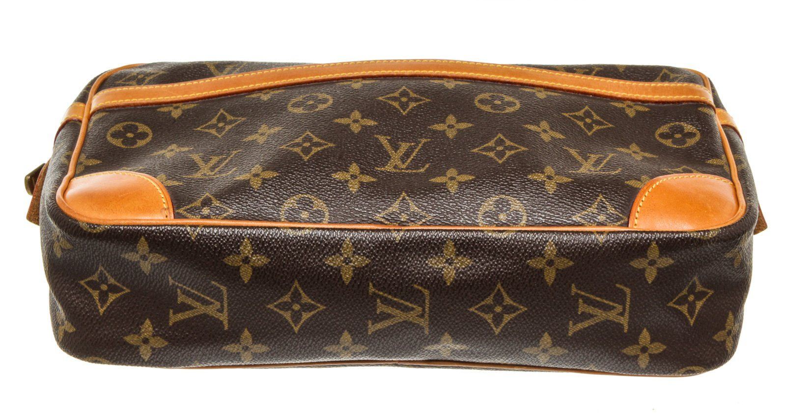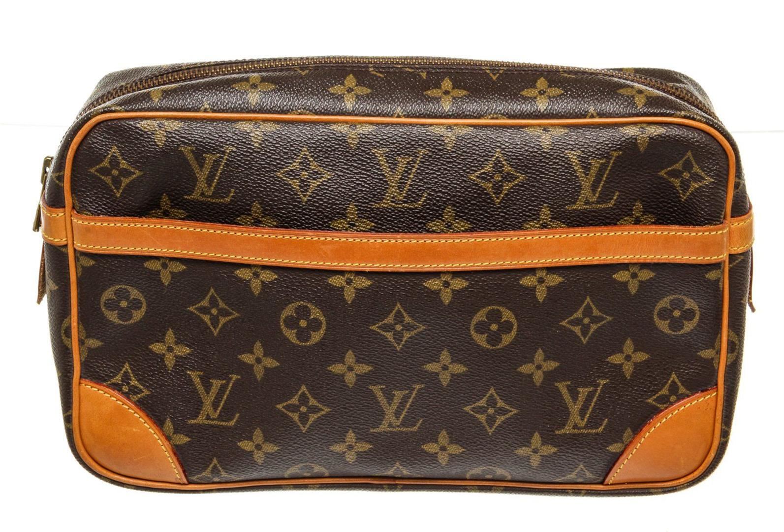 Louis Vuitton Brown Monogram Compiegne 28 Clutch Bag with monogram canvas, gold-tone hardware, trim tan vachetta leather, interior slip pockets and zipper closure.