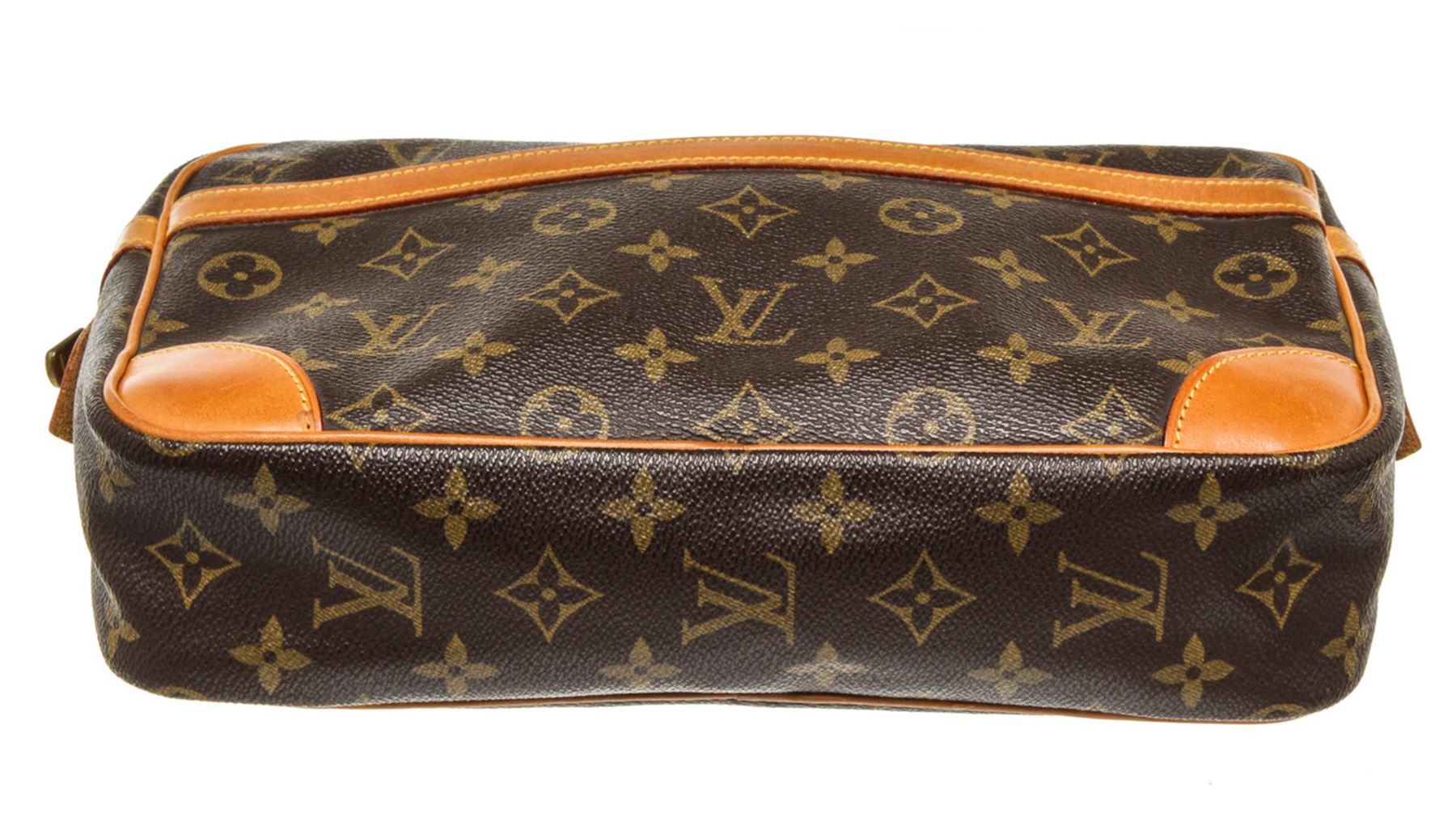 Louis Vuitton Brown Monogram Compiegne 28 Clutch Bag with monogram canvas, gold-tone hardware, trim tan vachetta leather, interior slip pockets and zipper closure.
