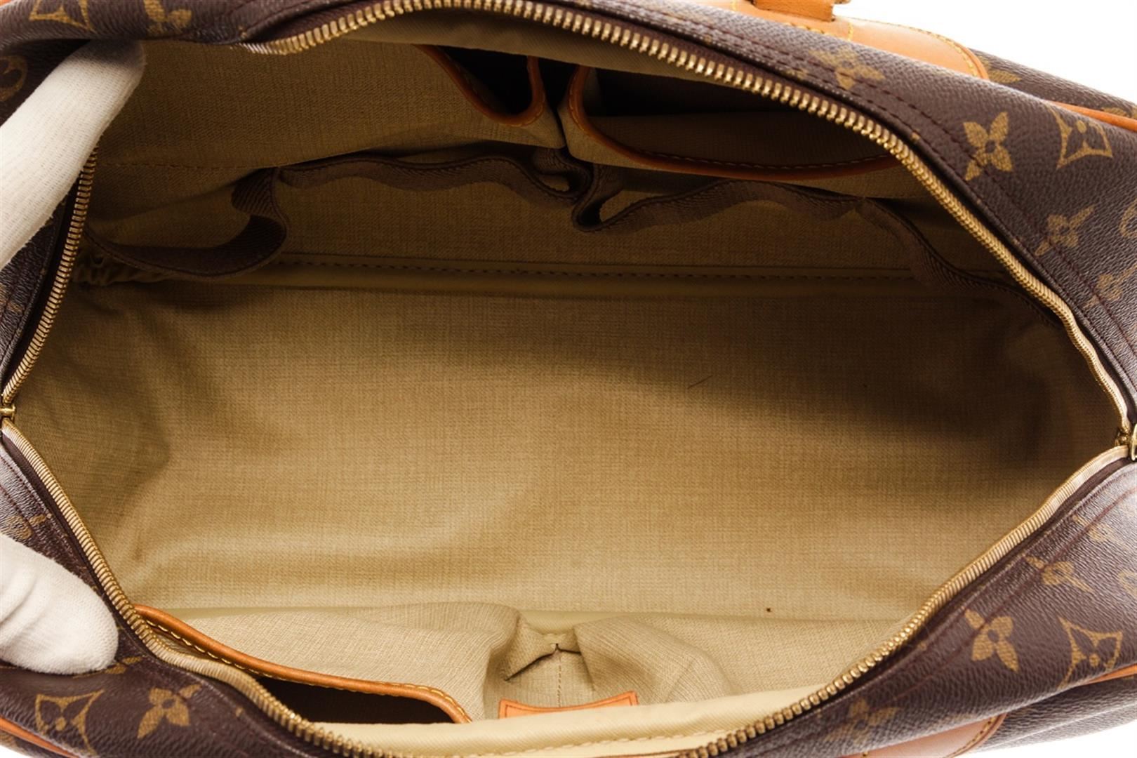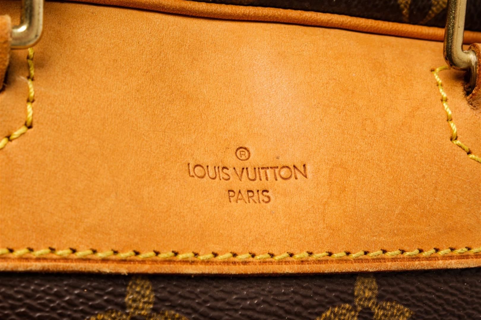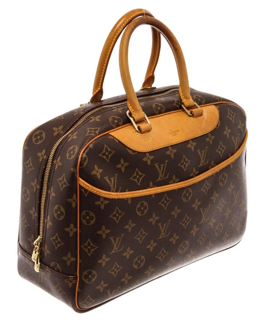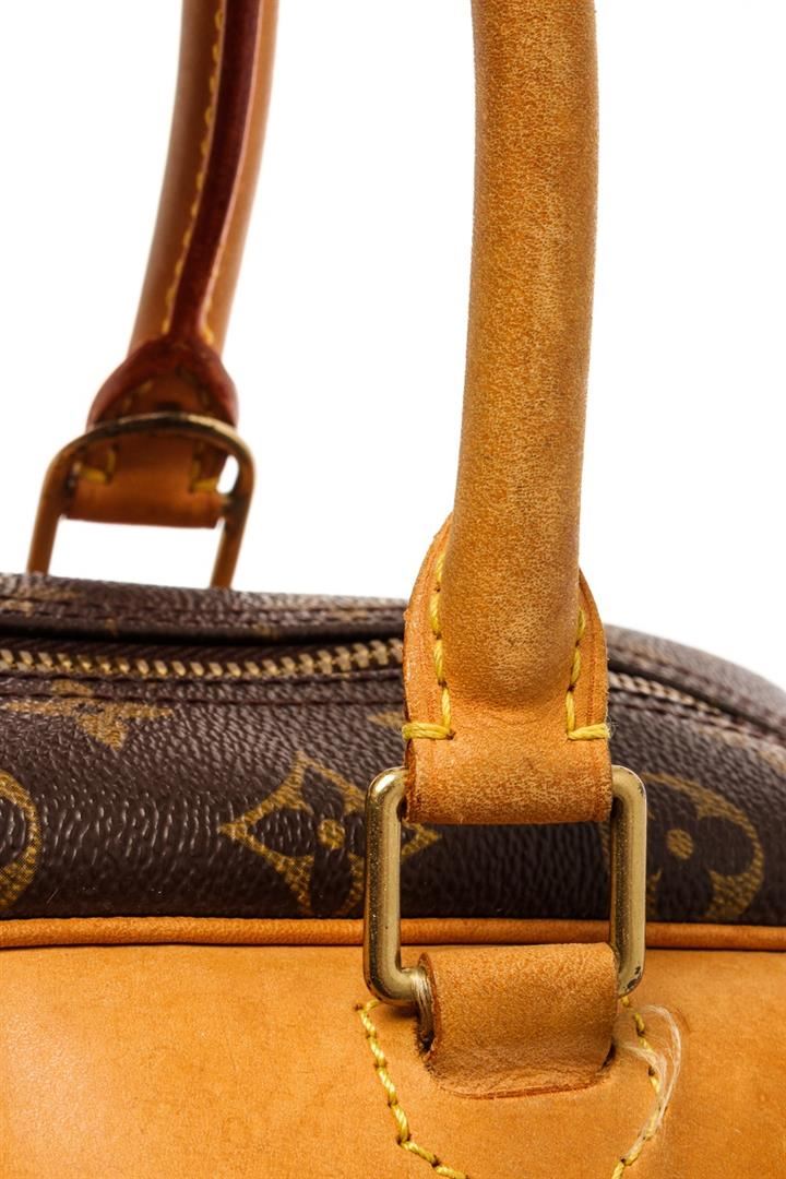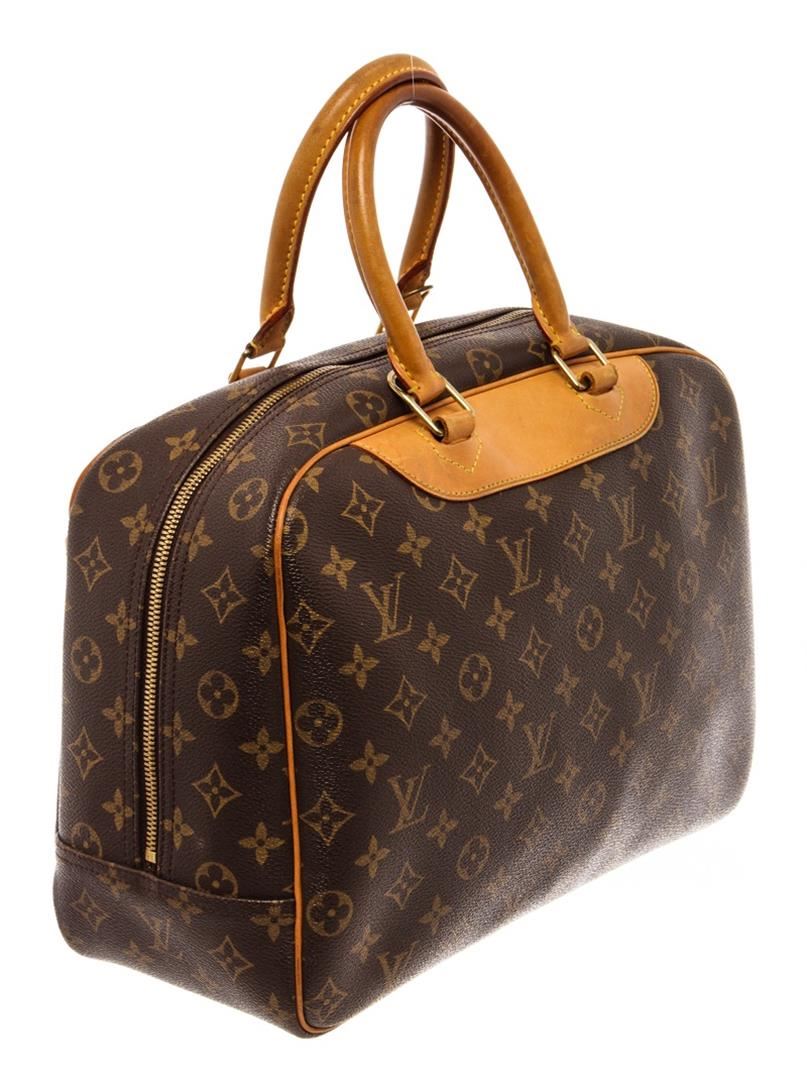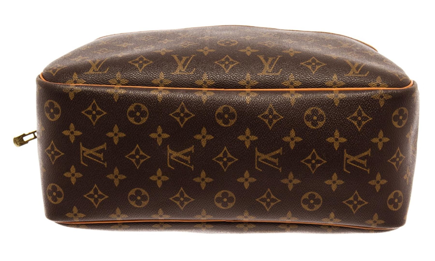 Louis Vuitton Brown Monogram Deauville Satchel Bag. All available information is listed in the description and shown in the photos. Louis Vuitton Brown Monogram Deauville Satchel Bag with vintage, brass hardware, leather trim, rolled handles, leather trim embellishment & single exterior pocket, canvas lining & four interior pockets, zip closure at top. Height: 11" Width: 14" Depth: 6", Handle Drop: 3.75" / 27.94 x 35.56 x 15.24 Cm