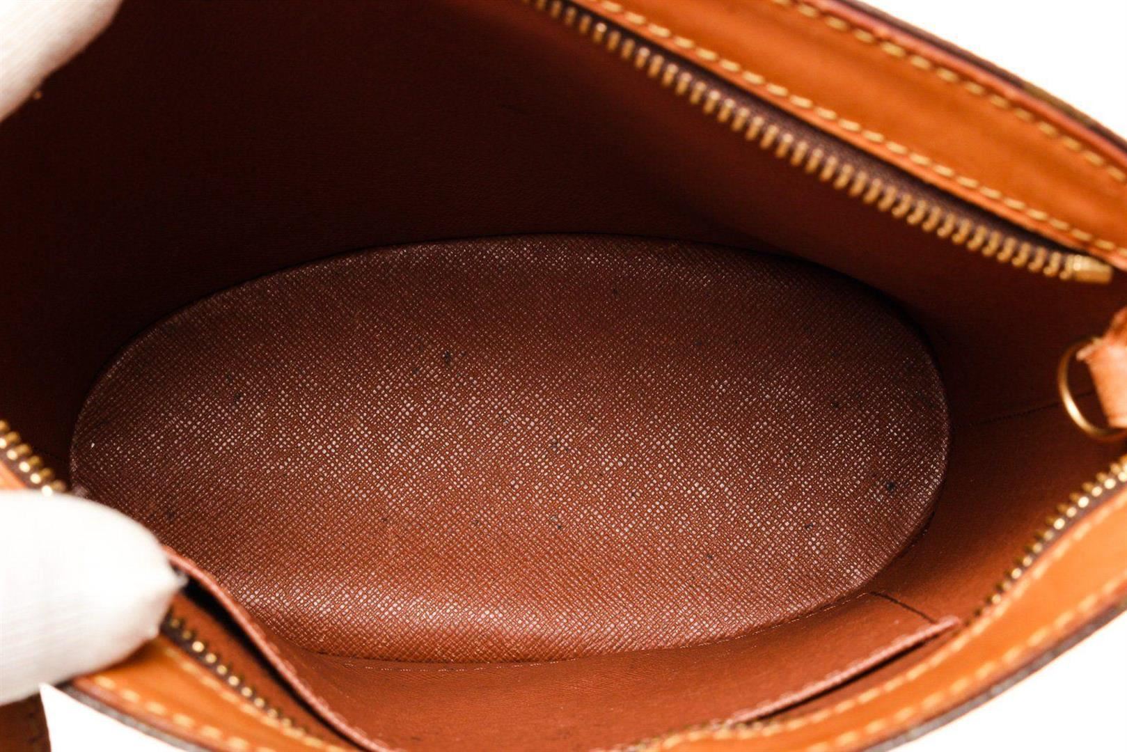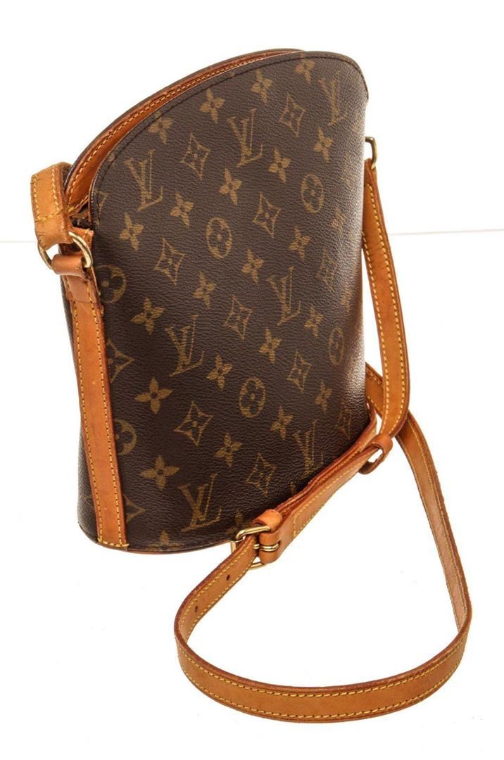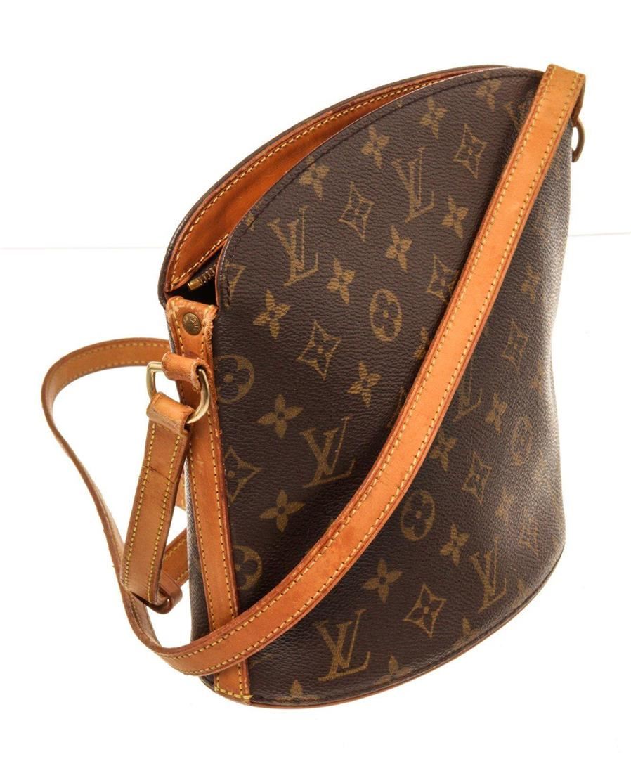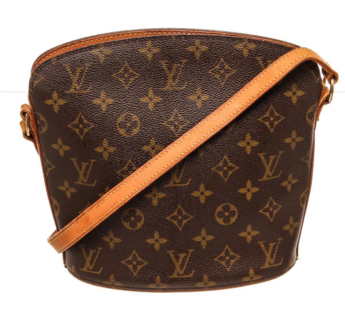 Louis Vuitton Brown Monogram Drouot Crossbody Bag with monogram canvas, gold-tone hardware, trim tan vachetta leather, interior slip pockets, shoulder strap and zipper closure.