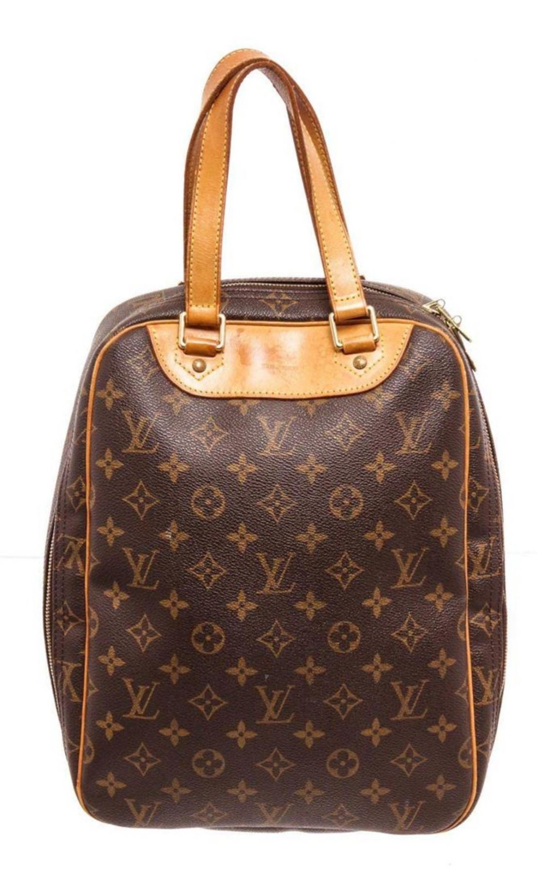 Louis Vuitton Brown Monogram Excursion Handbag. Louis Vuitton Brown Monogram Excursion Handbag with gold-tone hardware, monogram material, exterior zip pockets, tan vachetta leather trim, top handle, leather shoulder strap, and zipper closure. Measurem