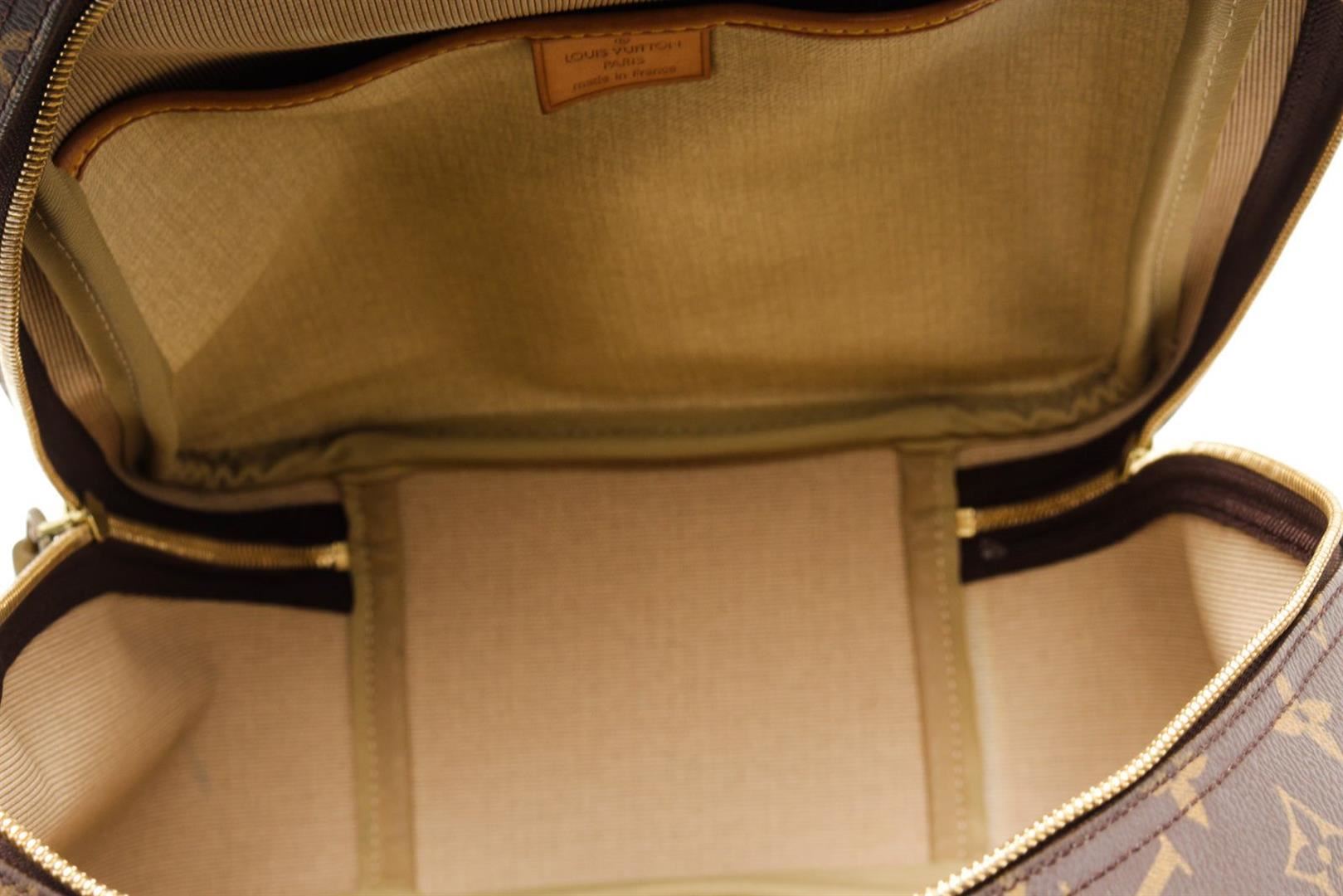 Louis Vuitton Brown Monogram Excursion Travel Bag with monogram canvas, gold-tone hardware, trim tan vachetta leather, interior slip pockets, canvas lining, adjustable, dual top handle and zipper closure.