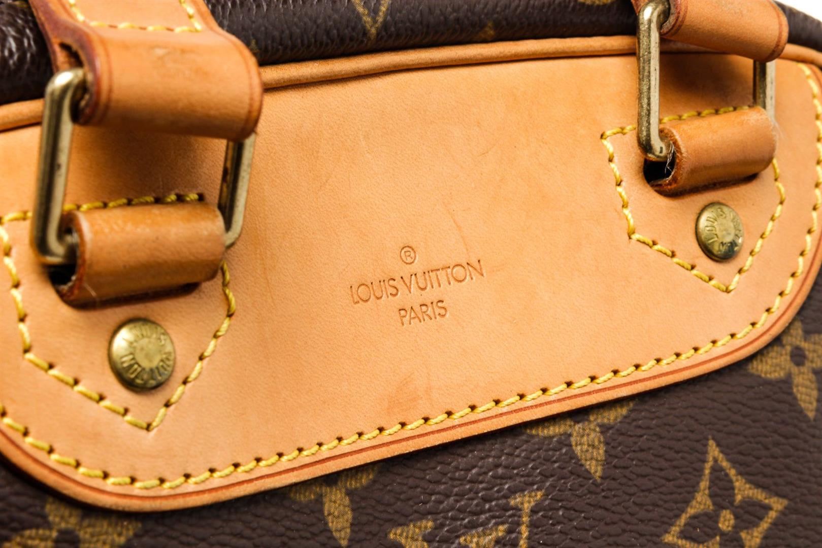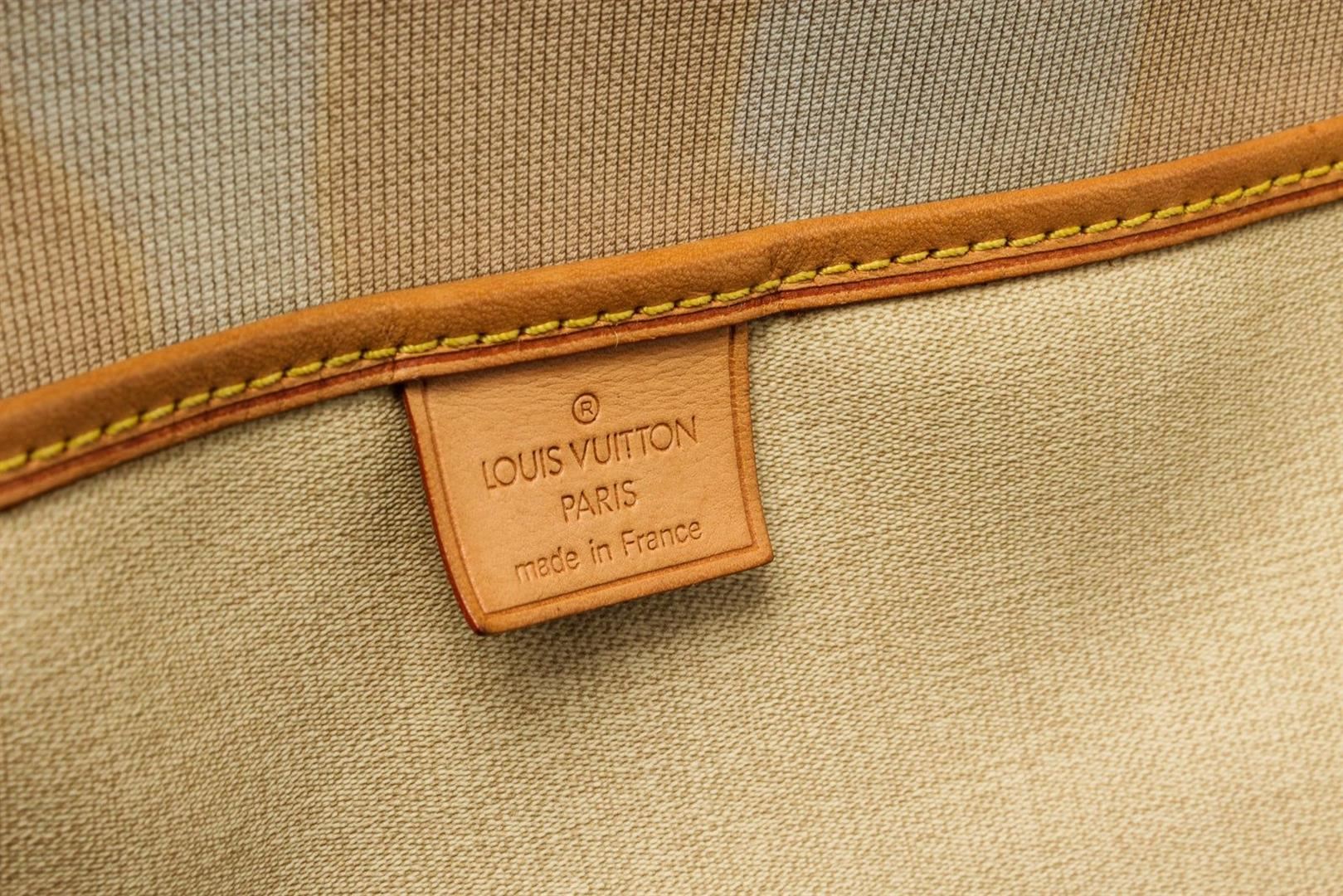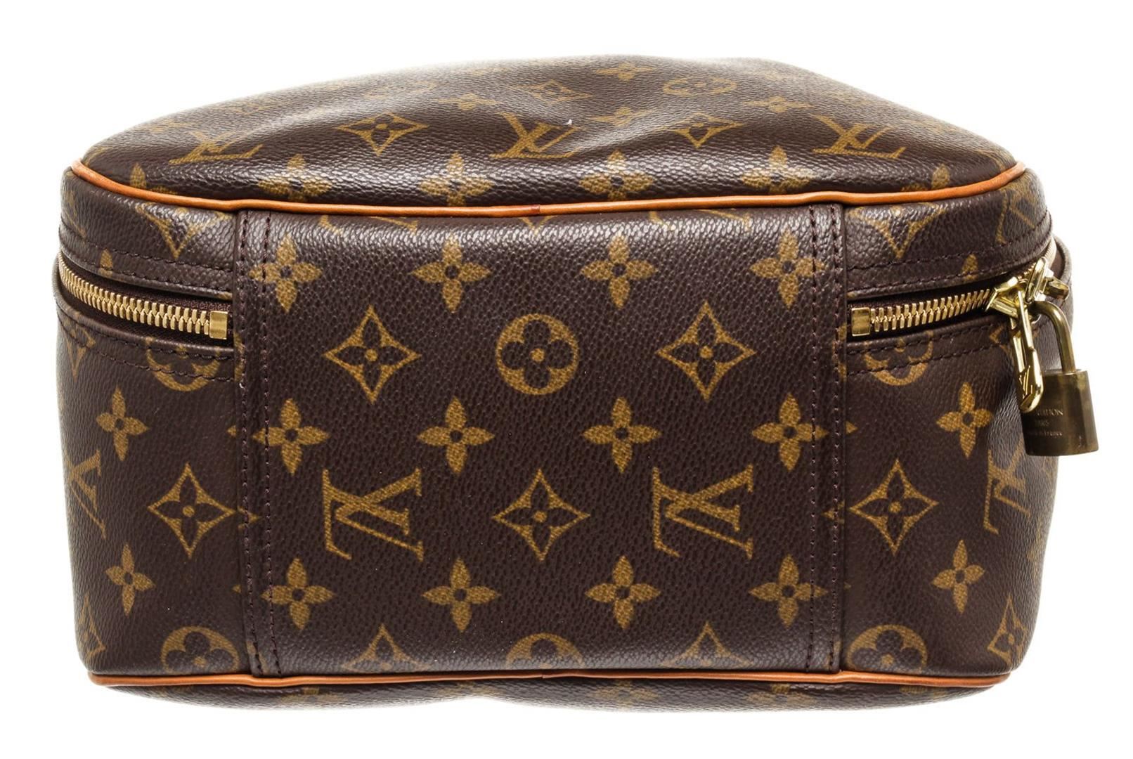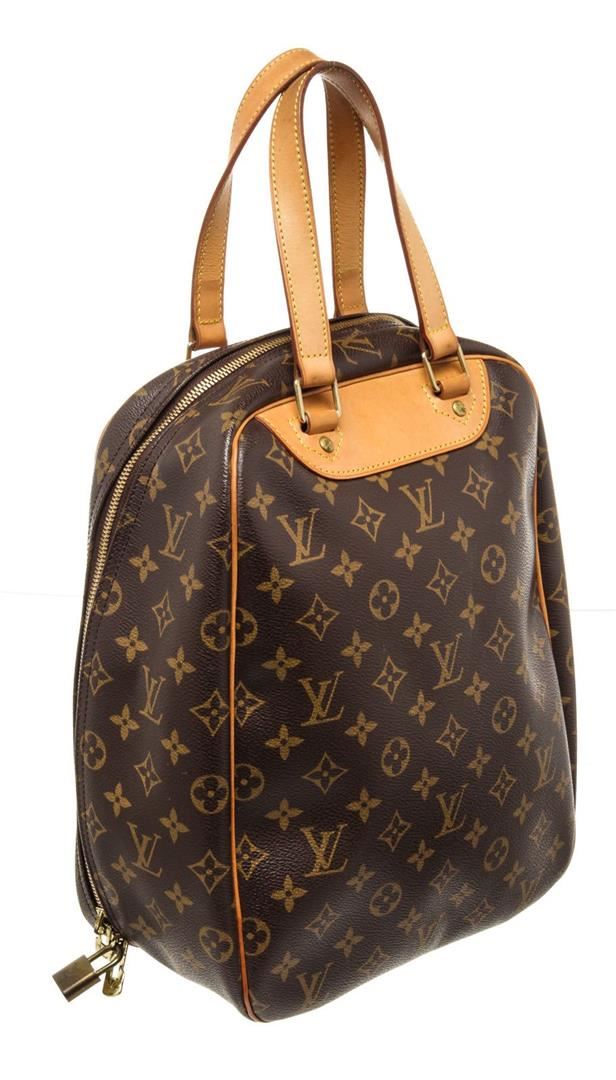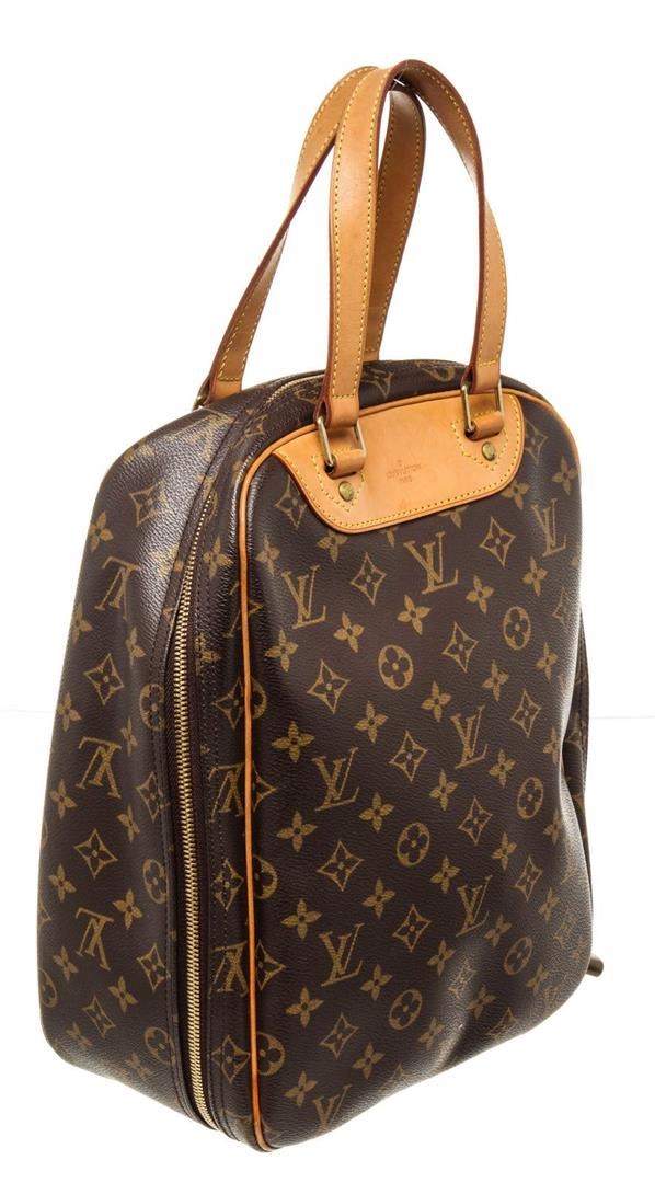 Louis Vuitton Brown Monogram Excursion Travel Bag with monogram canvas, gold-tone hardware, trim tan vachetta leather, interior slip pockets, canvas lining, adjustable, dual top handle and zipper closure.