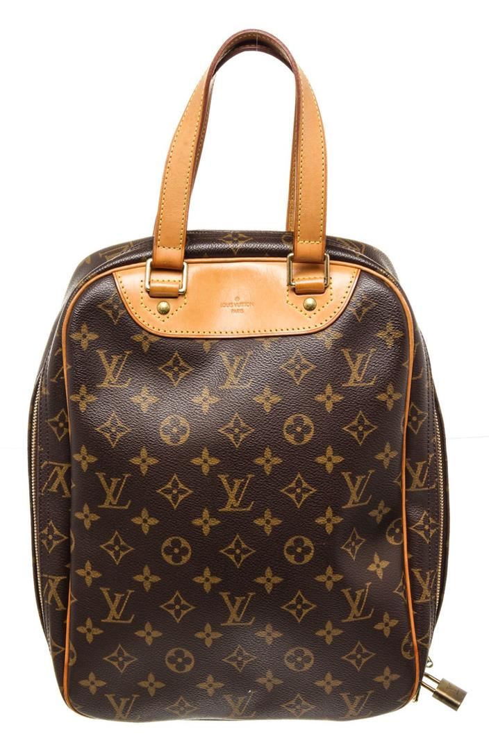 Louis Vuitton Brown Monogram Excursion Travel Bag with monogram canvas, gold-tone hardware, trim tan vachetta leather, interior slip pockets, canvas lining, adjustable, dual top handle and zipper closure.