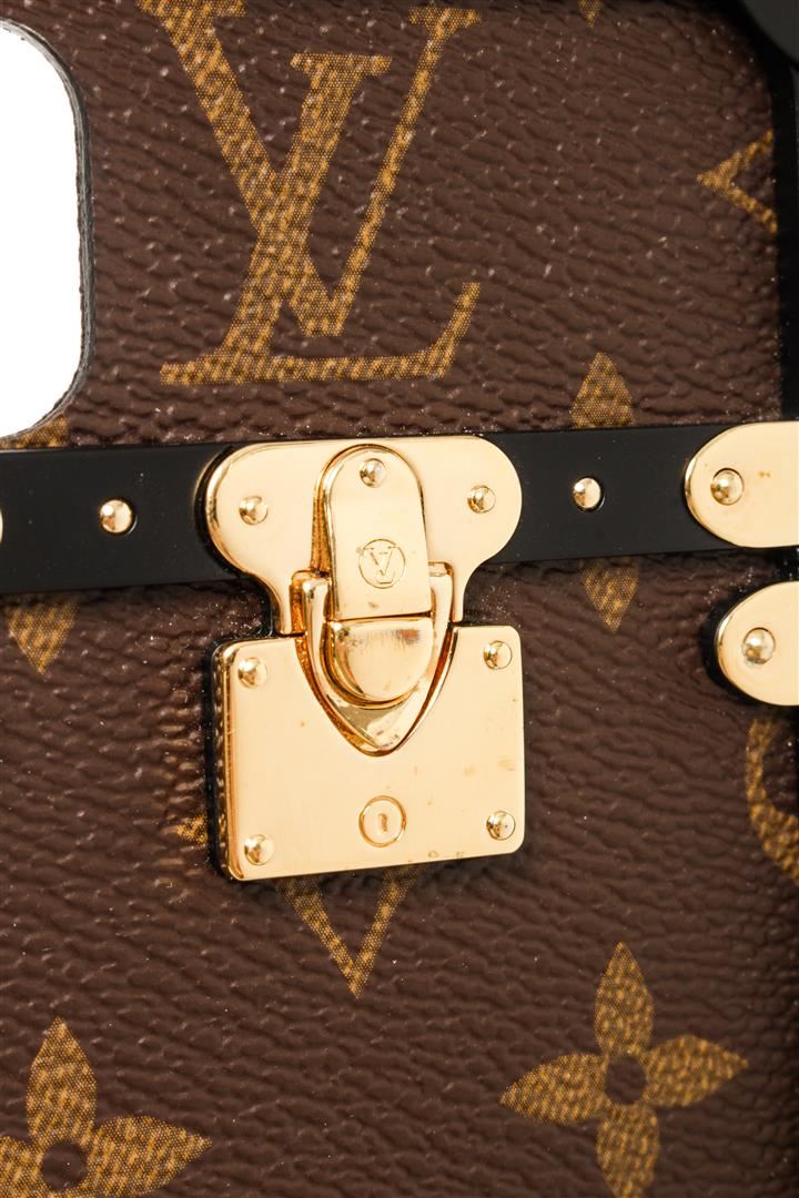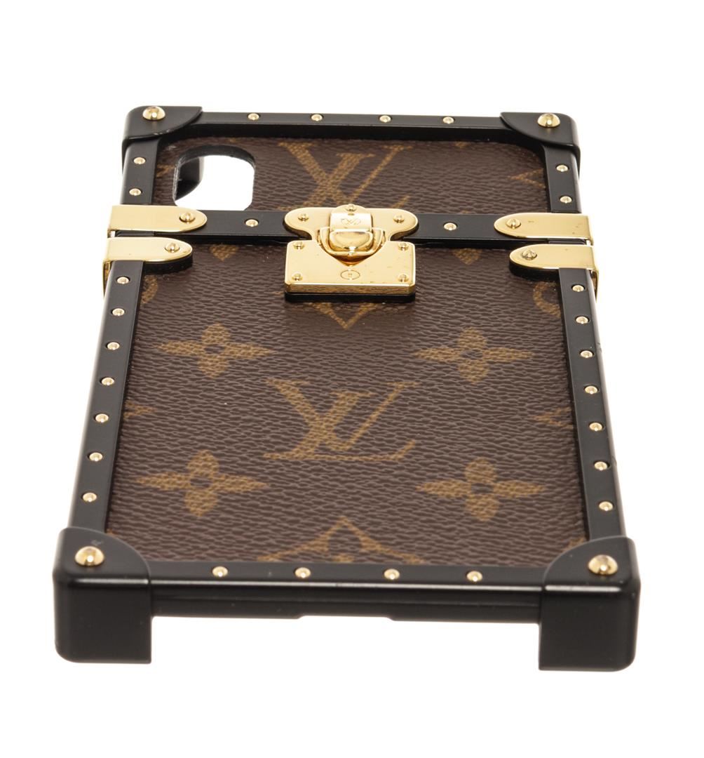 One Louis Vuitton Brown Monogram Eye-Trunk iPhone X Case. Item is sold AS-IS. All available information is listed in the description and shown in the photo. Louis Vuitton Monogram Eye-Trunk iPhone X Case with louis vuitton case has been crafted from monogram canvas and styled to resemble their famous trunk designs. the creation has gold-tone metal accents and suede-lined insides. Height: 5.91 in (15 cm) Width: 0.4 in (1 cm) Length: 3.15 in (8 cm)