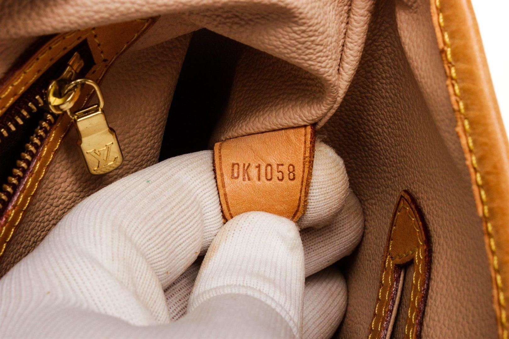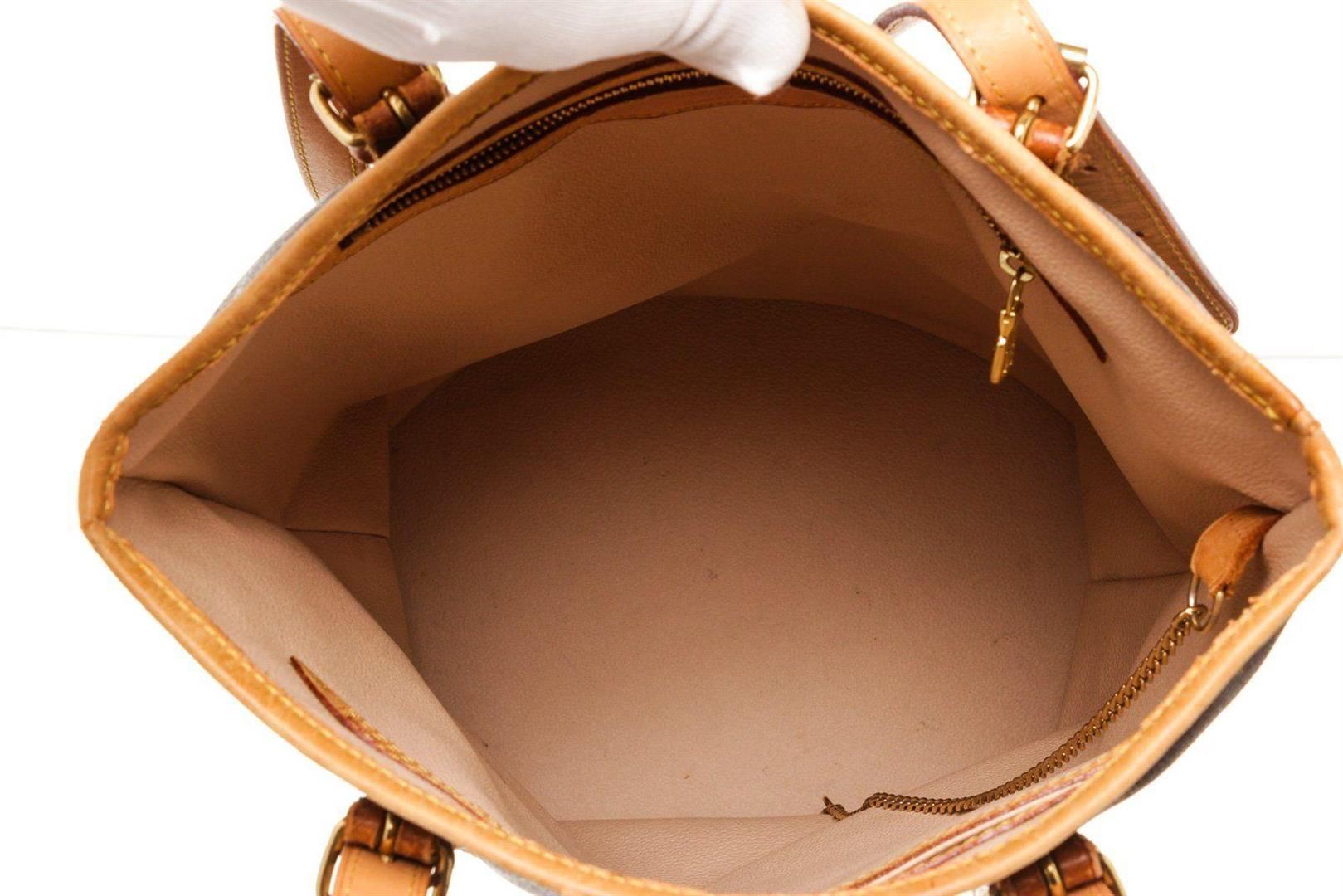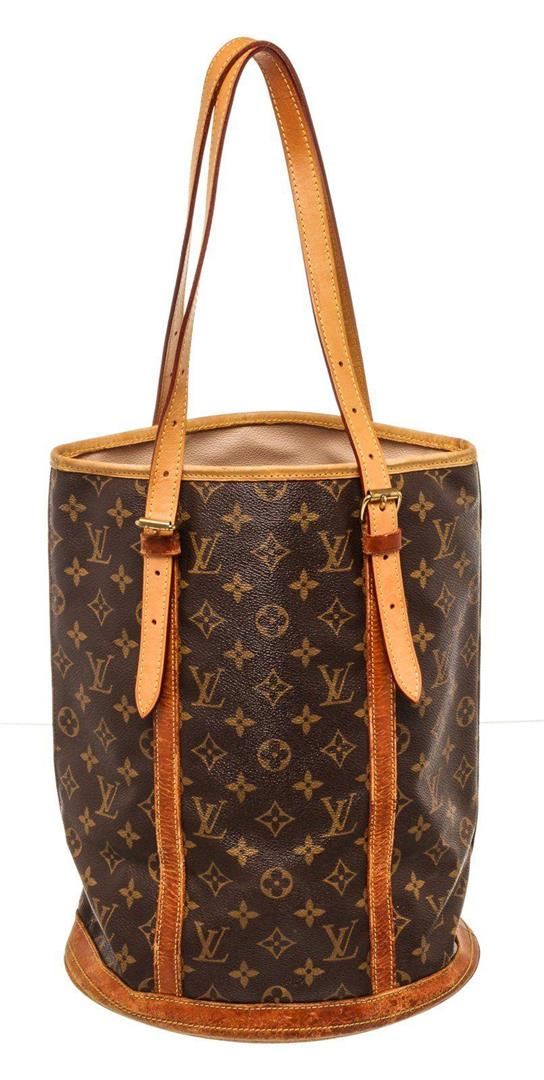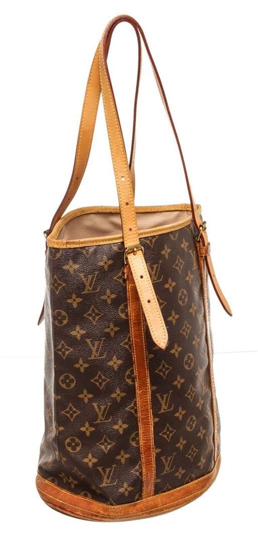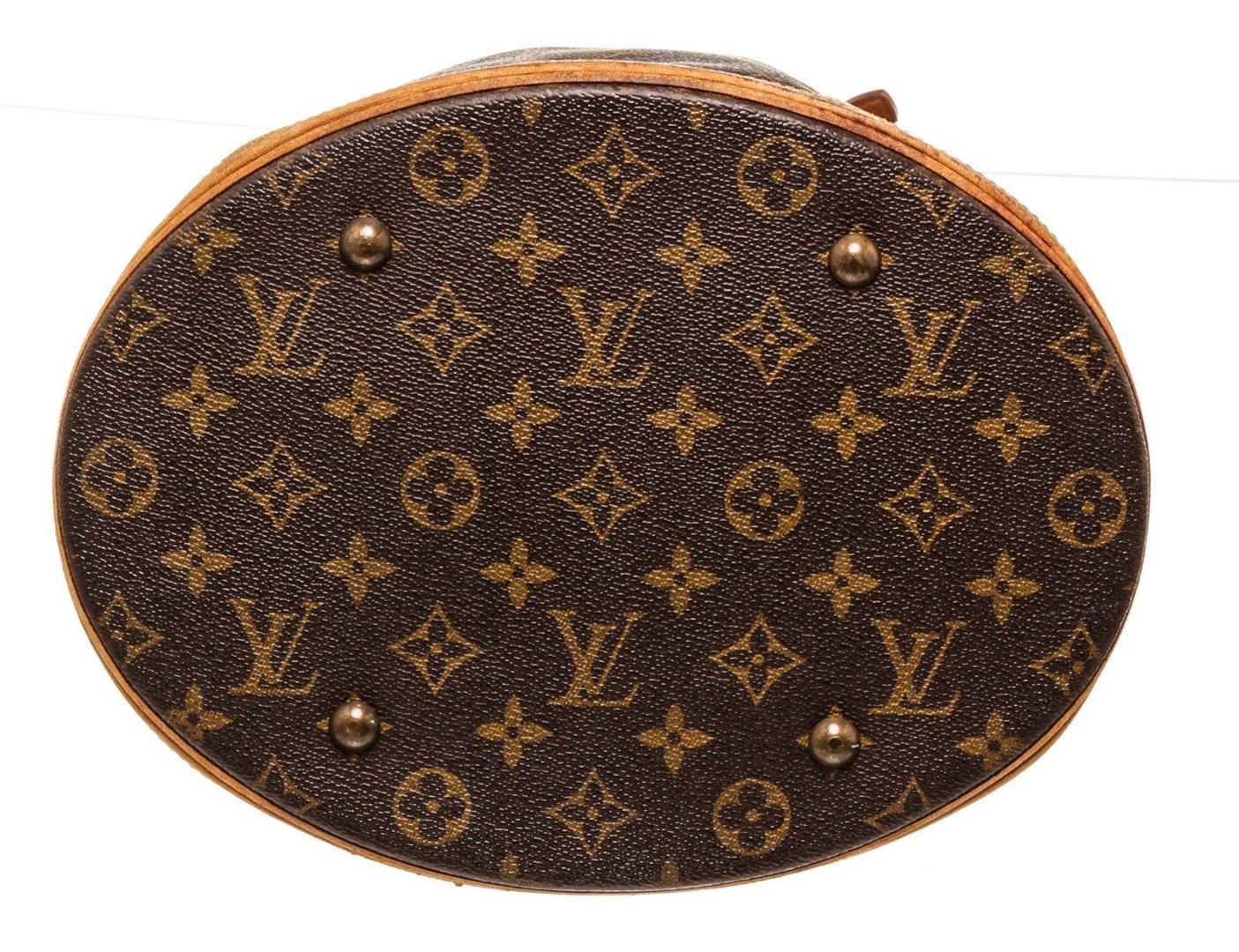 Louis Vuitton Brown Monogram Bucket GM Bag with material monogram canvas, gold-tone hardware, tan Vachetta trim, canvas lining, interior zip Pocket, shoulder strap with flap closure.