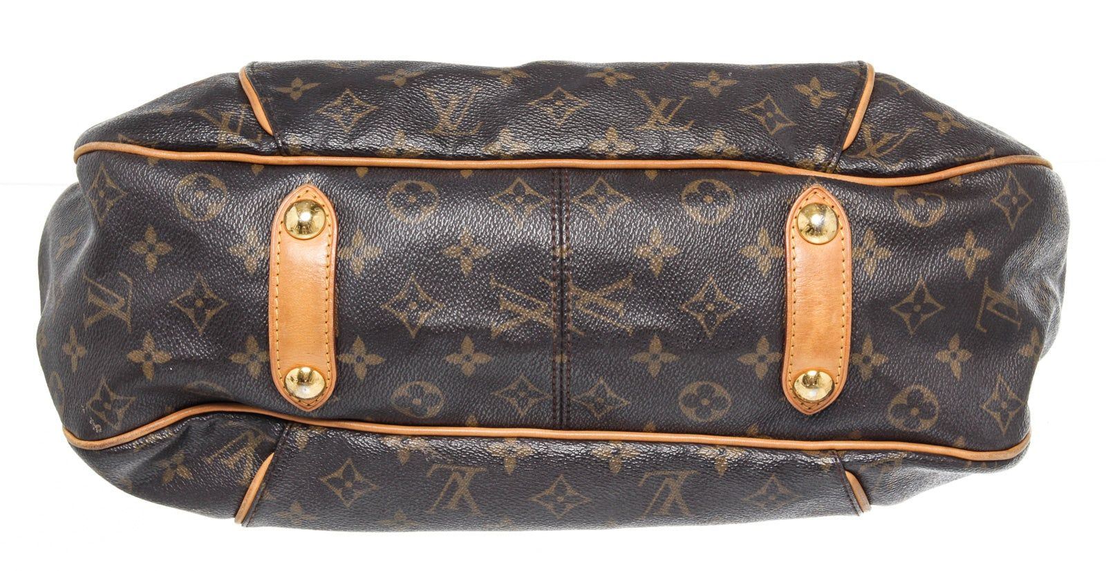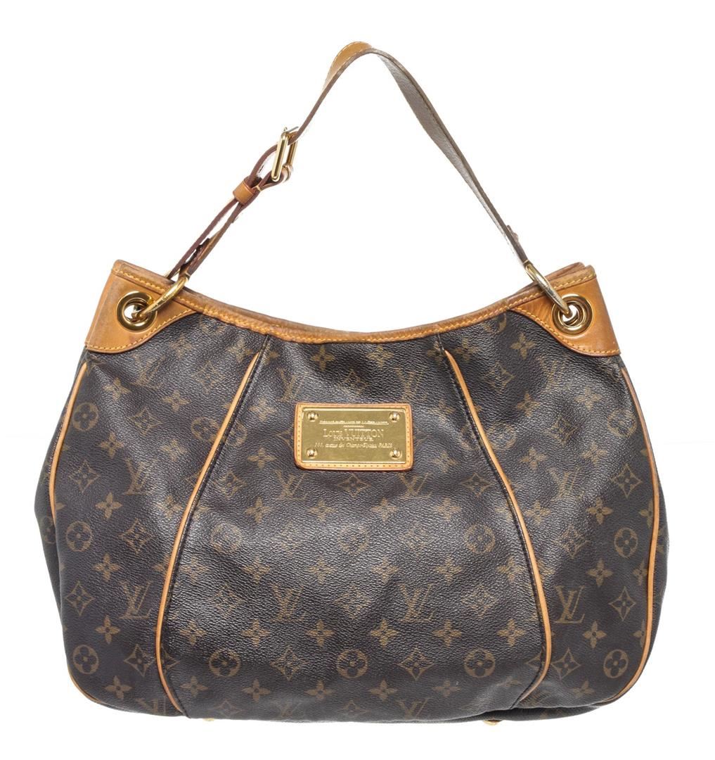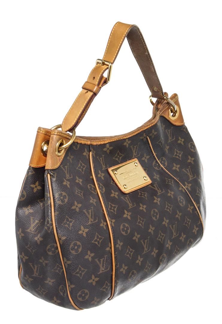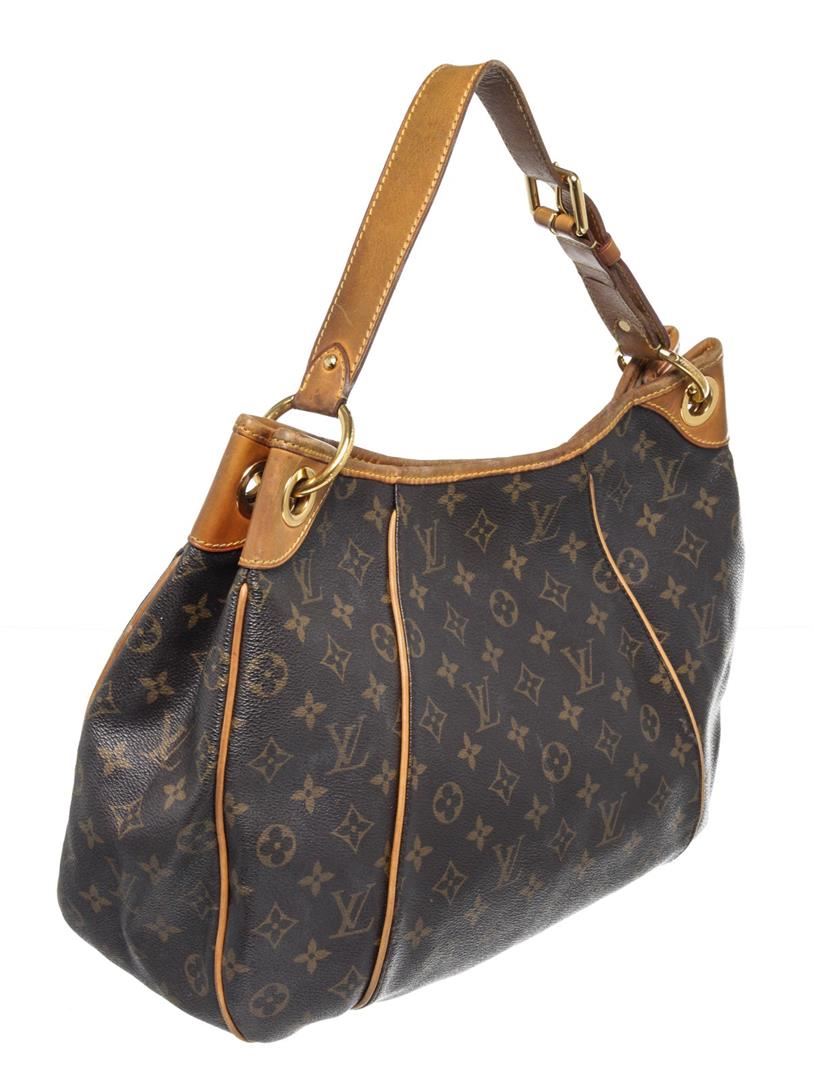 Louis Vuitton Brown Monogram Galliera PM Hobos Bag with monogram canvas, gold-tone hardware, trim tan vachetta leather, interior slip pockets, shoulder straps and snap closure.
