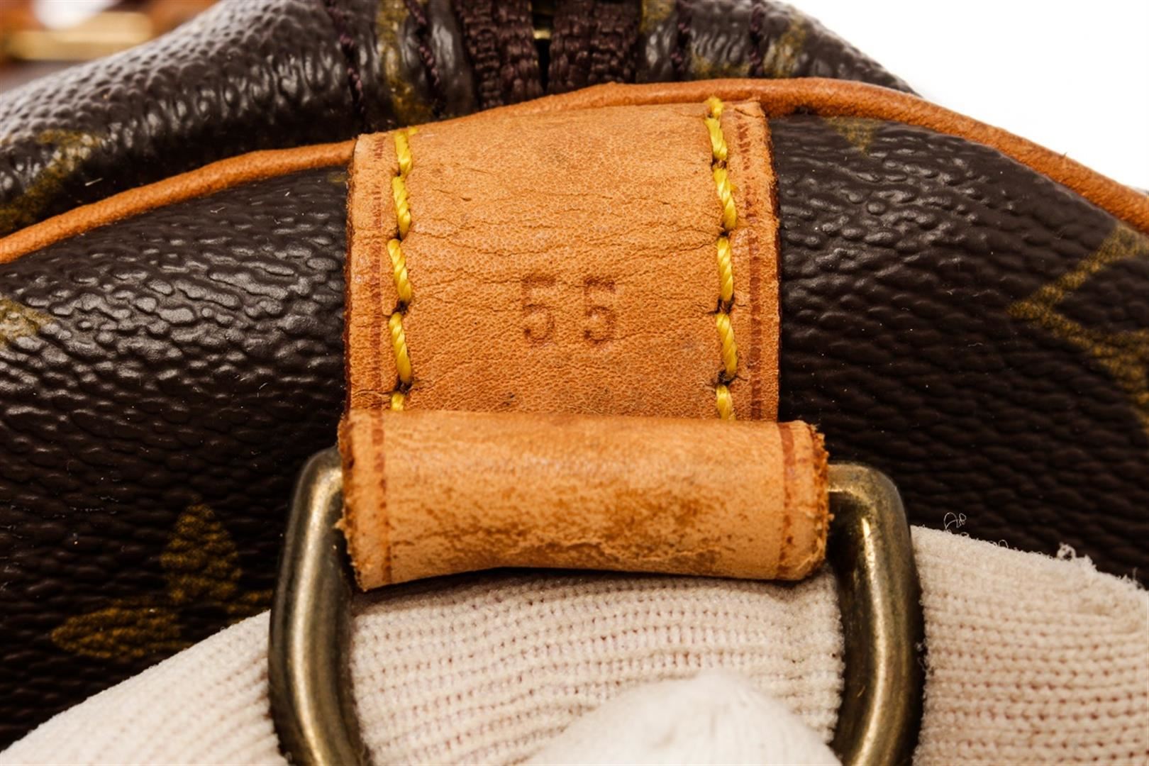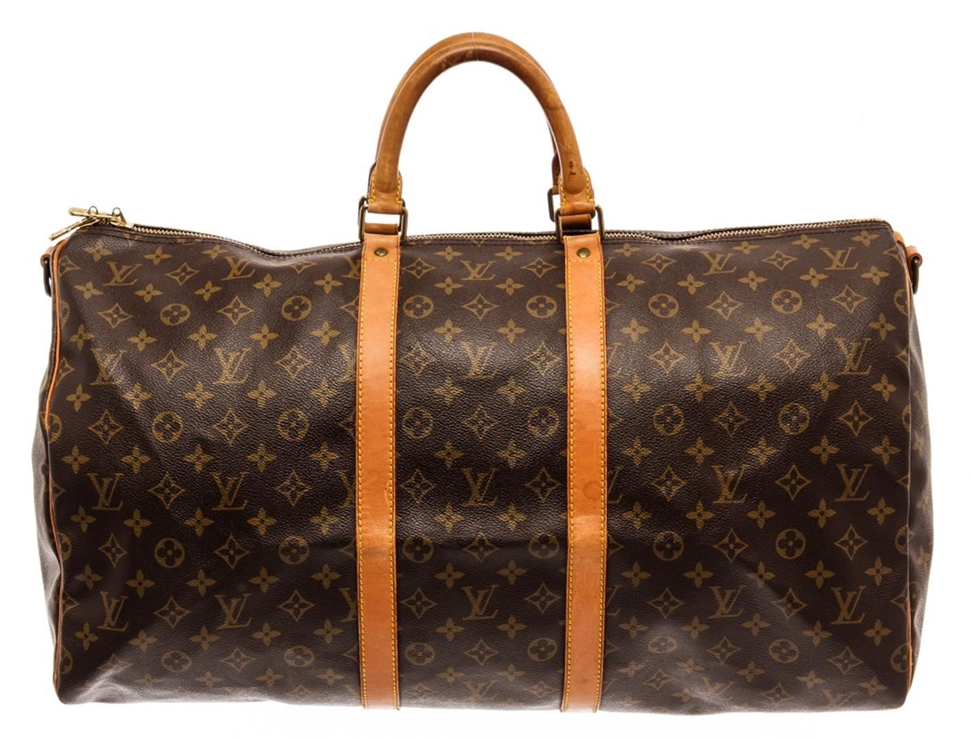 Louis Vuitton Brown Monogram Keepall 55 Bandoulière Travel Bag. All available information is listed in the description and shown in the photos. Louis Vuitton Brown Monogram Keepall 55 Bandoulière Travel Bag with this travel bag features, brown monogram, gold-tone hardware, leather trim, rolled handles, leather trim embellishment, canvas lining, zip closure at top. Height: 12" Width: 21" Depth: 9.25", Handle Drop: 4.5" / 30.48 x 53.34 x 23.49 Cm