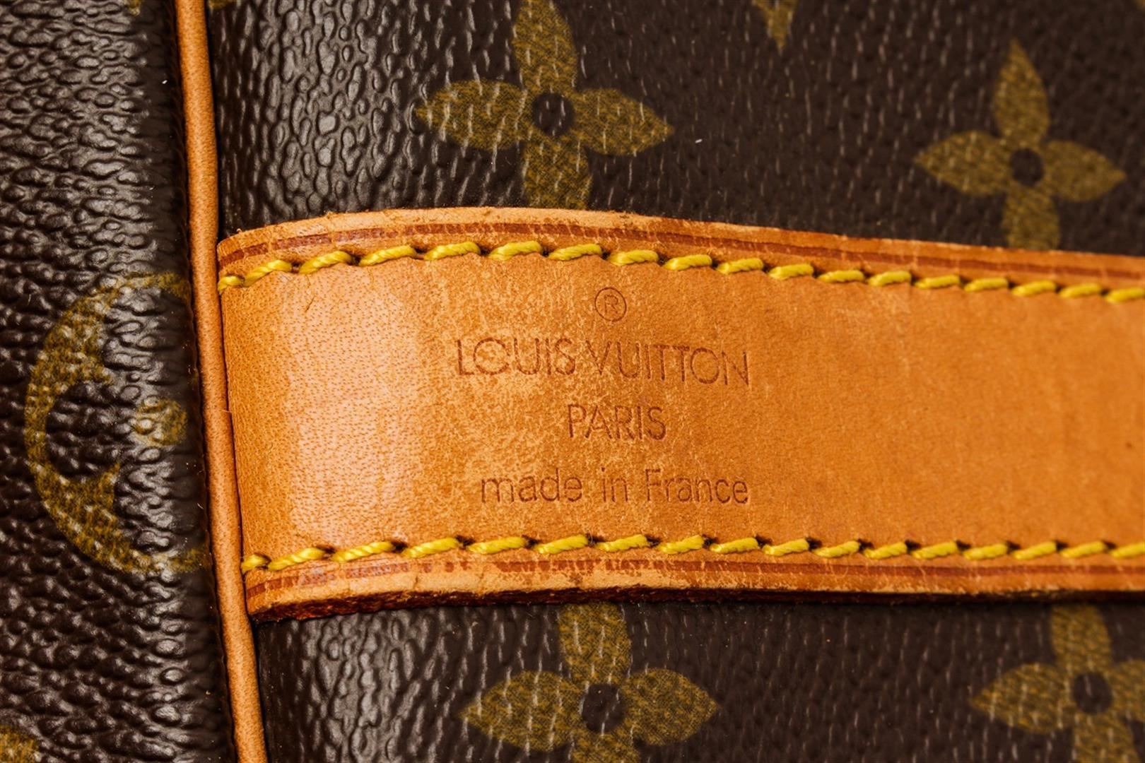 Louis Vuitton Brown Monogram Keepall 55 Bandoulière Travel Bag. All available information is listed in the description and shown in the photos. Louis Vuitton Brown Monogram Keepall 55 Bandoulière Travel Bag with this travel bag features, brown monogram, gold-tone hardware, leather trim, rolled handles, leather trim embellishment, canvas lining, zip closure at top. Height: 12" Width: 21" Depth: 9.25", Handle Drop: 4.5" / 30.48 x 53.34 x 23.49 Cm
