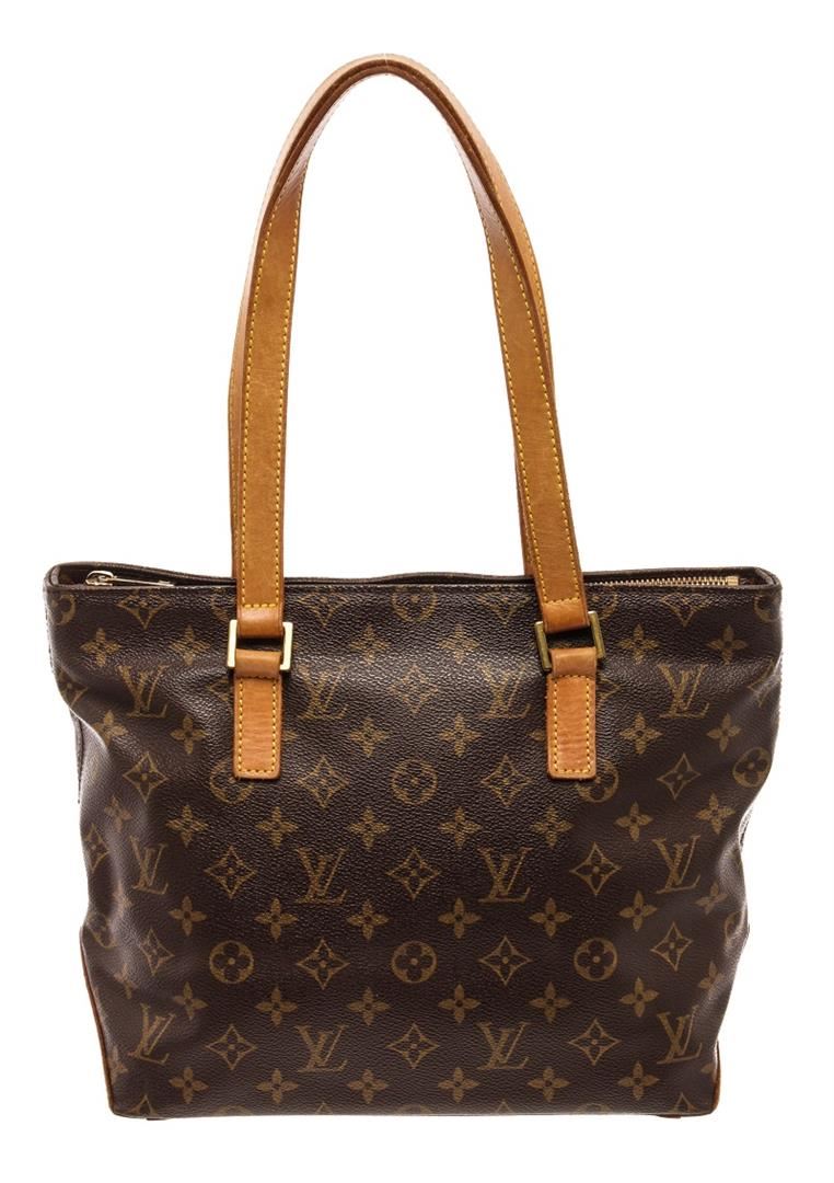 Louis Vuitton Brown Monogram Leather Cabas Piano Tote Bag. All available information is listed in the description and shown in the photos. louis vuitton brown monogram leather cabas piano tote bag with vintage, gold-tone hardware, leather trim, dual shoulder straps, leather trim embellishment, canvas lining & single interior pocket, zip closure at top, includes dust bag. Height: 9.5" Width: 11" Depth: 4.5", Shoulder Strap Drop: 9" / 24.13 x 27.94 x 11.43 Cm