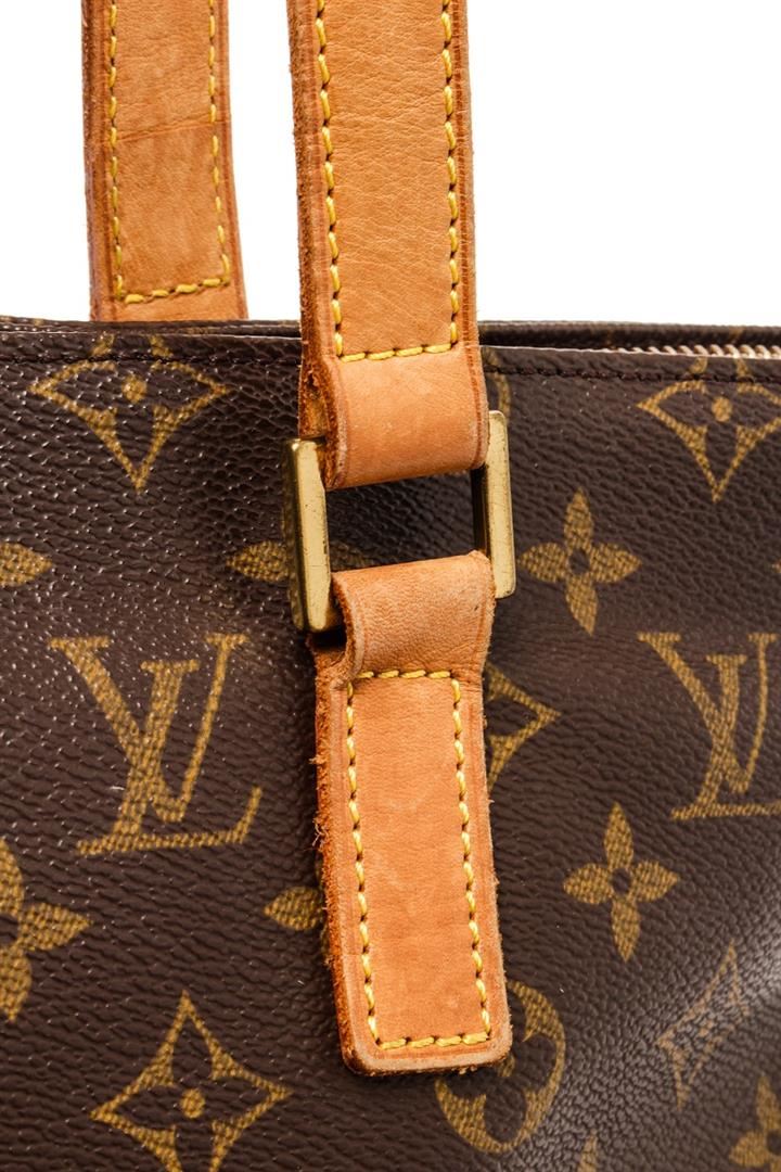 Louis Vuitton Brown Monogram Leather Cabas Piano Tote Bag. All available information is listed in the description and shown in the photos. louis vuitton brown monogram leather cabas piano tote bag with vintage, gold-tone hardware, leather trim, dual shoulder straps, leather trim embellishment, canvas lining & single interior pocket, zip closure at top, includes dust bag. Height: 9.5" Width: 11" Depth: 4.5", Shoulder Strap Drop: 9" / 24.13 x 27.94 x 11.43 Cm