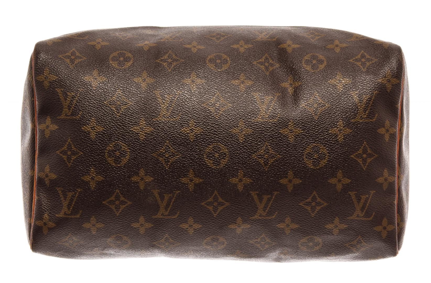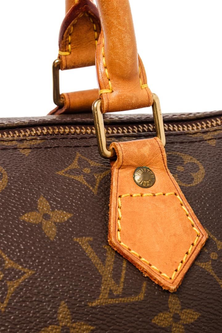 Louis Vuitton Brown Monogram Leather Speedy 30 Satchel Bag. All available information is listed in the description and shown in the photos. Louis Vuitton Brown Monogram Leather Speedy 30 Satchel Bag with brown & neutrals, brass hardware, leather trim, rolled handles, leather trim embellishment, grosgrain lining & single interior pocket, zip closure at top. Height: 8.25" Width: 11.75" Depth: 6.75", Handle Drop: 3" / 20.95 x 29.84 x 17.14 Cm