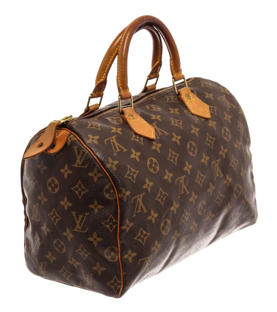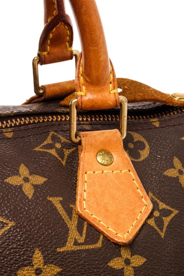 Louis Vuitton Brown Monogram Leather Speedy 30 Satchel Bag. All available information is listed in the description and shown in the photos. Louis Vuitton Brown Monogram Leather Speedy 30 Satchel Bag with brown & neutrals, brass hardware, leather trim, rolled handles, leather trim embellishment, grosgrain lining & single interior pocket, zip closure at top. Height: 8.25" Width: 11.75" Depth: 6.75", Handle Drop: 3" / 20.95 x 29.84 x 17.14 Cm