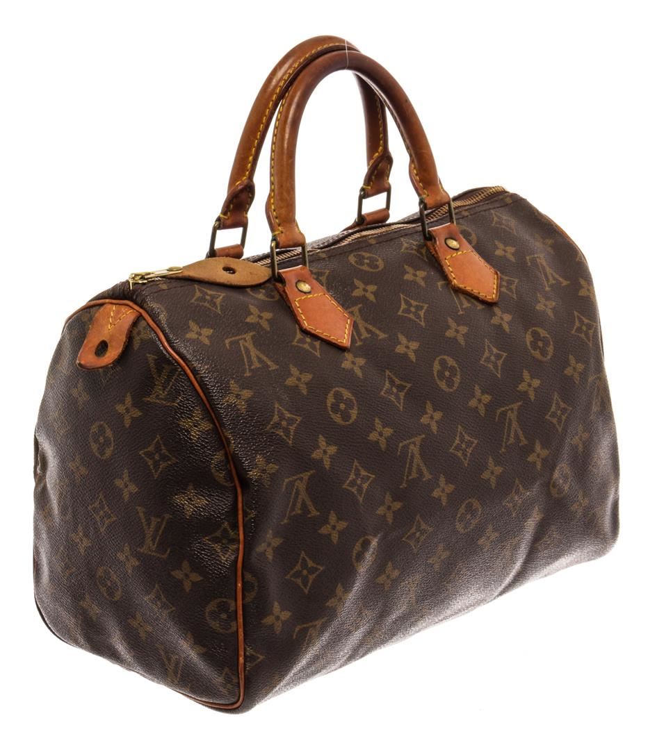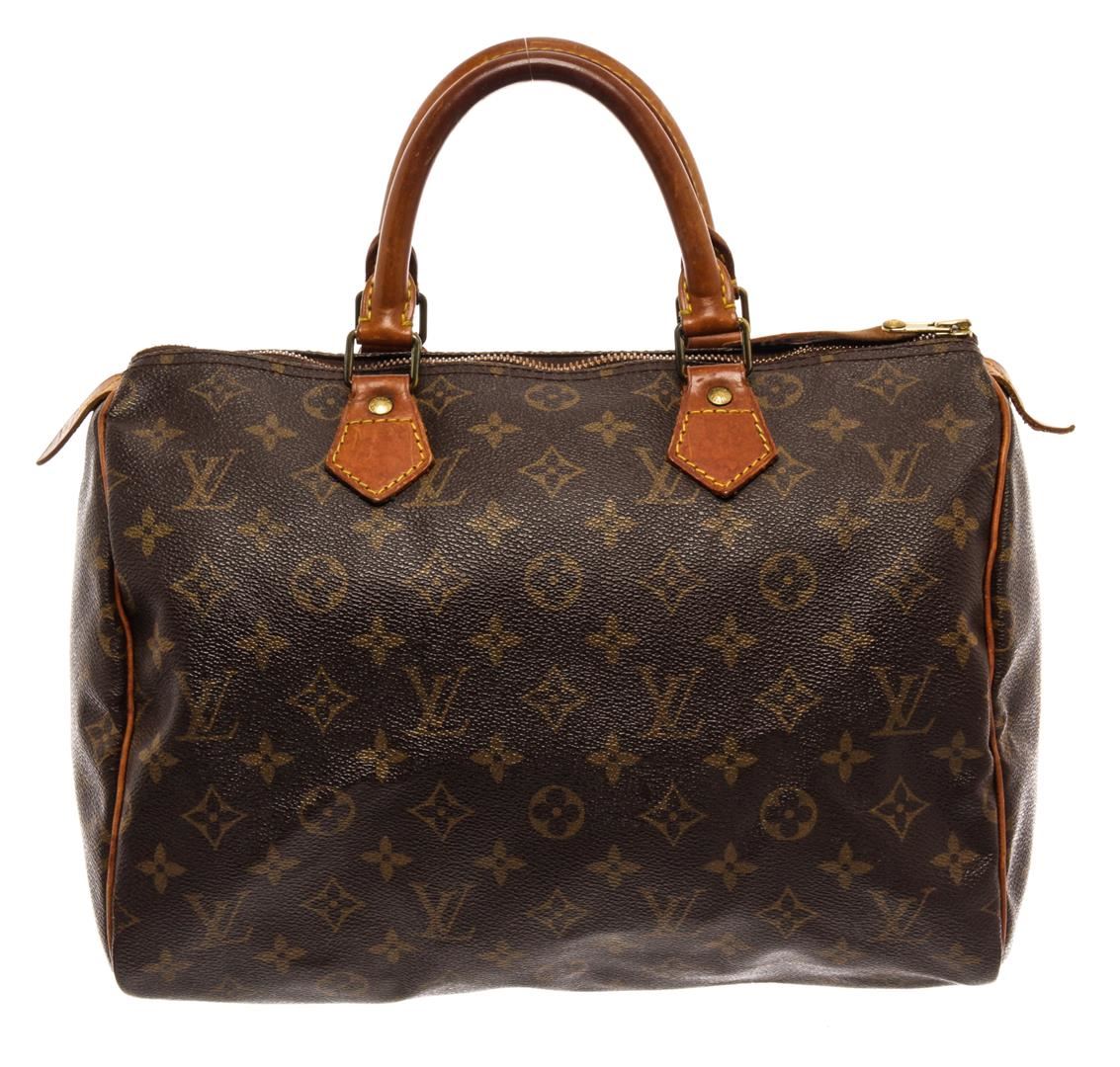 Louis Vuitton Brown Monogram Leather Speedy 30 Satchel Bag. All available information is listed in the description and shown in the photos. Louis Vuitton Brown Monogram Leather Speedy 30 Satchel Bag with monogram pattern, brass hardware, leather trim, rolled handles, leather trim embellishment, canvas lining & single interior pocket, zip closure at top. Height: 8.25" Width: 12.75" Depth: 6.75", Handle Drop: 3.5" / 20.95 x 32.38 x 17.14 Cm