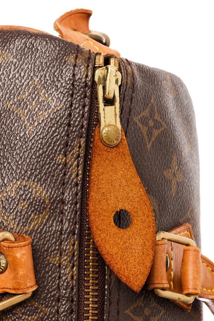 Louis Vuitton Brown Monogram Leather Speedy 30 Satchel Bag. All available information is listed in the description and shown in the photos. Louis Vuitton Brown Monogram Leather Speedy 30 Satchel Bag with brown & neutrals, brass hardware, leather trim, rolled handles, leather trim embellishment, grosgrain lining & single interior pocket, zip closure at top. Height: 8.25" Width: 11.75" Depth: 6.75", Handle Drop: 3" / 20.95 x 29.84 x 17.14 Cm