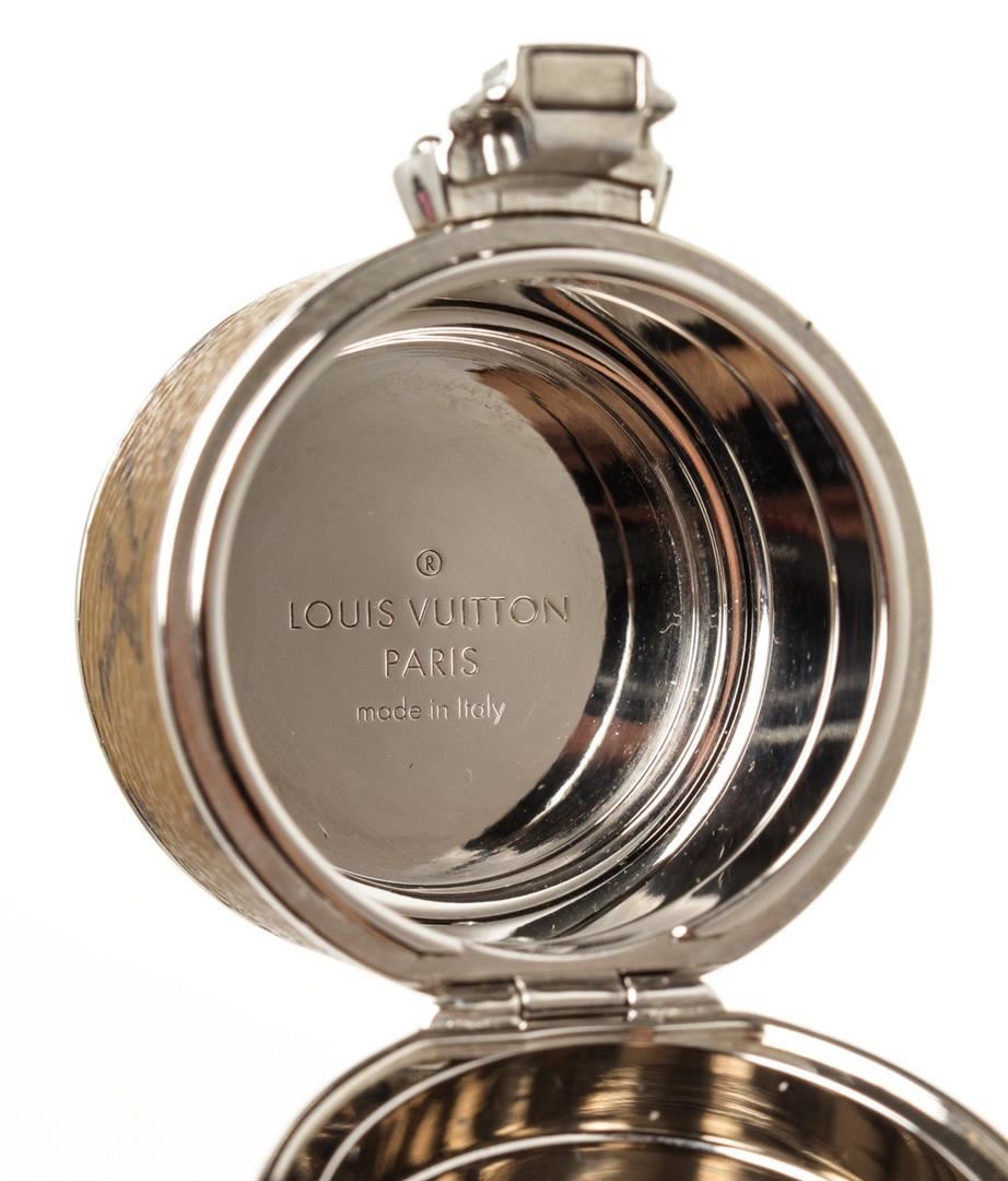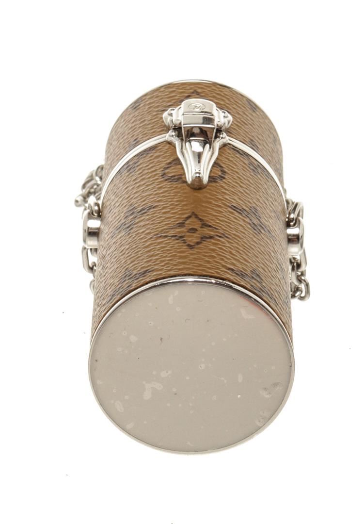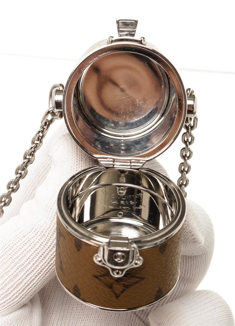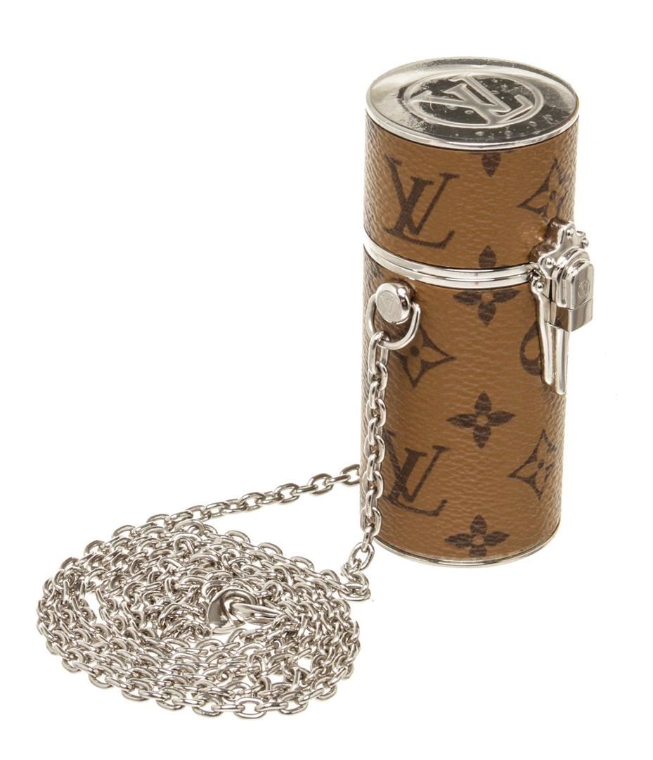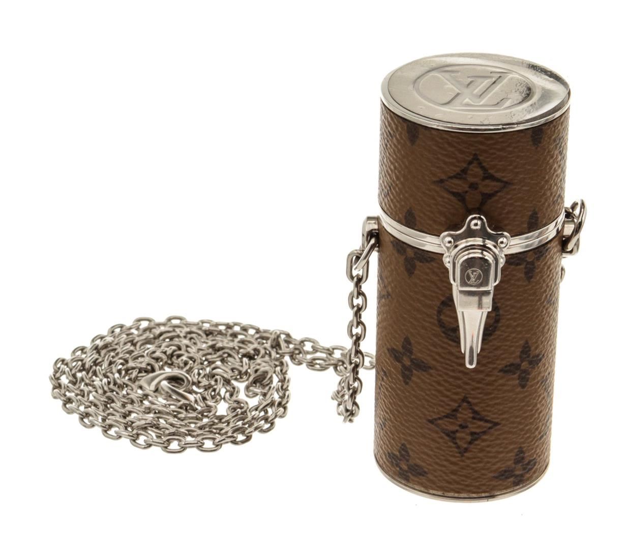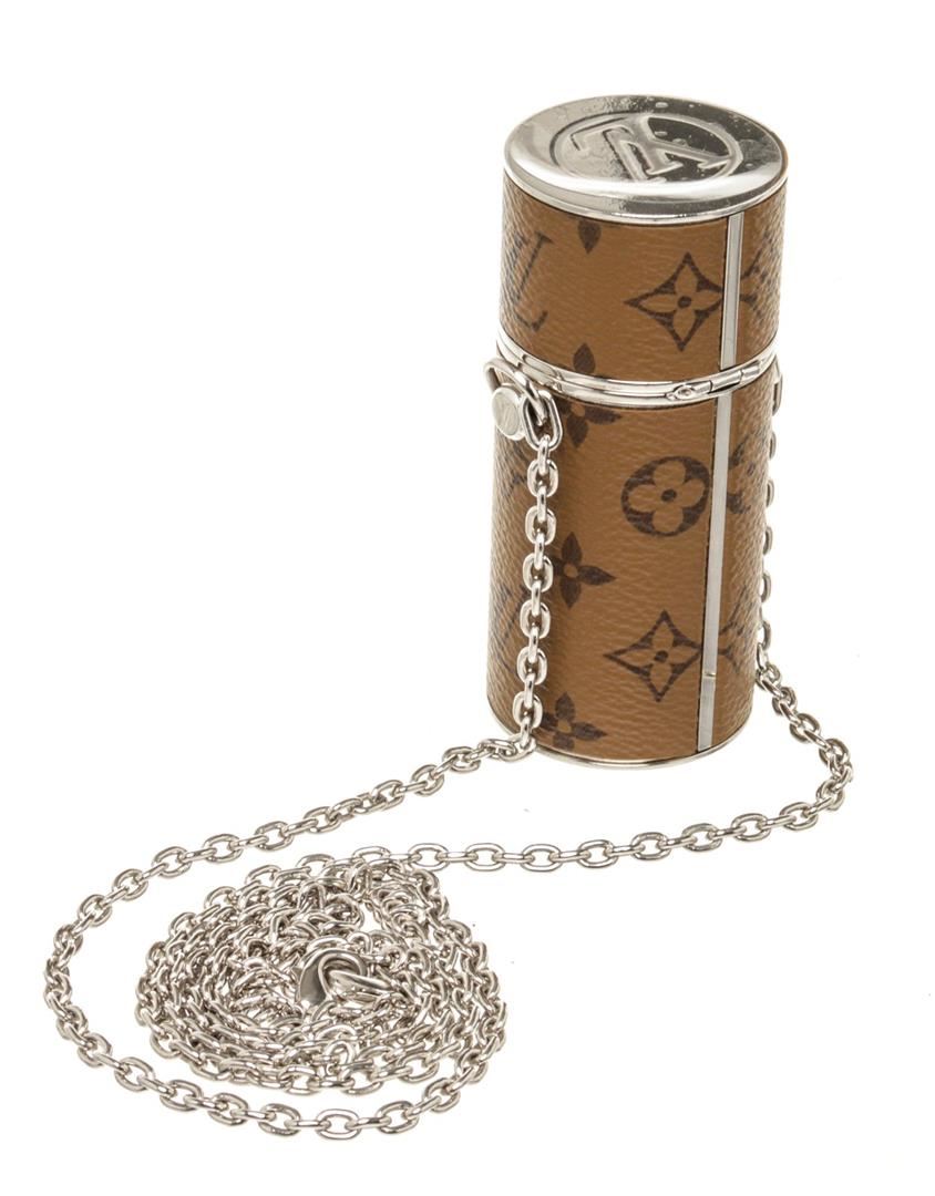 Brown monogram Louis Vuitton lipstick case with silver-tone hardware, brown leather trim, and flap closure.