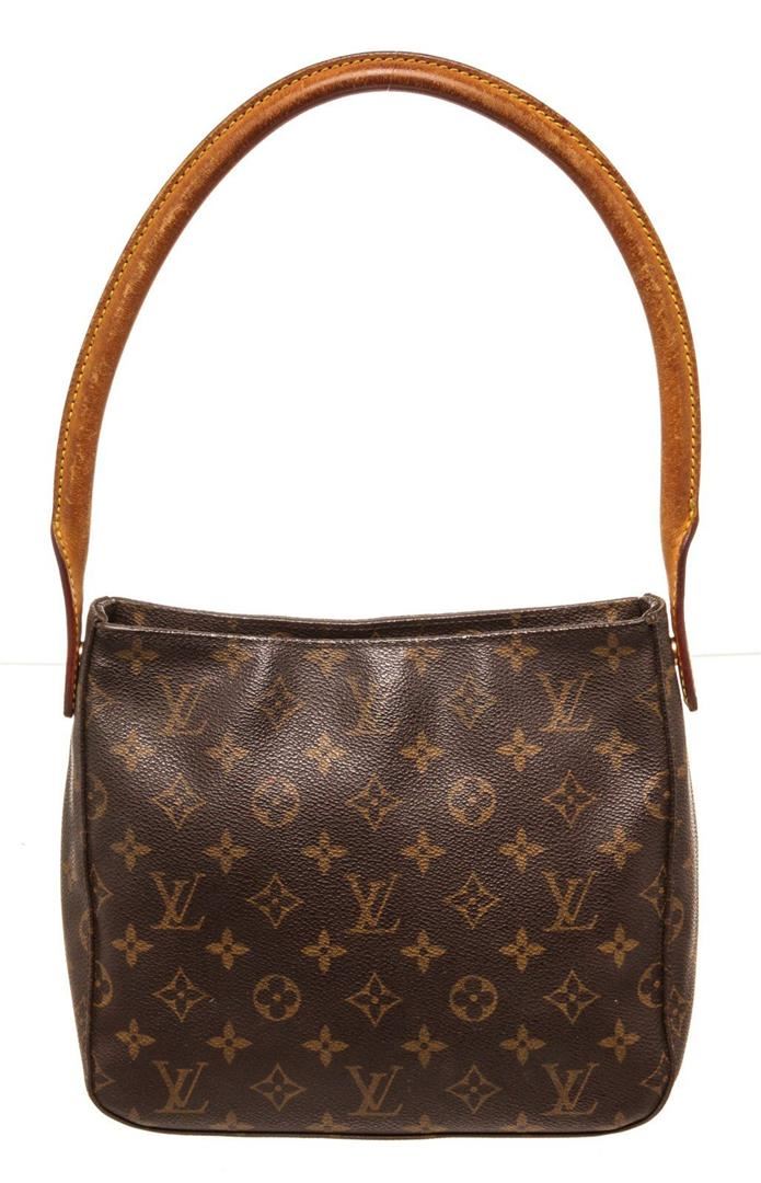 Louis Vuitton Brown Monogram Looping MM Shoulder Bag with monogram canvas, gold-tone hardware, trim tan vachetta leather, interior slip zip pocket, shoulder strap and zipper closure.