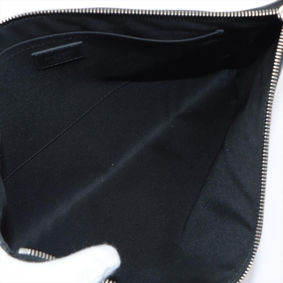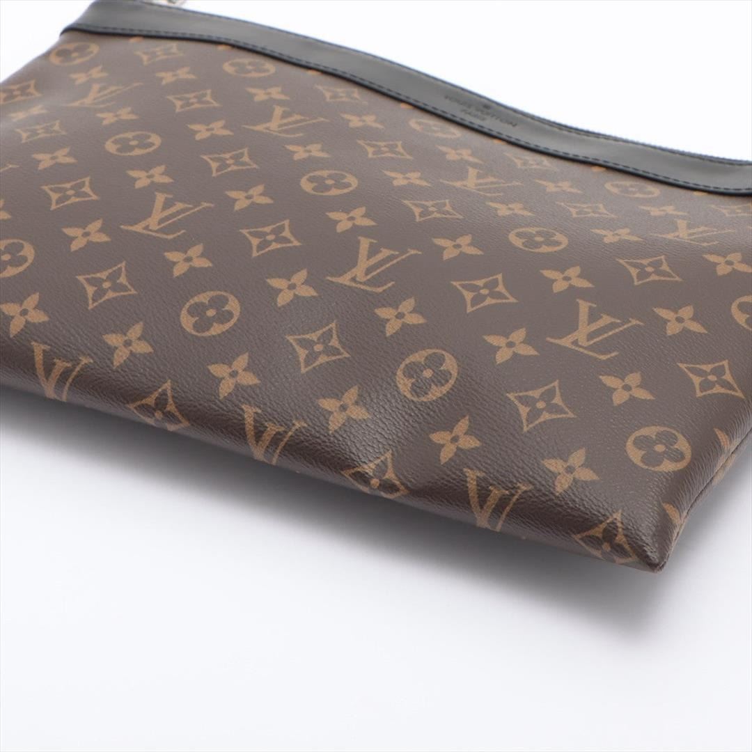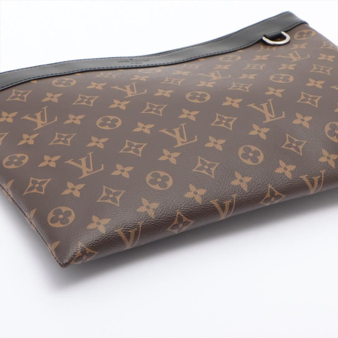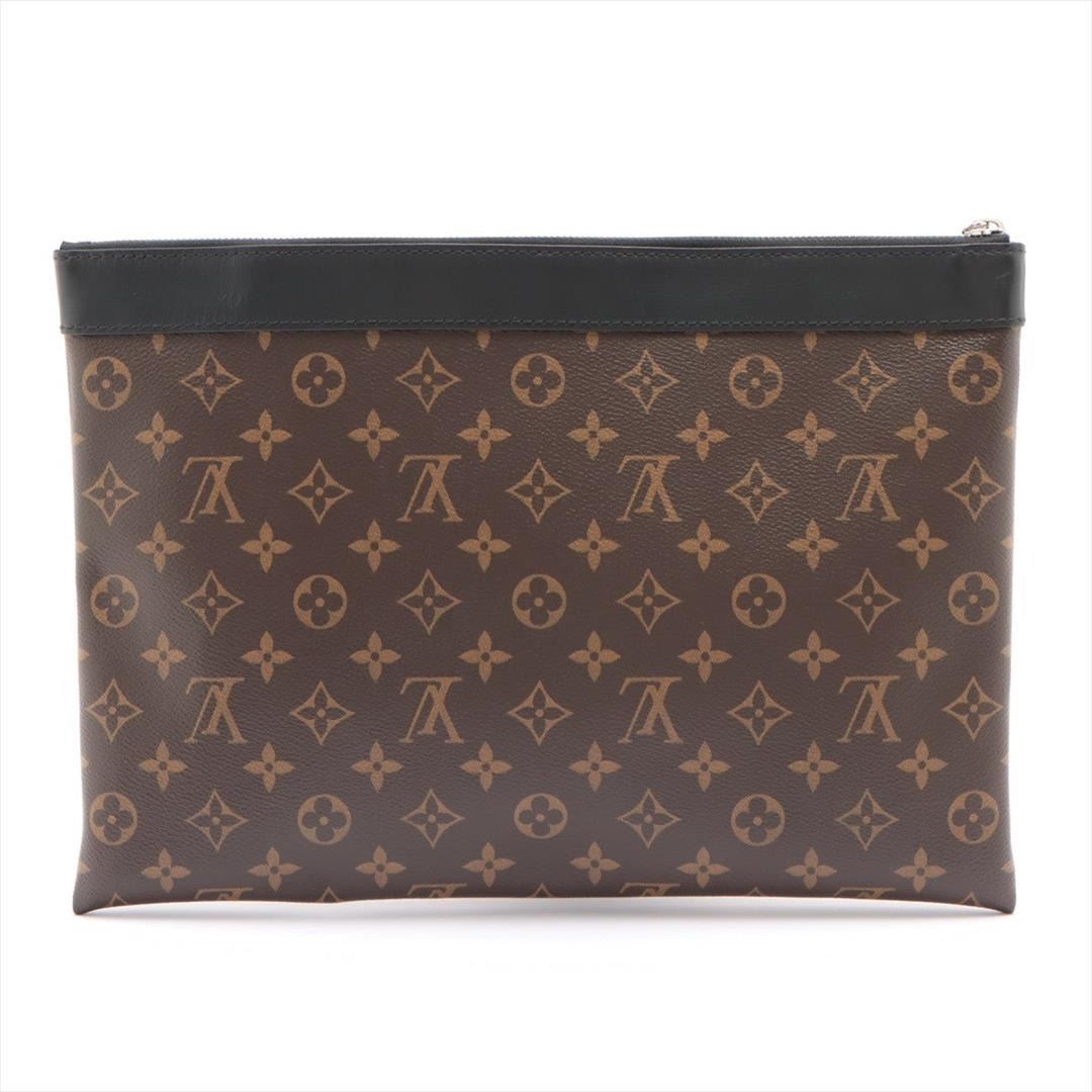 Brown Monogram Macassar coated canvas Louis Vuitton Discovery clutch with silver-tone hardware, black leather lining, black canvas lining single interior pocket and zip closure at top. Height: 9.5" Width: 13.5" Depth: 1"