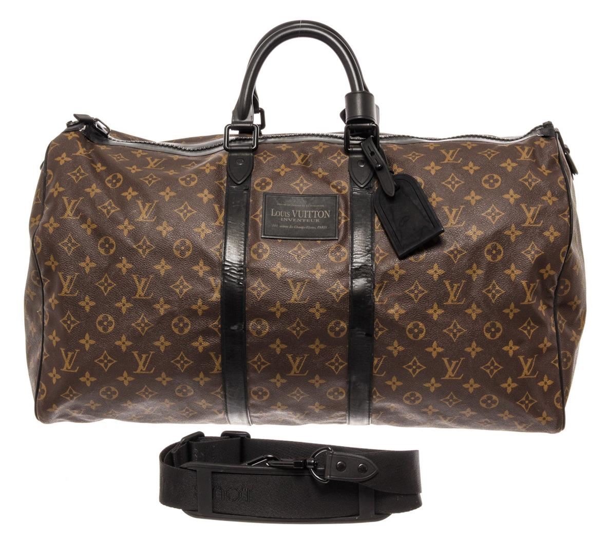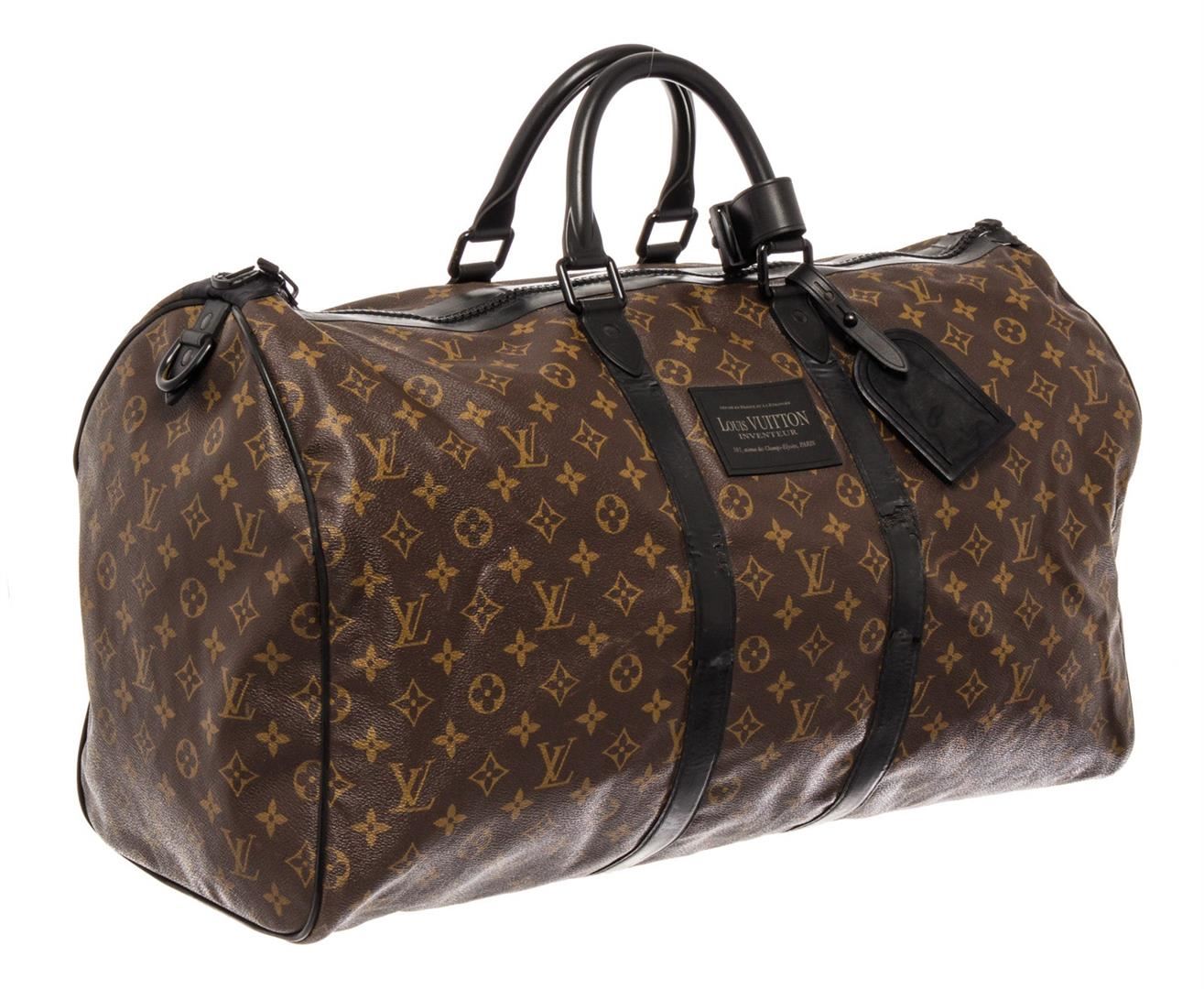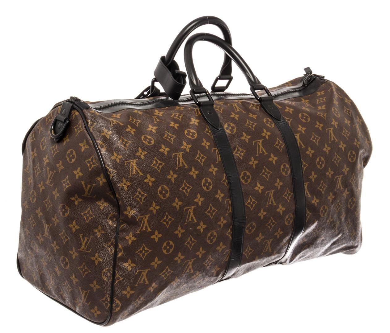 Brown and tan Monogram Macassar coated canvas Louis Vuitton Keepall Bandouliere the black-colored hardware, black vachetta leather trim, dual rolled top leather handles, brown canvas lining and zip closure at top. Detachable black leather shoulder strap.