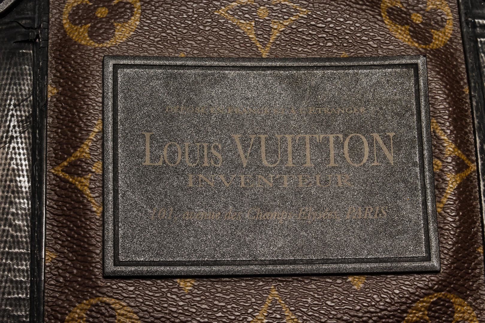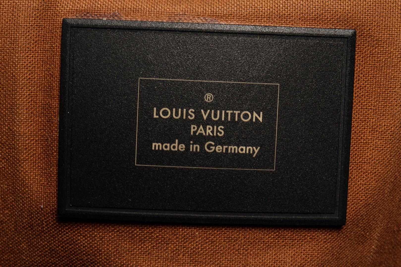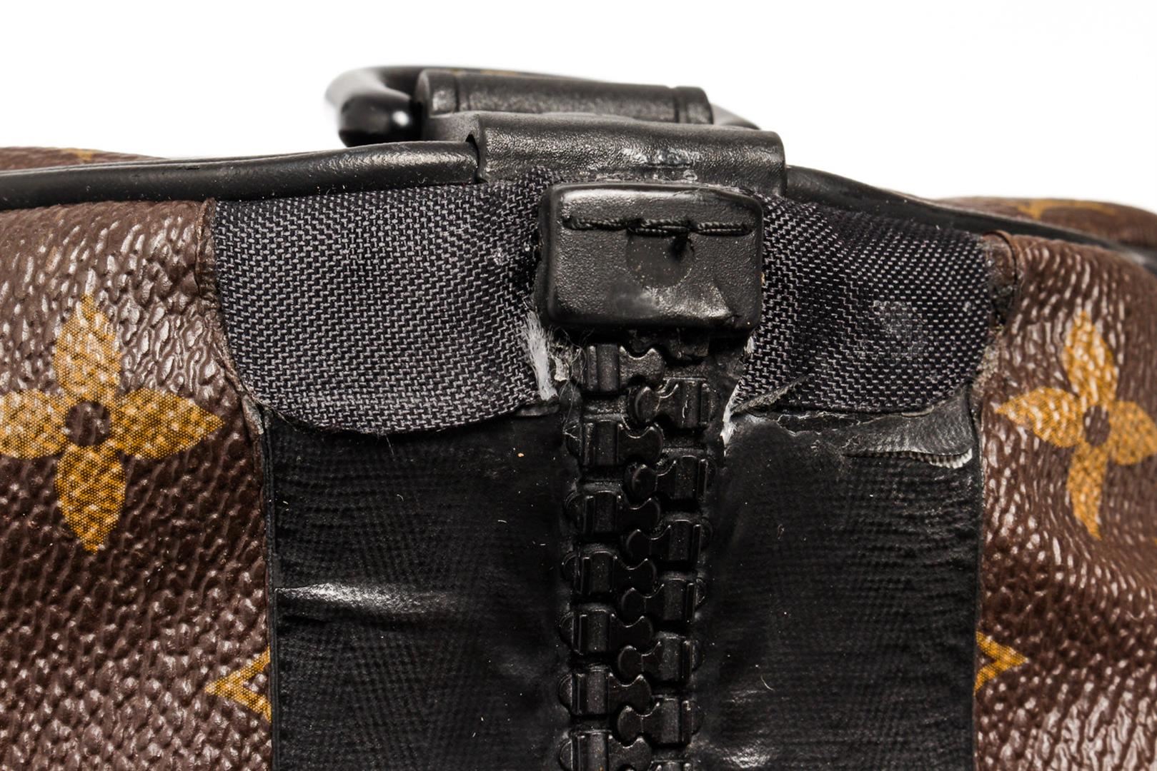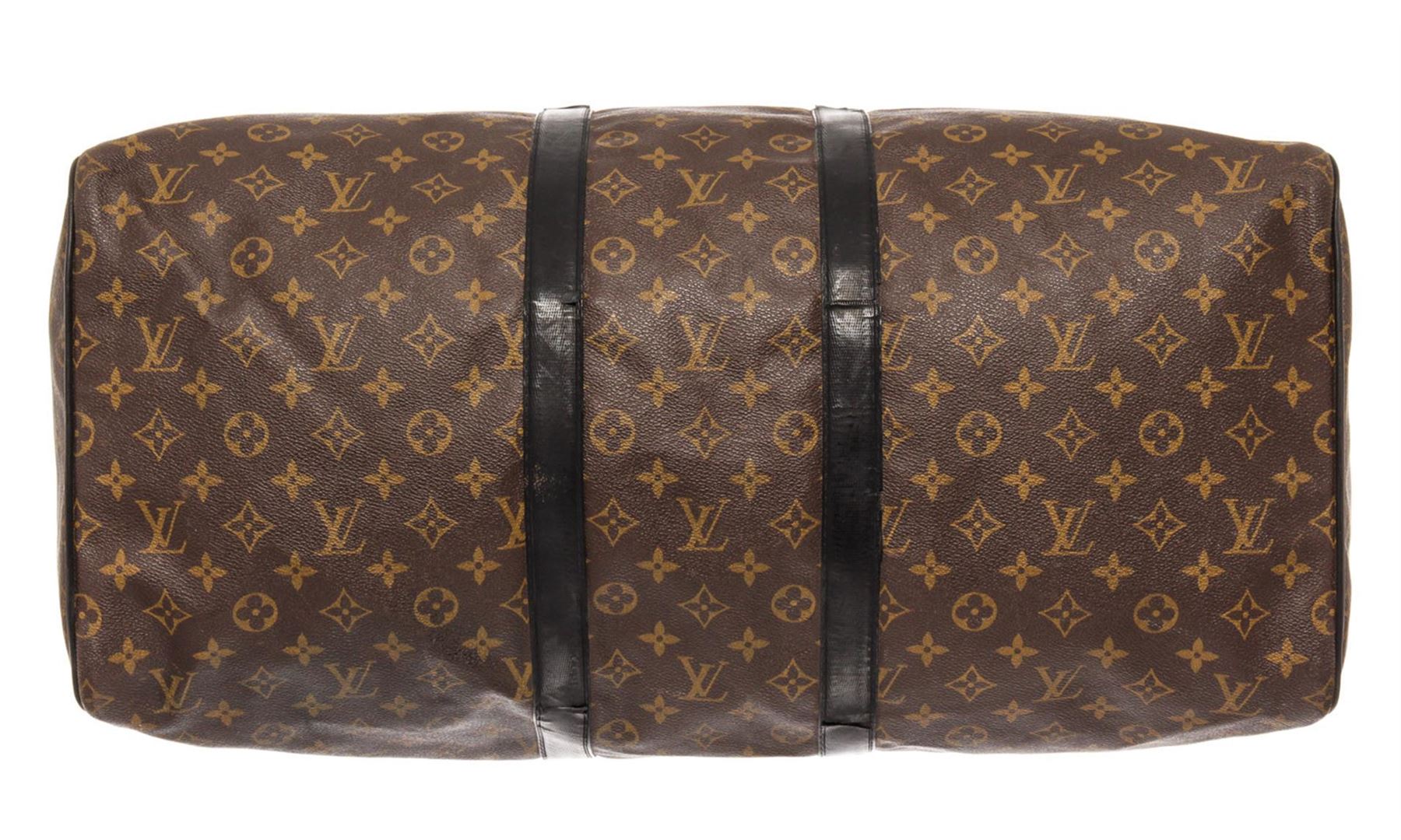 Brown and tan Monogram Macassar coated canvas Louis Vuitton Keepall Bandouliere the black-colored hardware, black vachetta leather trim, dual rolled top leather handles, brown canvas lining and zip closure at top. Detachable black leather shoulder strap.