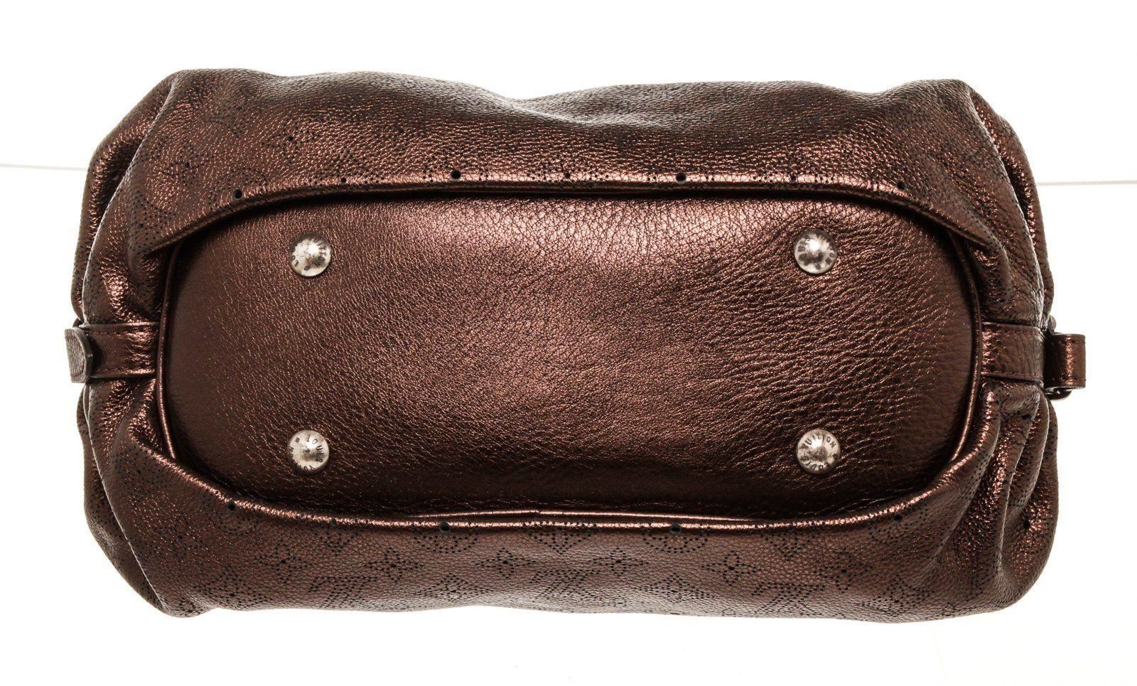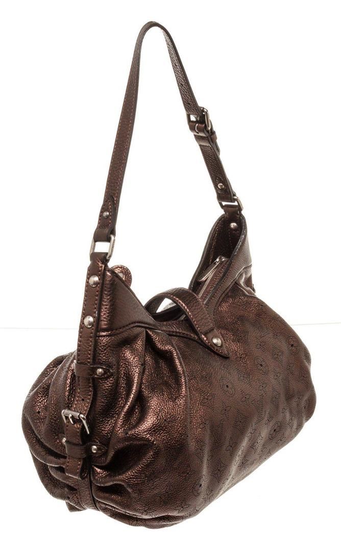 Louis Vuitton Brown Monogram Mahina Large Hobo Bag with material leather, gold-tone hardware, trim tan vachetta leather, interior slip pockets shoulder strap and push-lock closure.