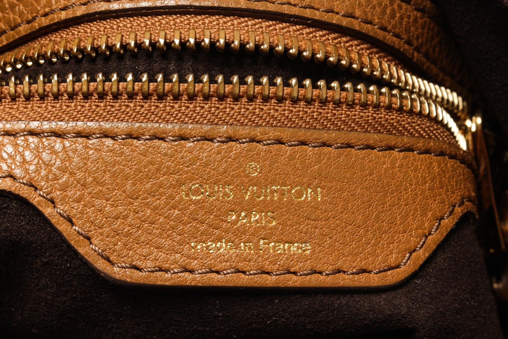 One Louis Vuitton Brown Monogram Mahina Leather Surya L Shoulder Bag. Item is sold AS-IS. All available information is listed in the description and shown in the photo. louis vuitton brown monogram mahina leather surya l shoulder bag with it features top handles and a flap with a push-lock closure that leads to an alcantara-lined interior. the bag is finished with protective metal feet and gold-tone hardware. Height: 10.24" Width: 5.91" Depth: 13.39", Handle Drop: / 26 x 15 x 34 Cm