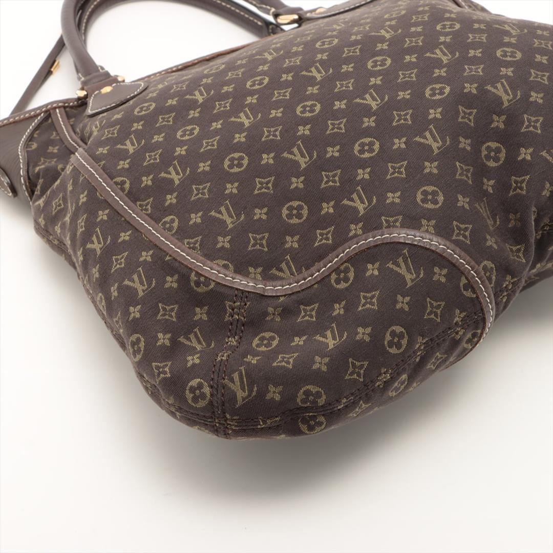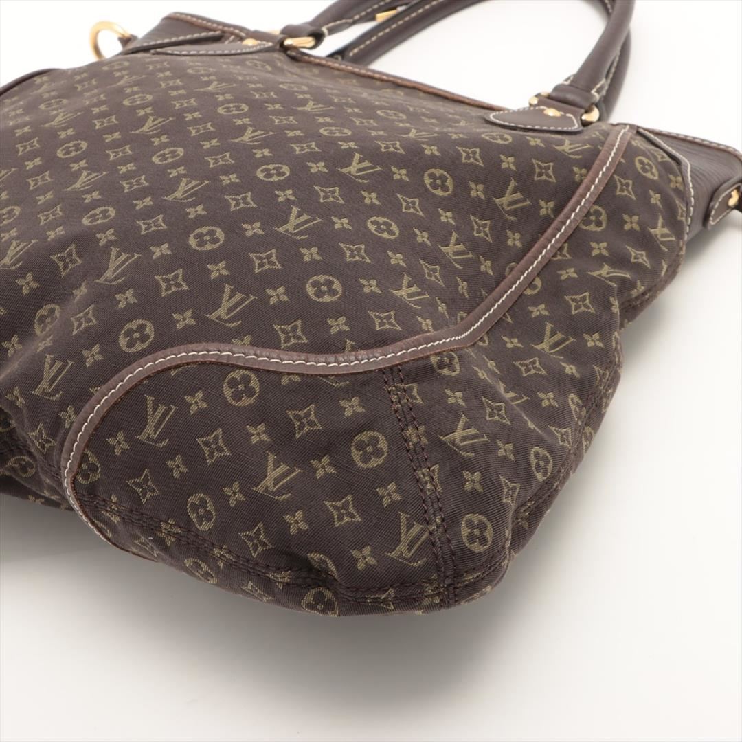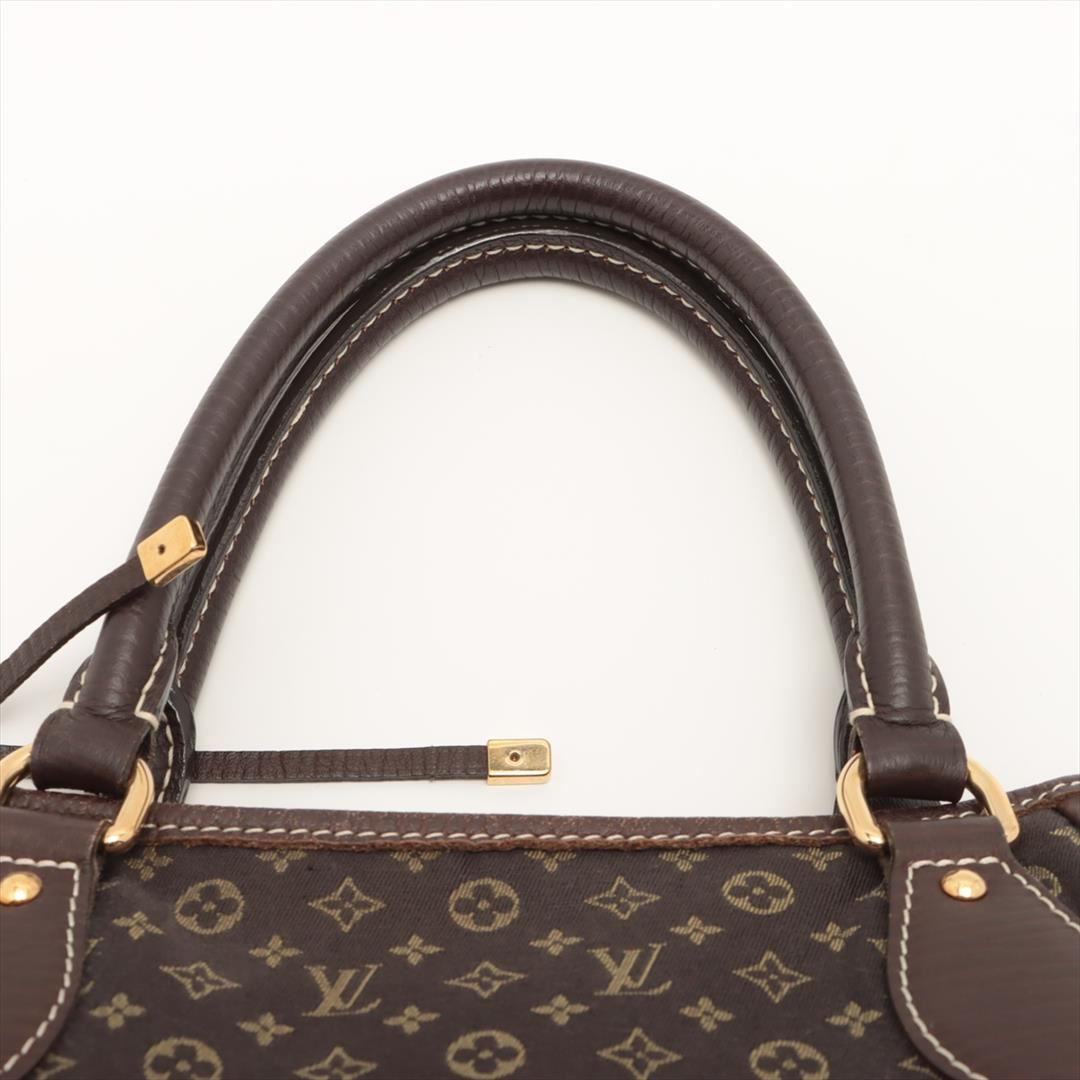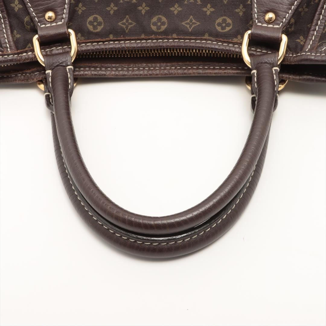 Brown monogram Mini Lin canvas Louis Vuitton Besace Angele shoulder bag with gold-tone hardware, dark brown leather trim, dual rolled handles, an optional padded shoulder strap, dark brown canvas lining & dual interior pockets and zip closure at top. L