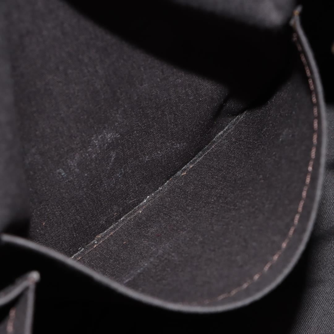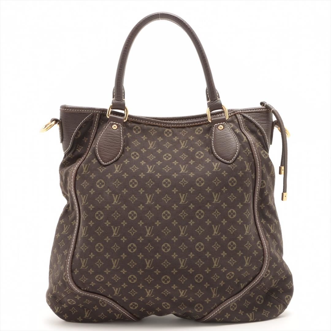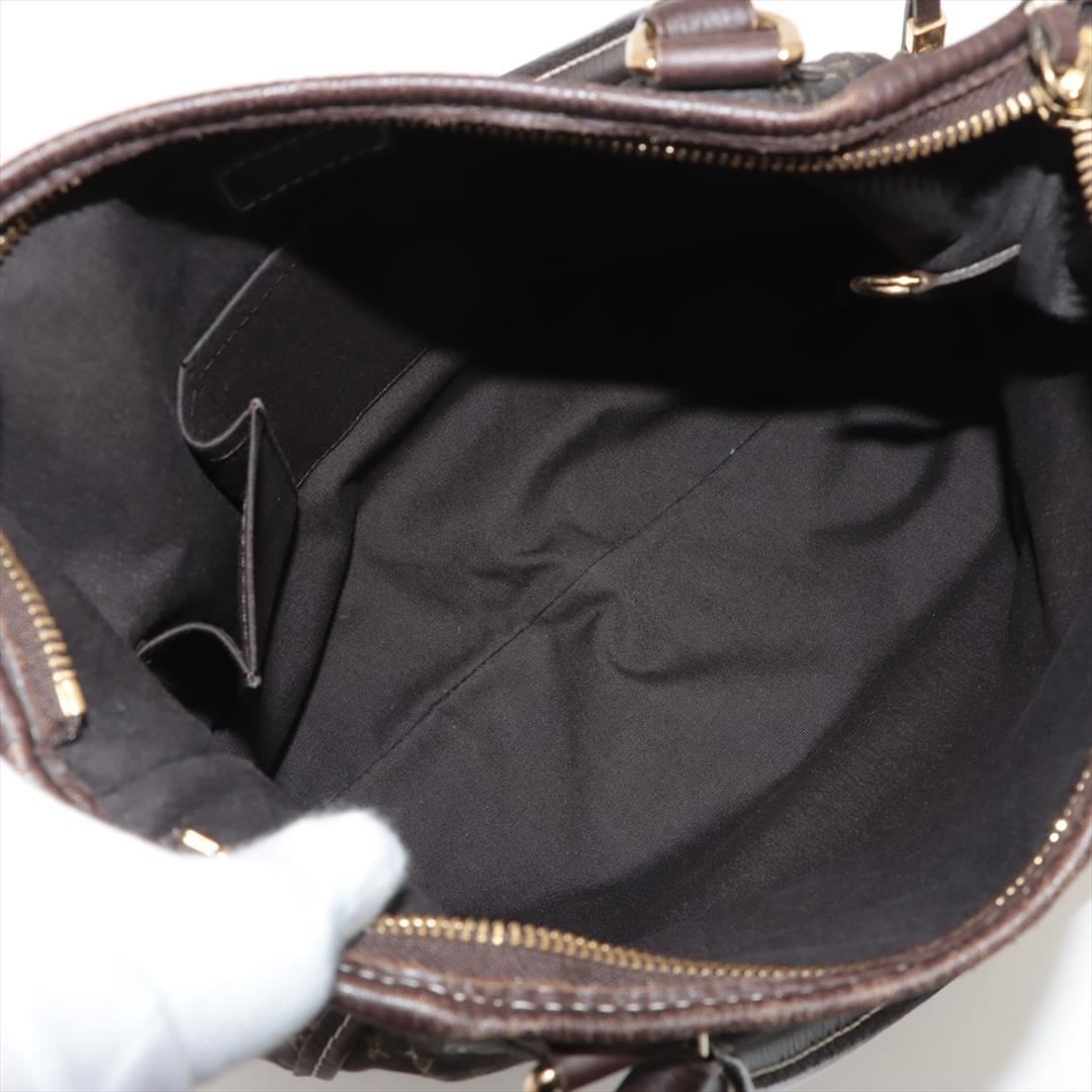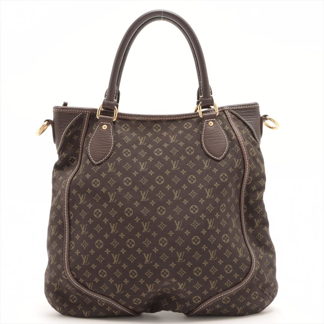 Brown monogram Mini Lin canvas Louis Vuitton Besace Angele shoulder bag with gold-tone hardware, dark brown leather trim, dual rolled handles, an optional padded shoulder strap, dark brown canvas lining & dual interior pockets and zip closure at top. L