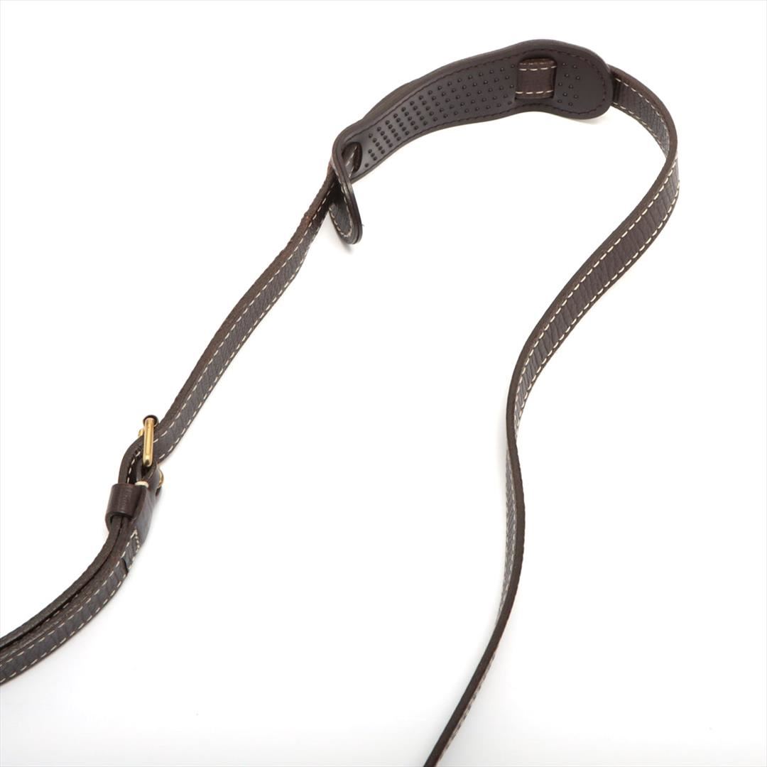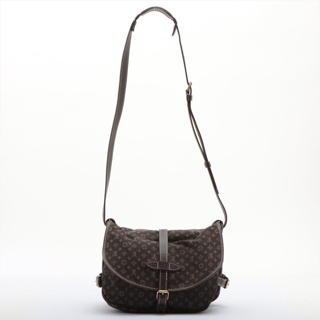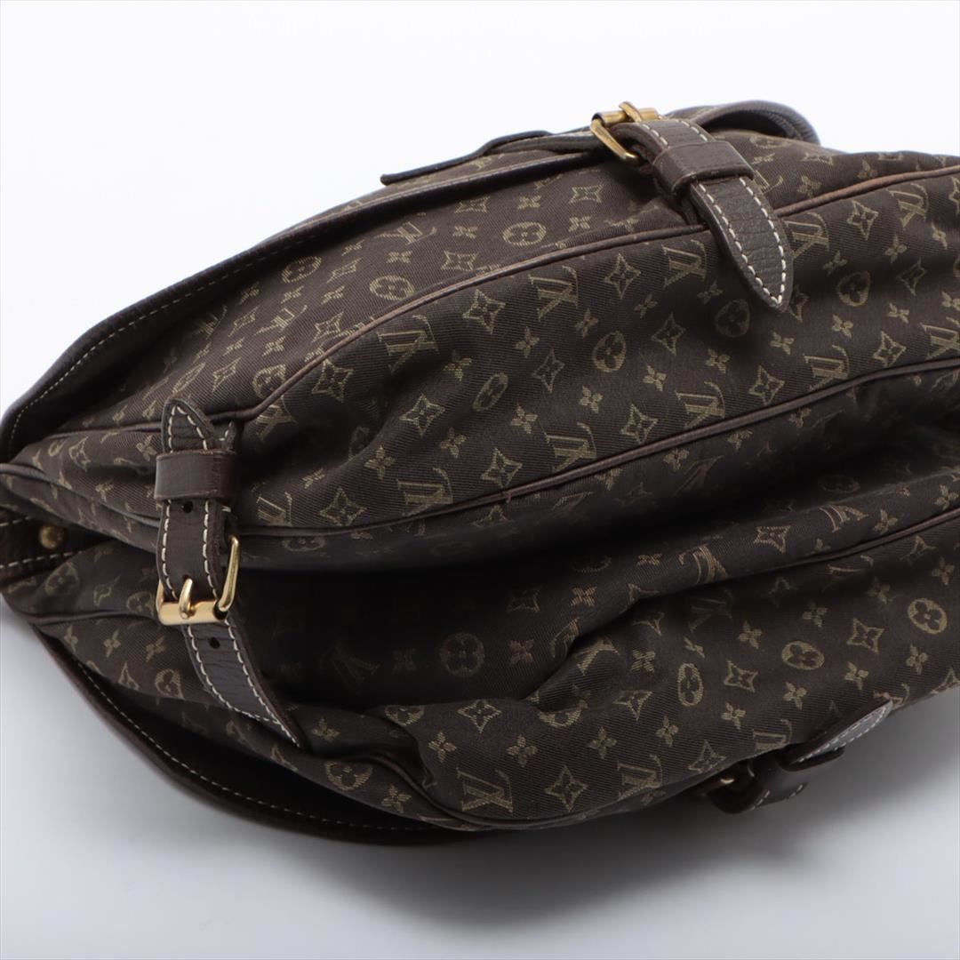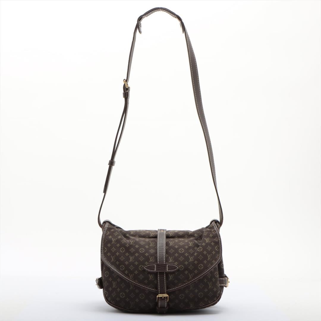 Brown Mini Lin canvas of Louis Vuitton SaumurCrossbody Bag features gold-tone hardware, tonal leather accents with white contrast stitching, single flat shoulder strap with buckle adjustment, dual compartments, brown canvas lining, single interior slit po