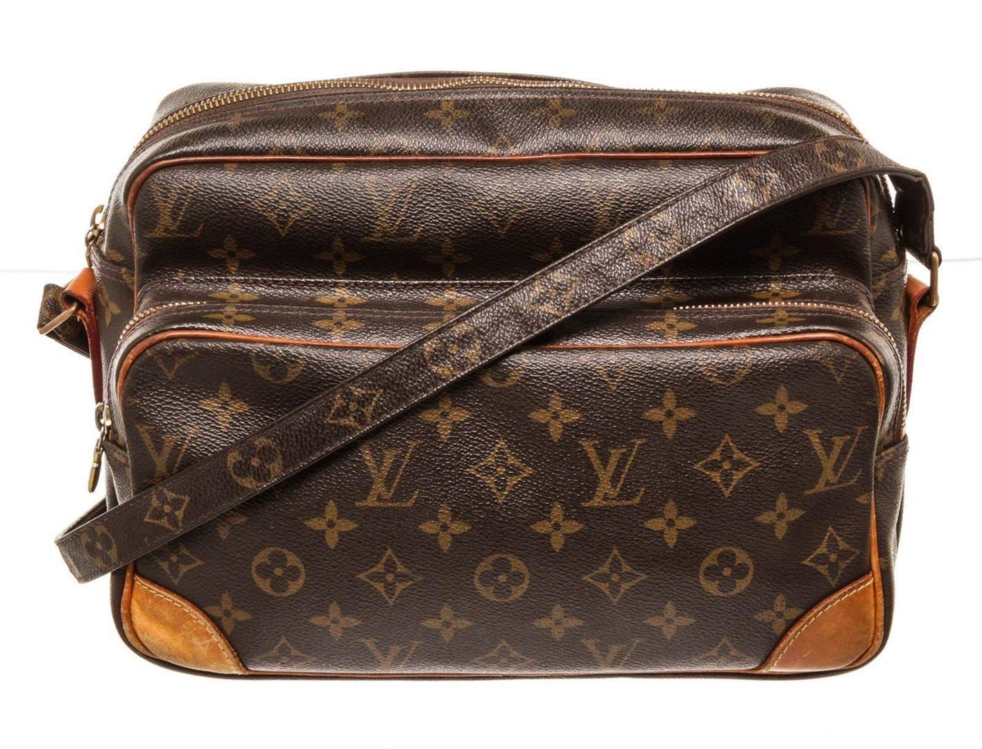 Louis Vuitton Brown Monogram Nile Crossbody Bag with material monogram canvas, gold-tone hardware, tan vachetta leather trim, exterior zip pockets, interior zip pockets, leather lining, leather shoulder strap, and zip closure.