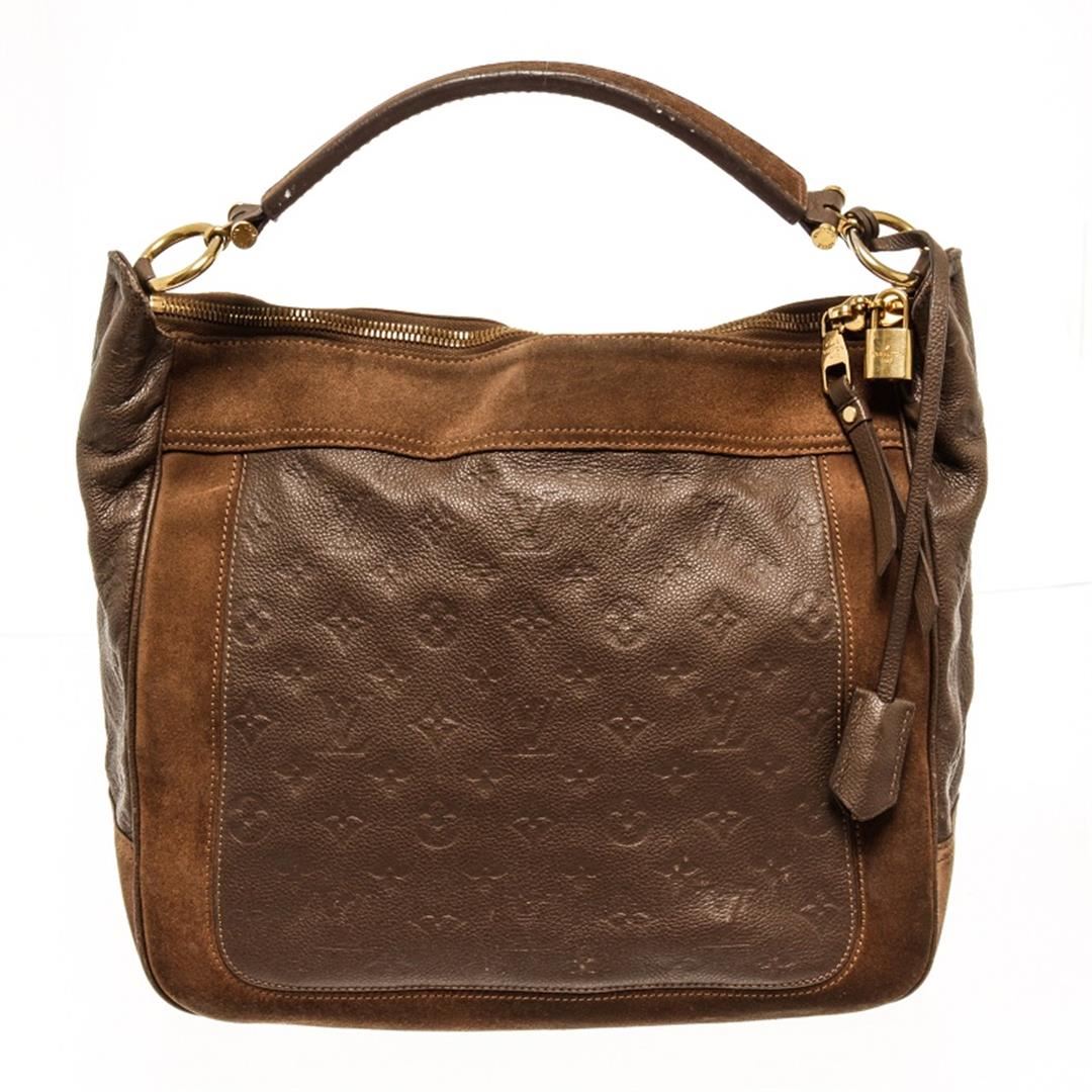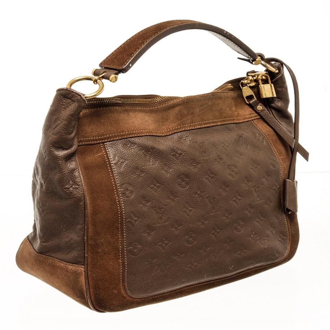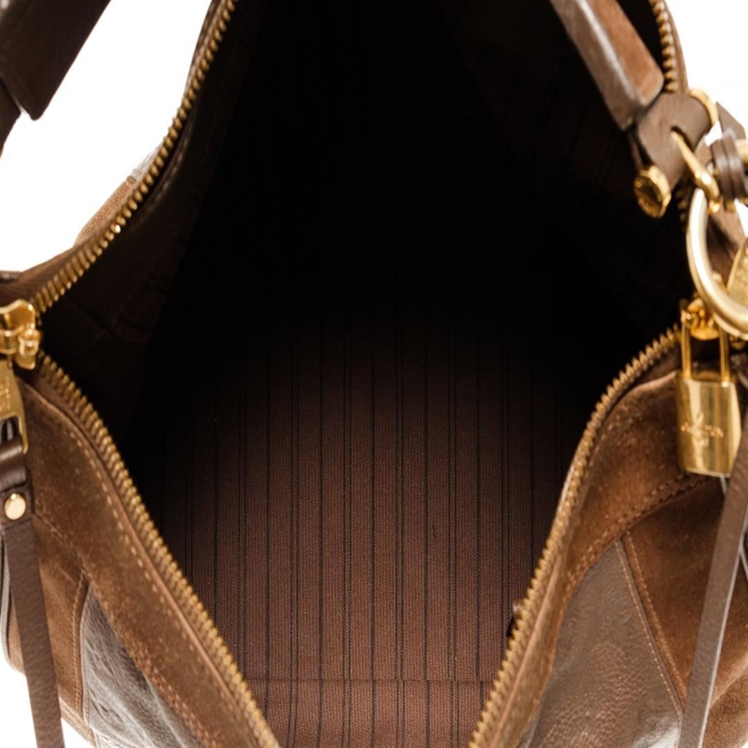 One Louis Vuitton Brown Monogram Odesius Hobo Bag. Item is sold AS-IS. All available information is listed in the description and shown in the photo. Louis Vuitton brown monogram Odesius hobo bag with leather and suede exterior, gold-tone hardware, two flat pockets, one zip pocket, flat leather shoulder strap and a removable, adjustable shoulder strap, two-way zip closure, fine Louis Vuitton striped textile lining. Height: 12" Width: 5.5" Depth: 14", Handle Drop: / 30.48 x 13.97 x 35.56 Cm