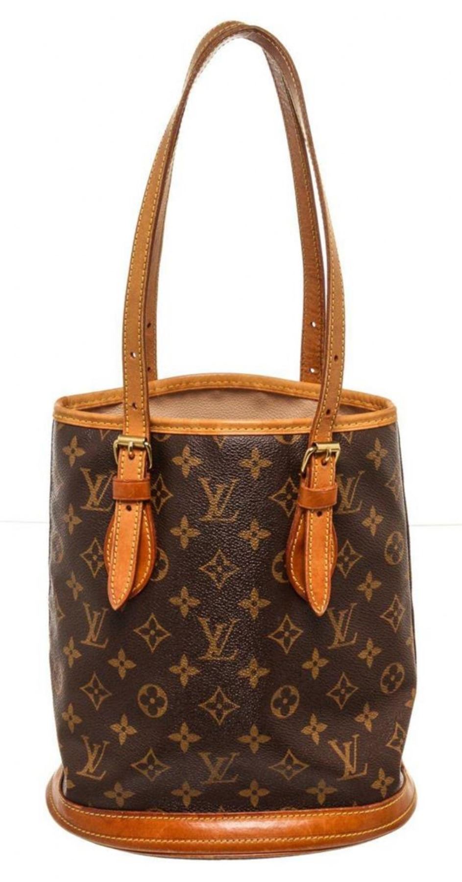 Louis Vuitton Brown Monogram PM Bucket Bag. Louis Vuitton Brown Monogram PM Bucket Bag with material monogram canvas, gold-tone hardware, trim tan vachetta leather, interior zip pocket, shoulder strap and flap closure.