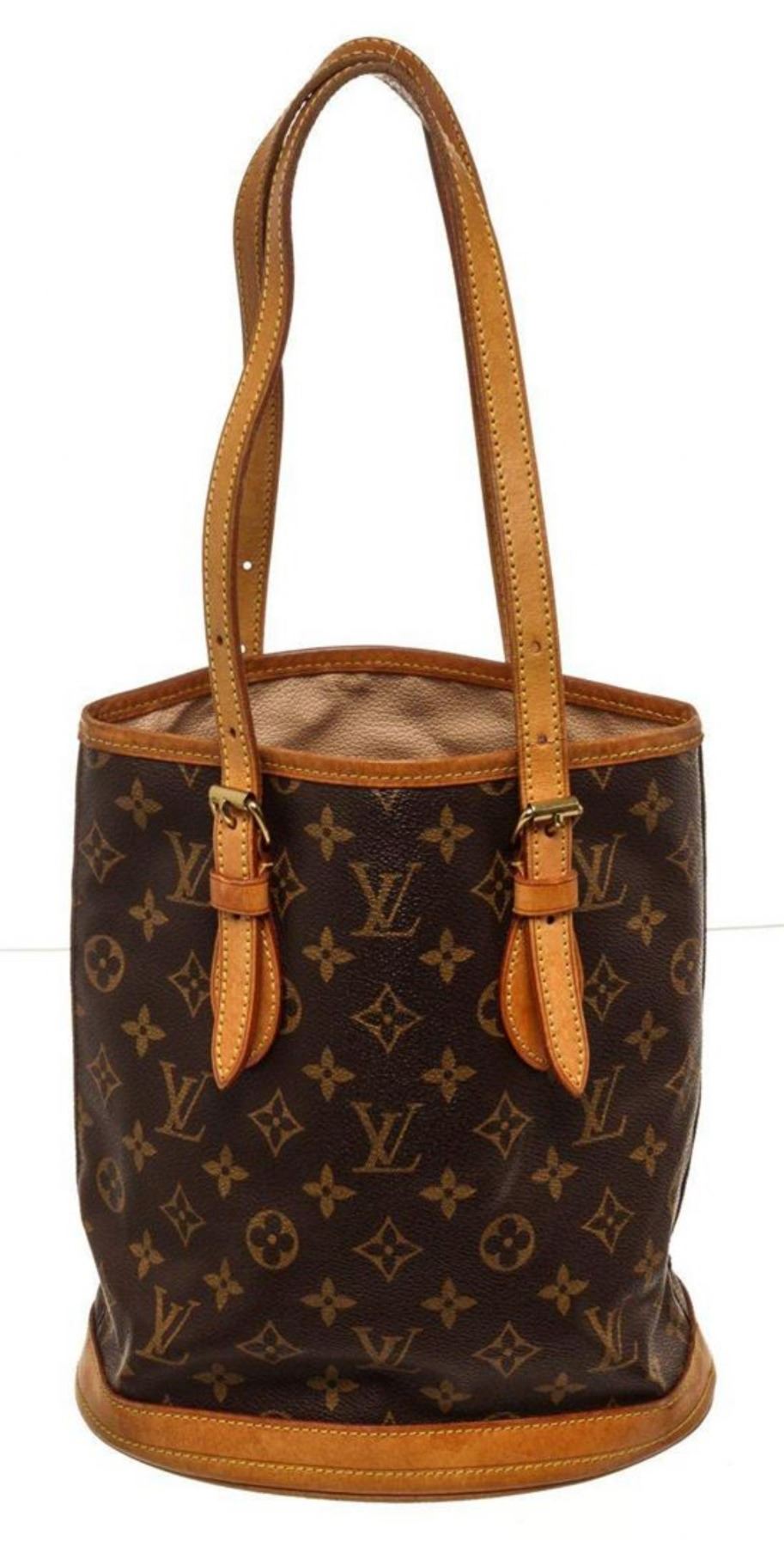 Louis Vuitton Brown Monogram PM Bucket Bag. Louis Vuitton Brown Monogram PM Bucket Bag with material monogram canvas, gold-tone hardware, trim tan vachetta leather, interior zip pocket, shoulder strap and flap closure.
