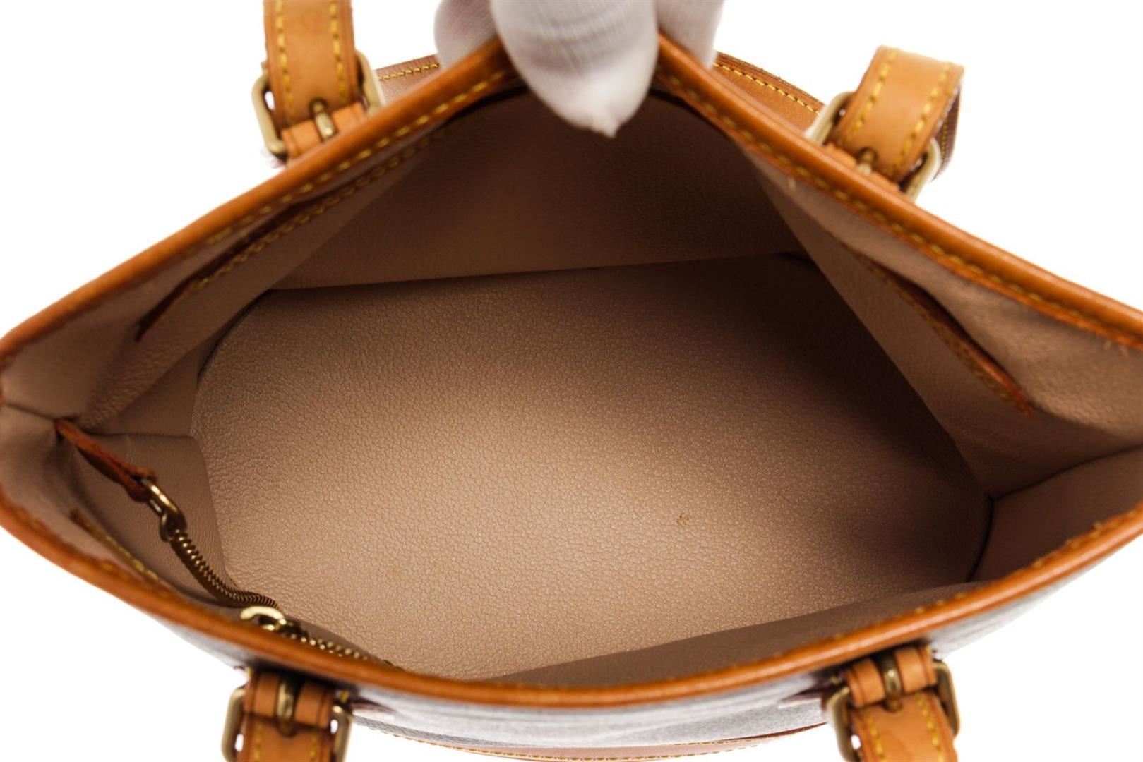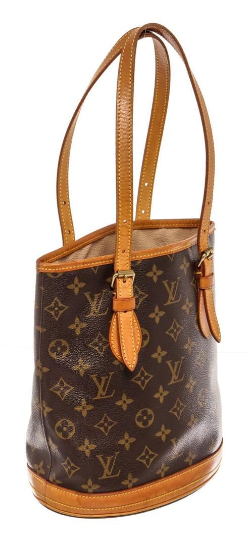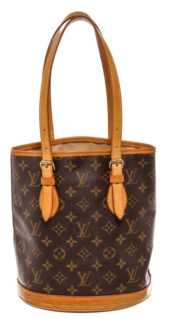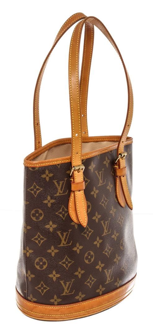 Louis Vuitton Brown Monogram PM Bucket Bag with monogram canvas, gold-tone hardware, trim tan vachetta leather, interior zip pocket, shoulder strap and flap closure.