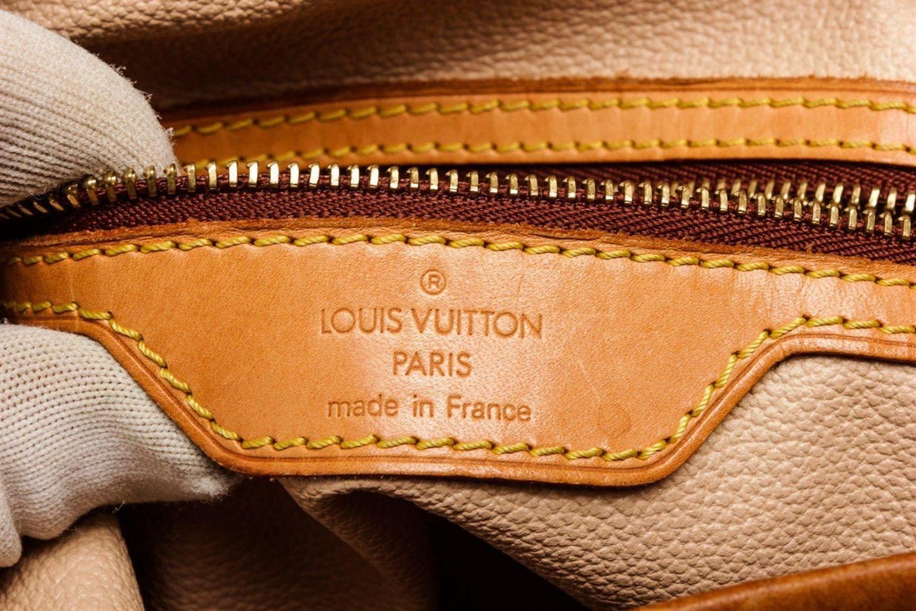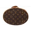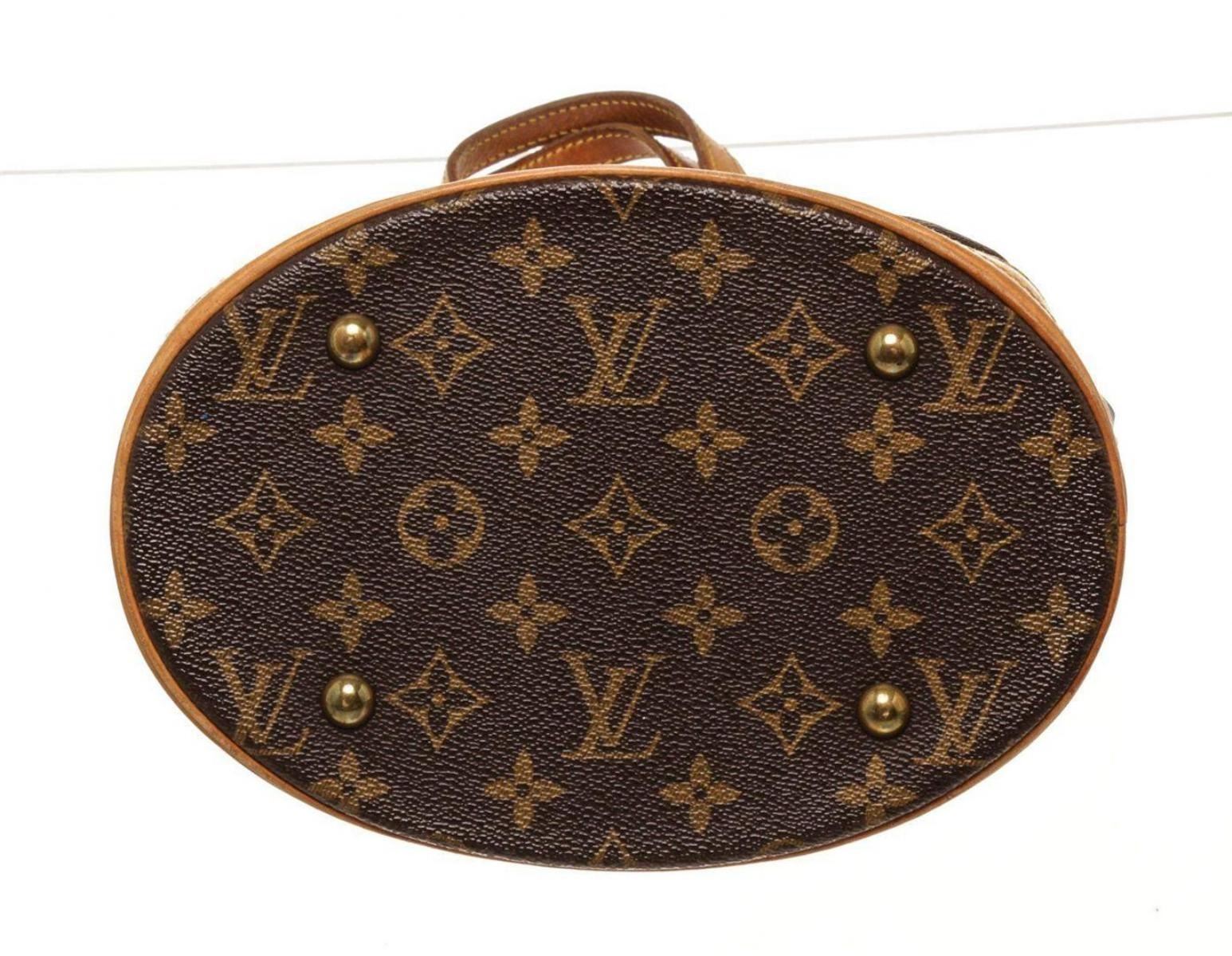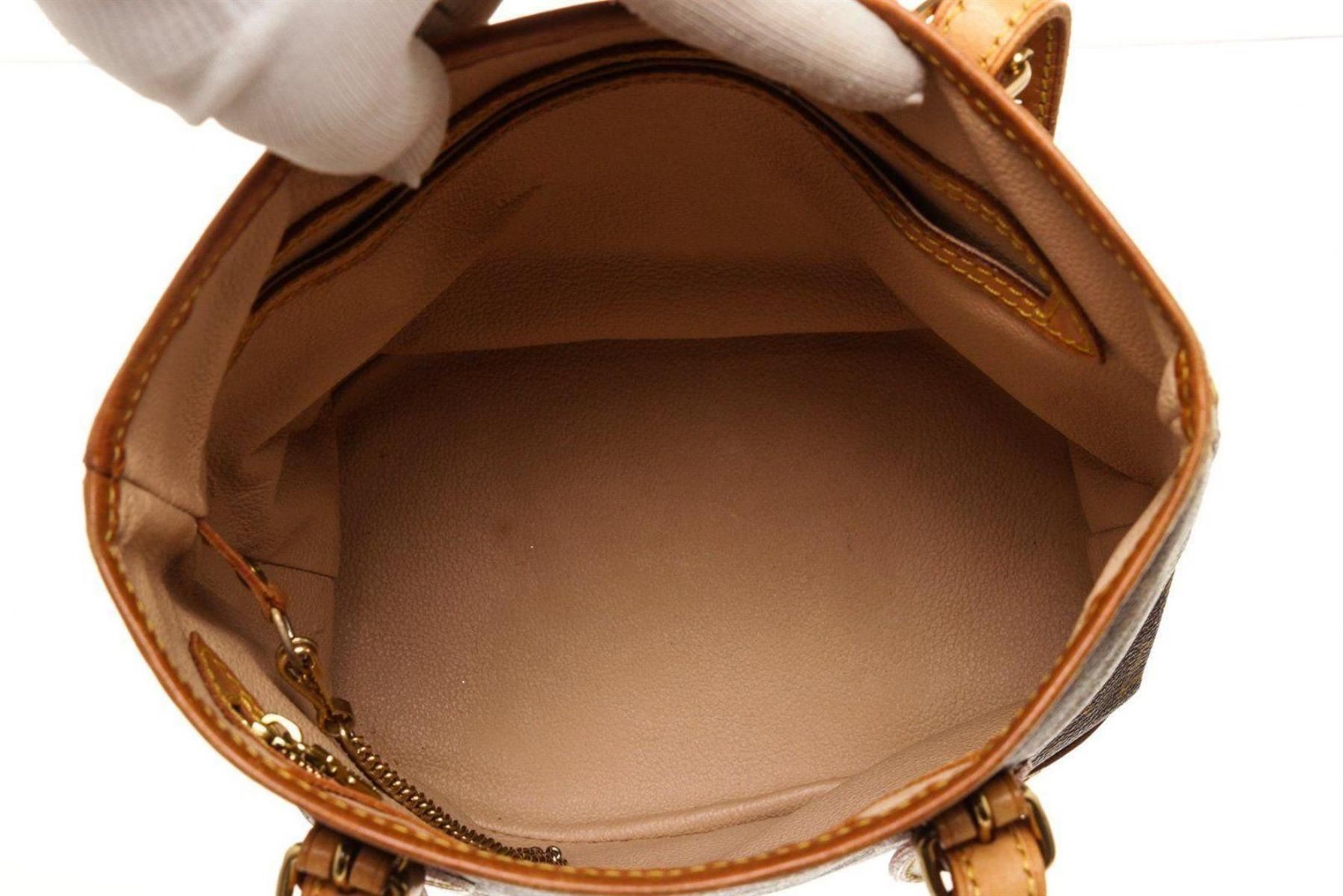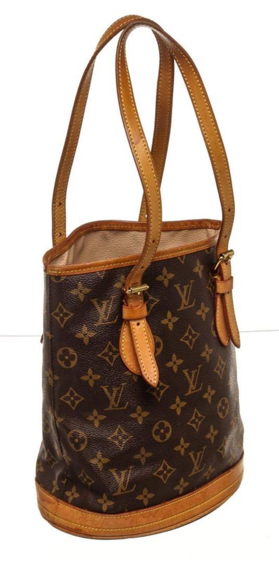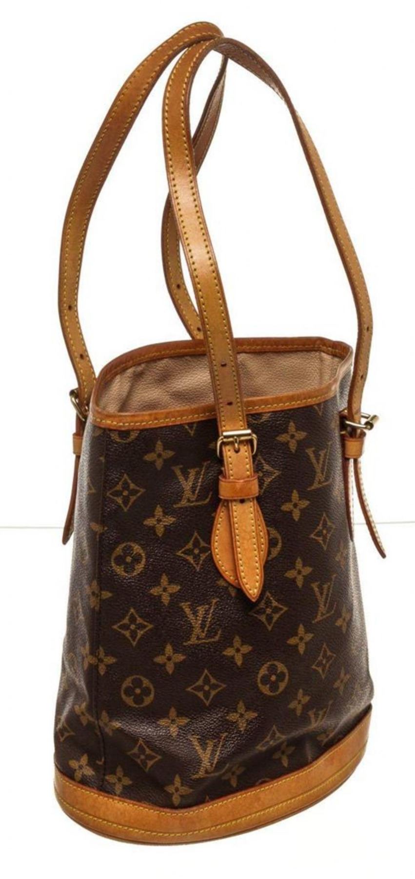 Louis Vuitton Brown Monogram PM Bucket Bag with material monogram canvas, gold-tone hardware, trim tan vachetta leather, interior zip pocket, shoulder strap and flap closure.