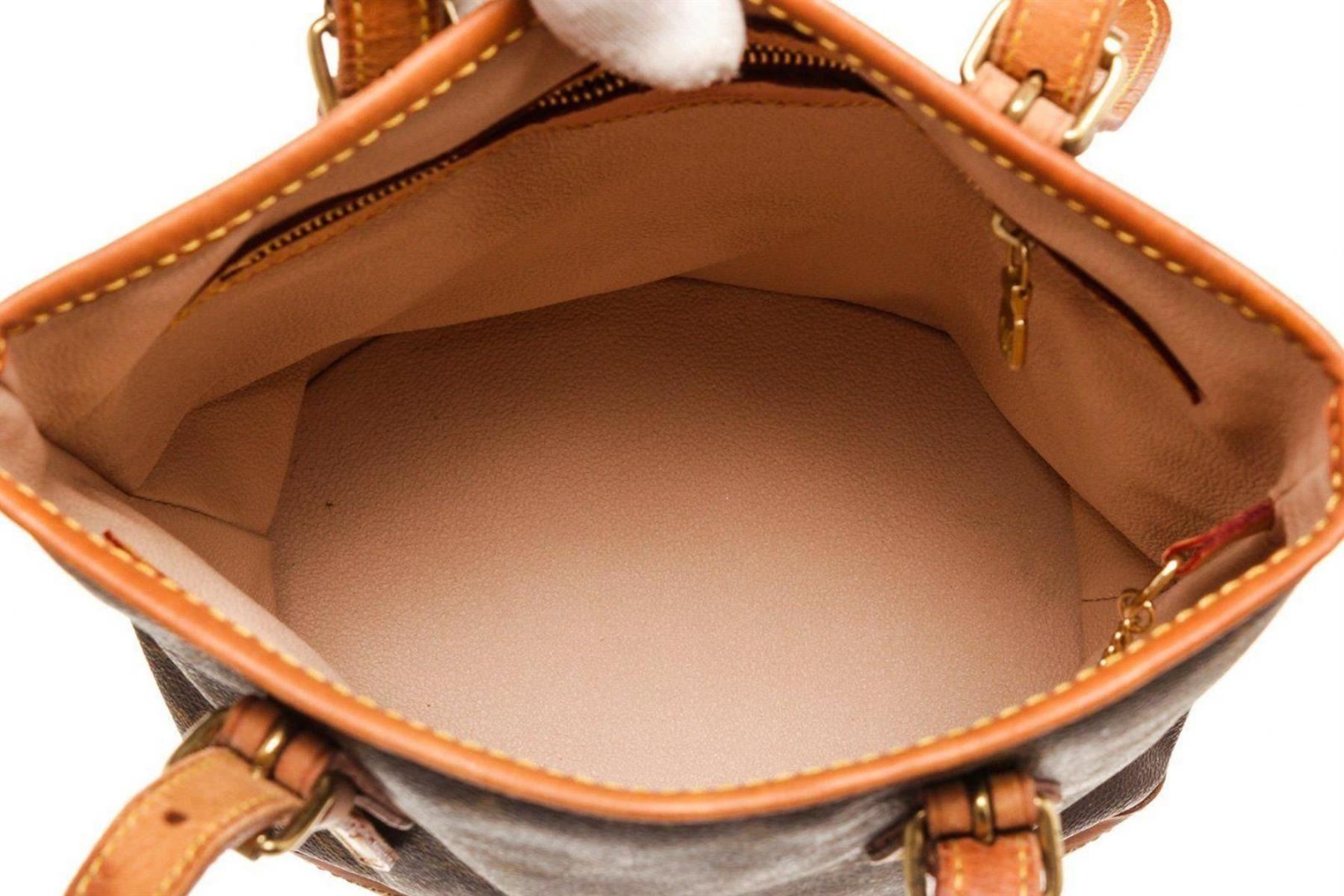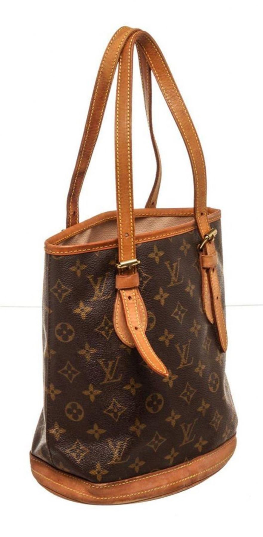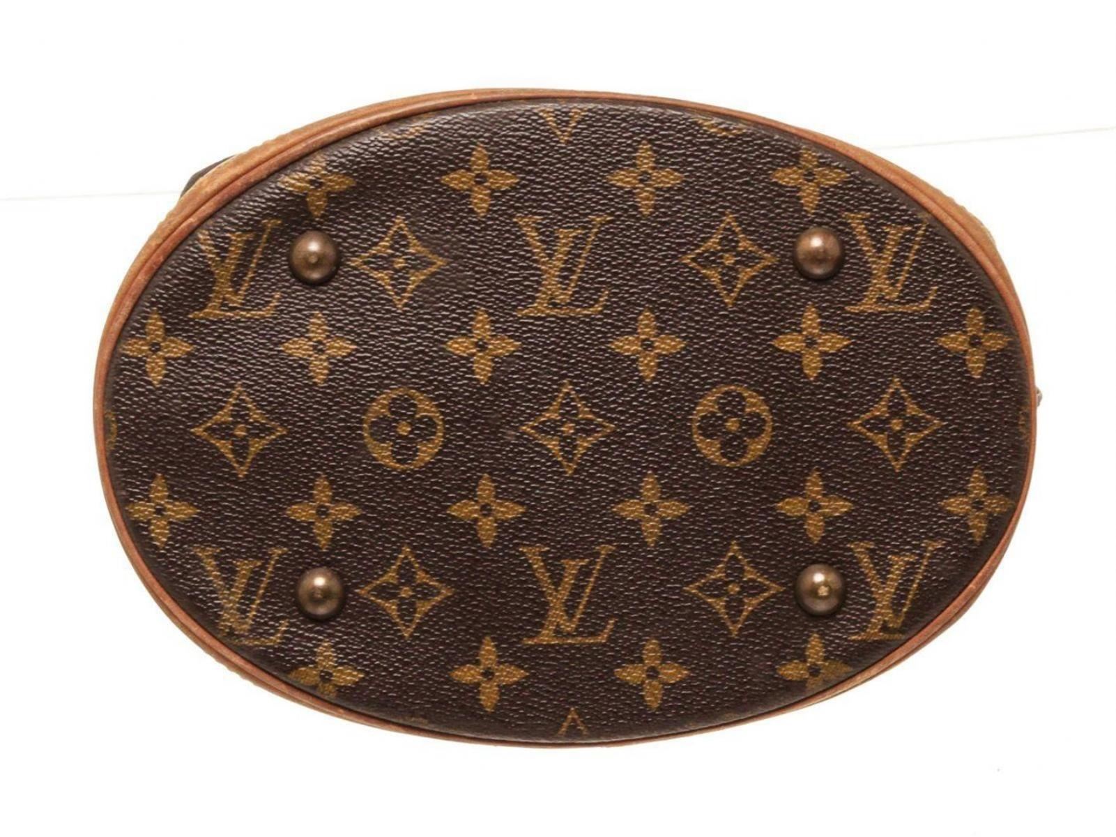 Louis Vuitton Brown Monogram PM Bucket Bag with material monogram canvas, gold-tone hardware, trim tan vachetta leather, interior zip pocket, shoulder strap and flap closure.