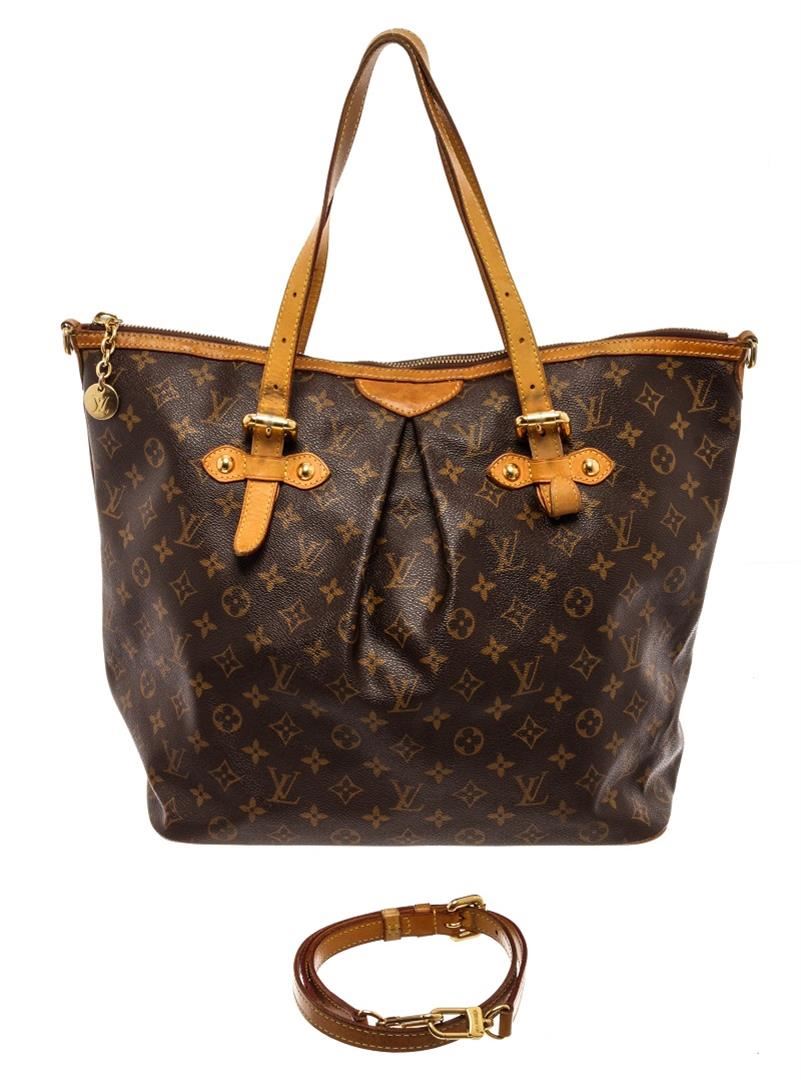Louis Vuitton Brown Monogram Palermo GM Tote Bag. All available information is listed in the description and shown in the photos. Louis Vuitton Brown Monogram Palermo GM Tote Bag with brown coated canvas, brass hardware, dual adjustable shoulder straps, leather trim embellishment, canvas lining & three interior pockets, zip closure at top. Height: 13" Width: 14" Depth: 7.5", Shoulder Strap Drop: 10" / 33.02 x 35.56 x 19.05 Cm