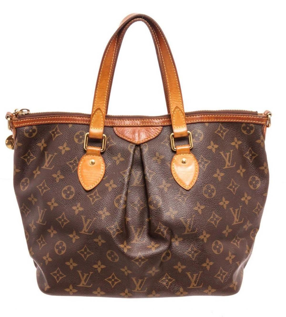 Louis Vuitton Brown Monogram Palermo PM Tote Bag. Louis Vuitton Brown Monogram Palermo PM Tote Bag with gold-tone hardware, tan vachetta leather trim, interior slip pockets, dual top handle, adjustable shoulder strap, and zipper closure. MEASUREMENTS: