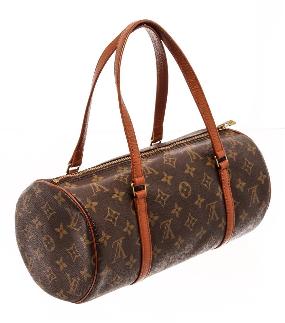 Louis Vuitton Brown Monogram Papillon 30 Shoulder Bag. All available information is listed in the description and shown in the photos. Louis Vuitton Brown Monogram Papillon 30 Shoulder Bag with brown, printed, brass hardware, dual shoulder straps, leather trim embellishment, leather lining, zip closure at top Height: 8.5" Width: 11.25" Depth: 5.25" Shoulder Strap Drop: 6.75" / Height: 21.59" Width: 28.57" Depth: 13.33" Shoulder Strap Drop: 17.14"