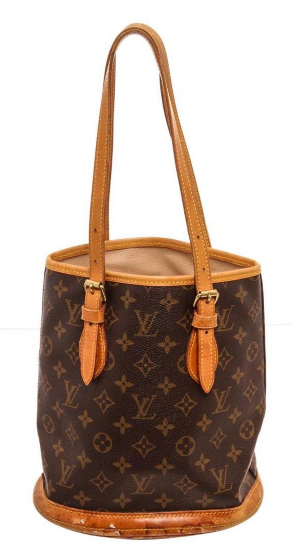 Louis Vuitton Brown Monogram Petit Bucket Bag. Louis Vuitton Brown Monogram Petit Bucket Bag with material monogram canvas, gold-tone hardware, trim tan vachetta leather, interior zip pocket, shoulder strap and snap closure. MEASUREMENTS: Length 10 i