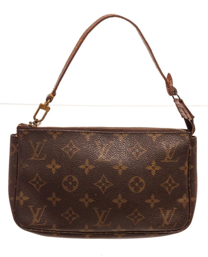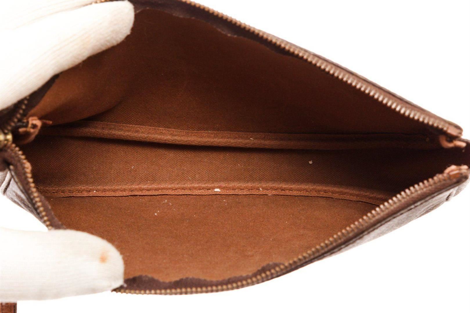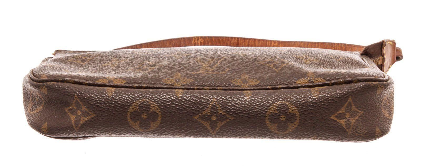 Louis Vuitton Brown Monogram Pochette Clutch Bag with material monogram canvas, gold-tone hardware, trim tan vachetta leather, interior slip pocket, shoulder strap and zipper closure. MEASUREMENTS: Length 4.75 in / 12 cm Width 8.5 in / 22 cm Height 1.25 in / 3 cm Condition: Pre-Owned Good overall, please see photographs for detail.