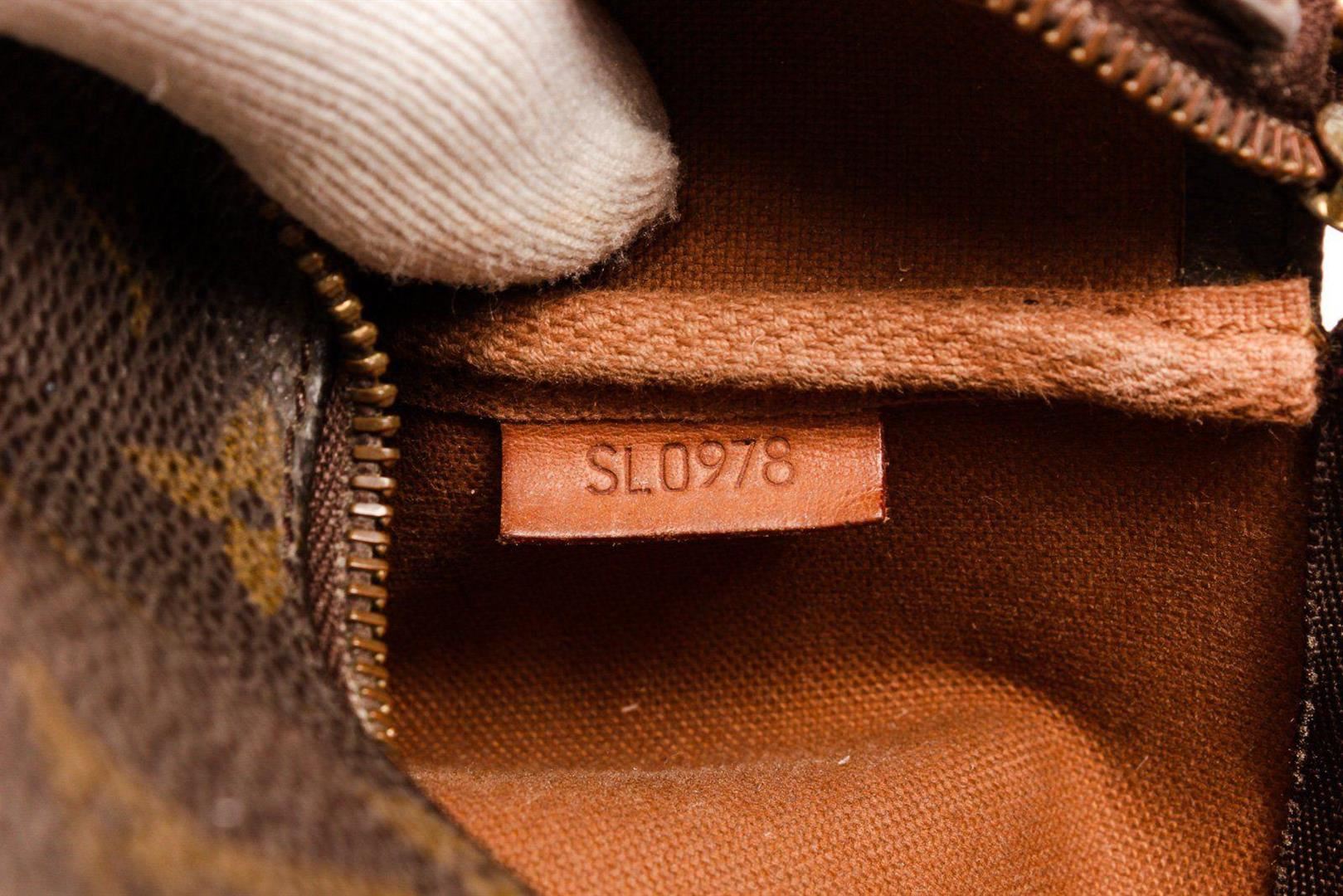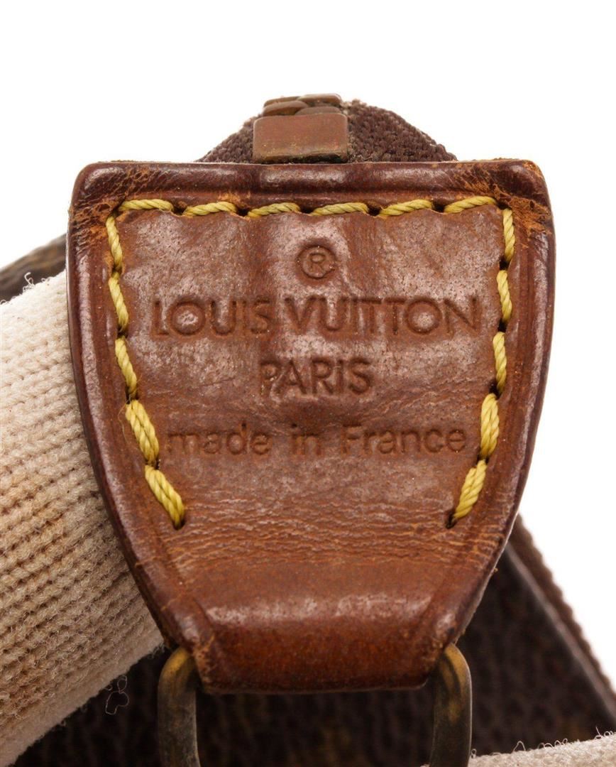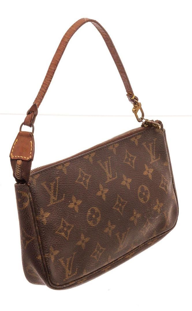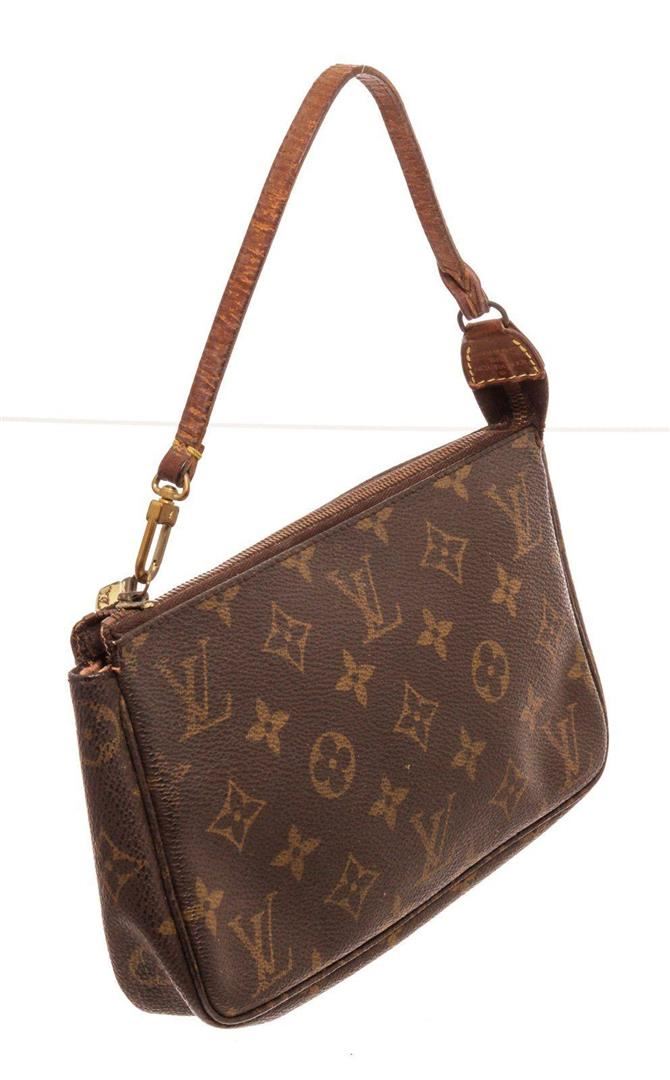 Louis Vuitton Brown Monogram Pochette Clutch Bag with material monogram canvas, gold-tone hardware, trim tan vachetta leather, interior slip pocket, shoulder strap and zipper closure. MEASUREMENTS: Length 4.75 in / 12 cm Width 8.5 in / 22 cm Height 1.25 in / 3 cm Condition: Pre-Owned Good overall, please see photographs for detail.