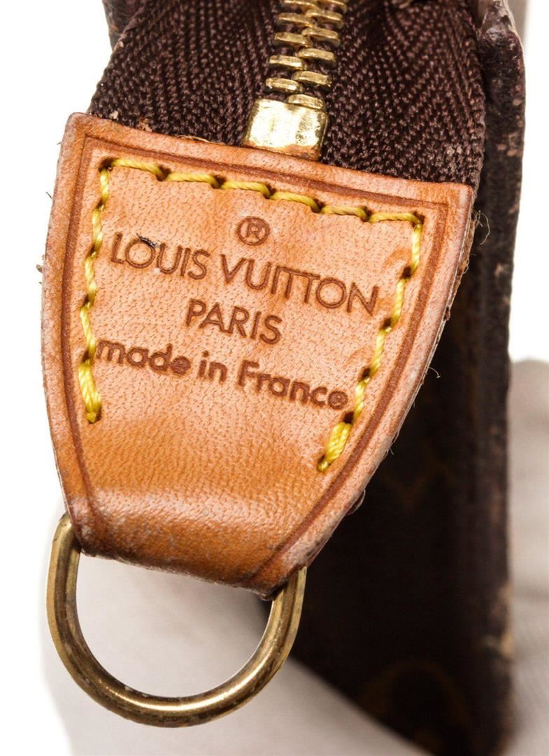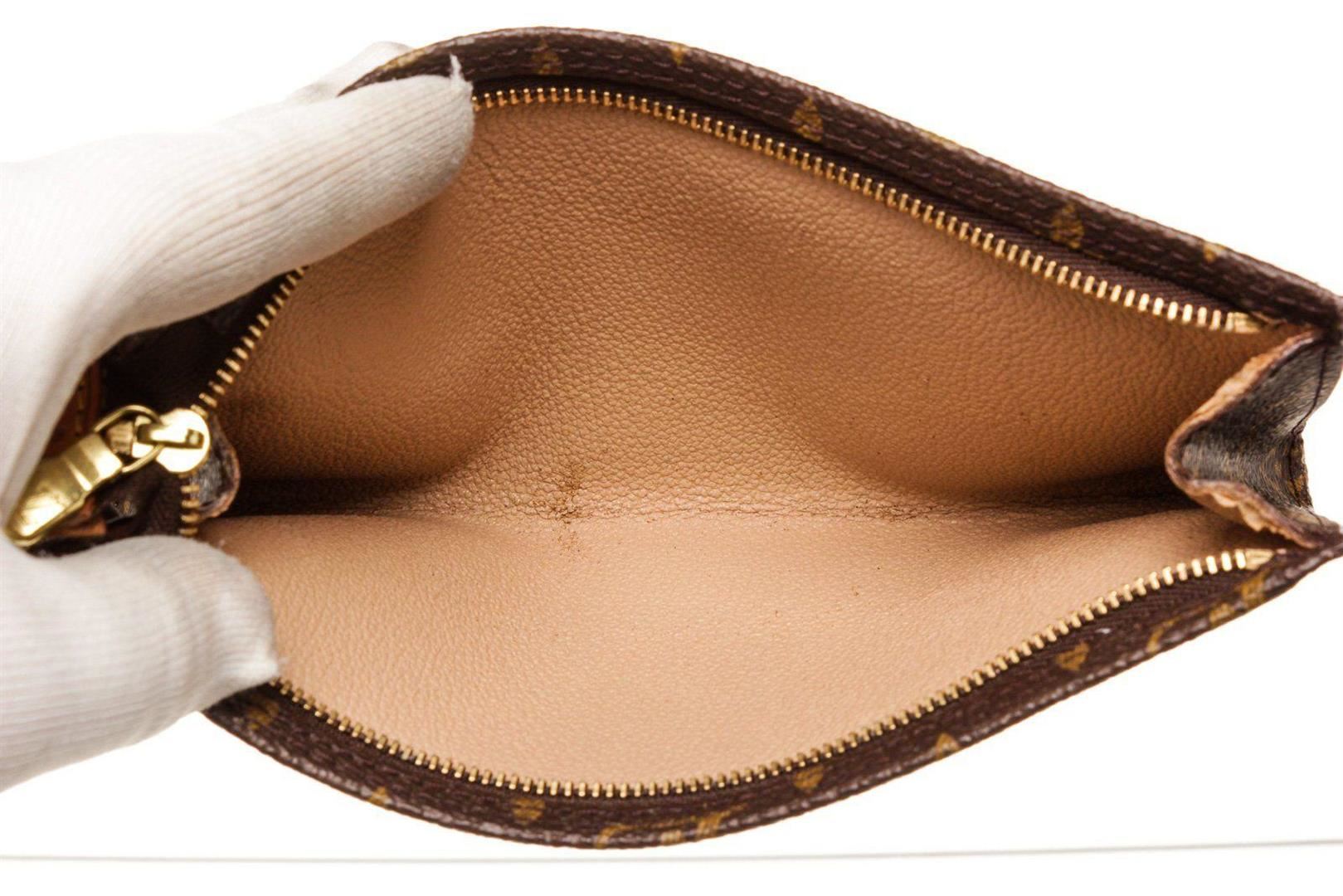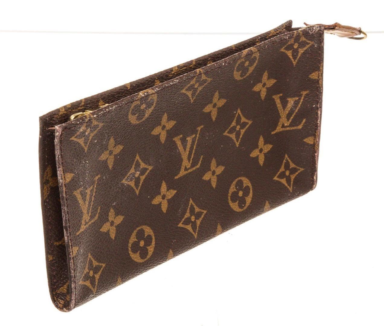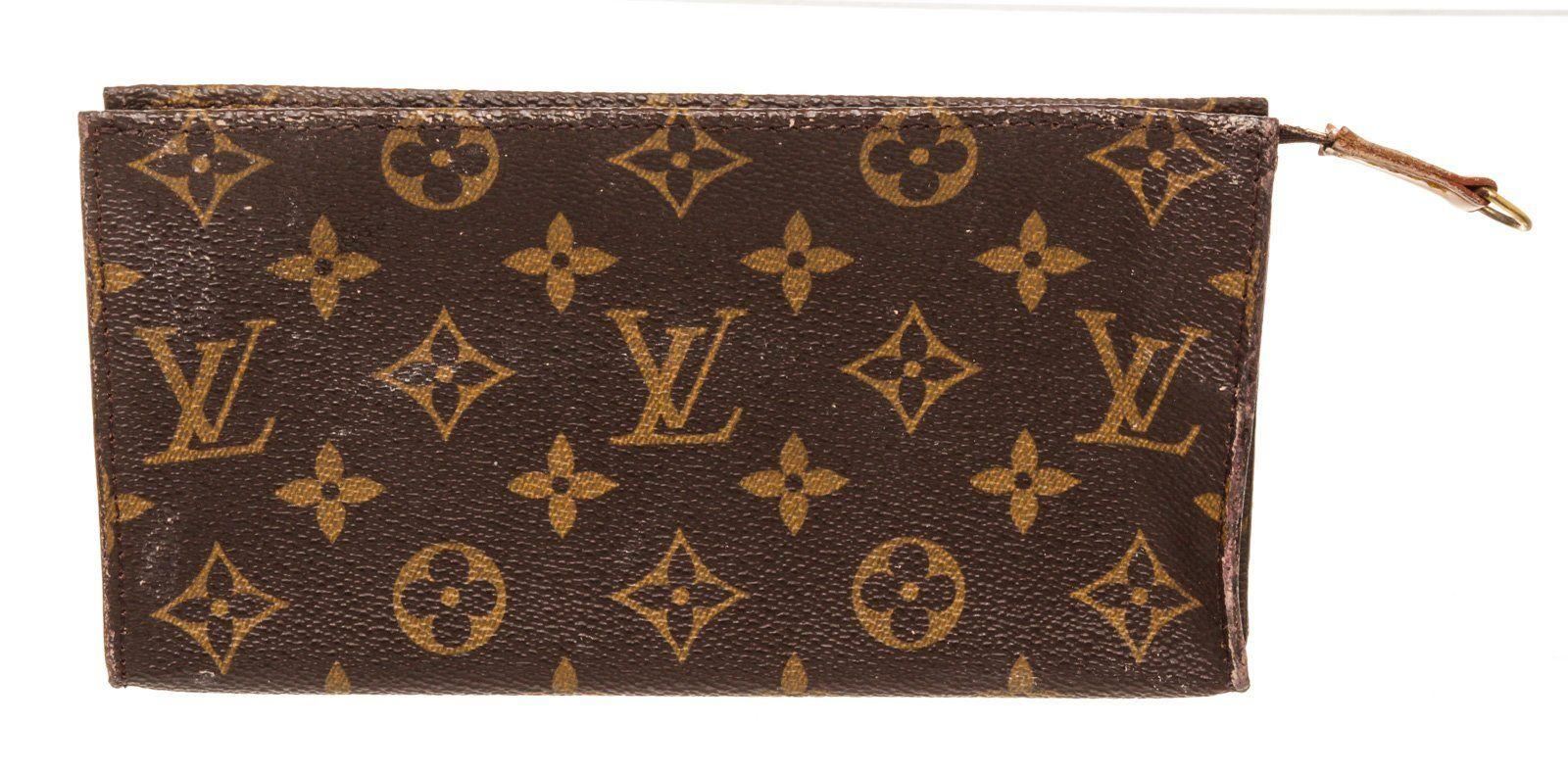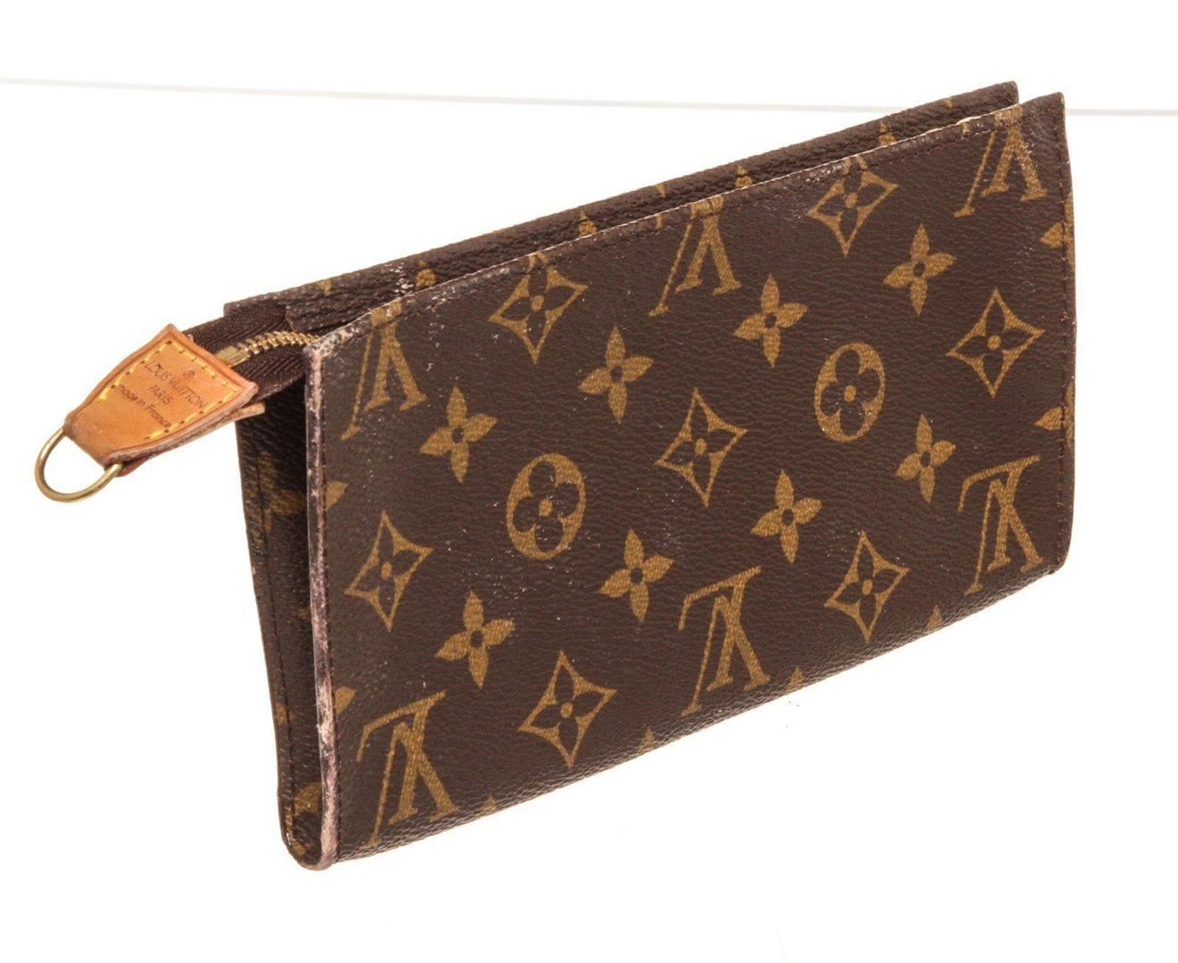 Louis Vuitton Brown Monogram Pouch Wallet with material monogram canvas, gold-tone hardware, trim tan vachetta leather and zipper closure.