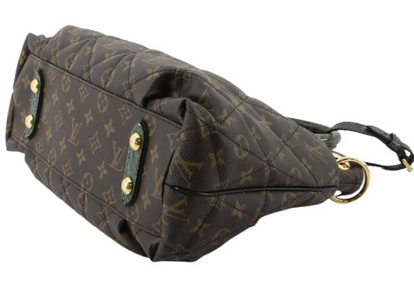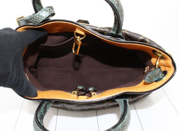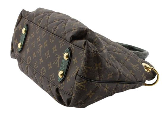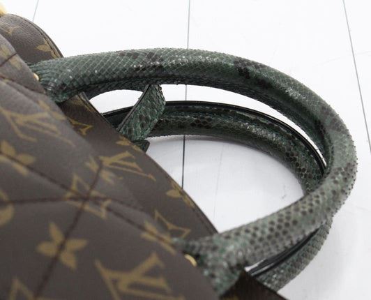 Brown and tan quilted monogram coated canvas Louis Vuitton Etoile Exotique MM 2Way bag with gold-tone hardware, dark green python and black leather trim, dual rolled top handles, single detachable shoulder strap with buckle adjustment, single exterior pocket with turn-lock closure, protective feet at base, chocolate ostrich trim at interior top, dark brown Alcantara lining, three interior zip pockets and clasp closure at top. Height: 11.5" Width: 18" Depth: 5.25" Shoulder Strap Drop: 13.5" - 15.5" Handle Drop: 3.5"
