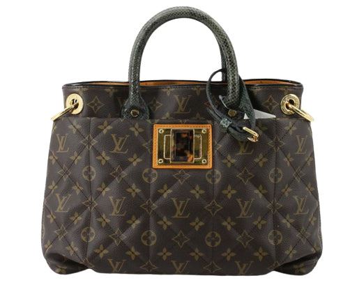 Brown and tan quilted monogram coated canvas Louis Vuitton Etoile Exotique MM 2Way bag with gold-tone hardware, dark green python and black leather trim, dual rolled top handles, single detachable shoulder strap with buckle adjustment, single exterior pocket with turn-lock closure, protective feet at base, chocolate ostrich trim at interior top, dark brown Alcantara lining, three interior zip pockets and clasp closure at top. Height: 11.5" Width: 18" Depth: 5.25" Shoulder Strap Drop: 13.5" - 15.5" Handle Drop: 3.5"
