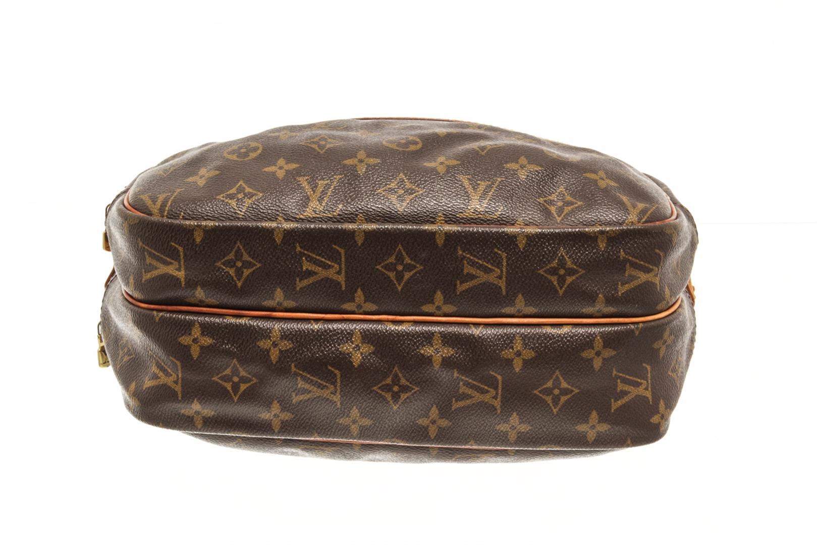 One Louis Vuitton Brown Monogram Reporter PM Crossbody Bag. Item is sold AS-IS. All available information is listed in the description and shown in the photo. louis vuitton brown monogram reporter pm crossbody bag with the reporter pm features a monogram canvas body with leather trim, an exterior front slip pocket, an adjustable flat strap, double compartments with top zip closures, and interior slip pockets. Height: 7.1" Width: 10.6" Depth: 4.7", Handle Drop: 5" / 18.03 x 26.92 x 11.93 Cm